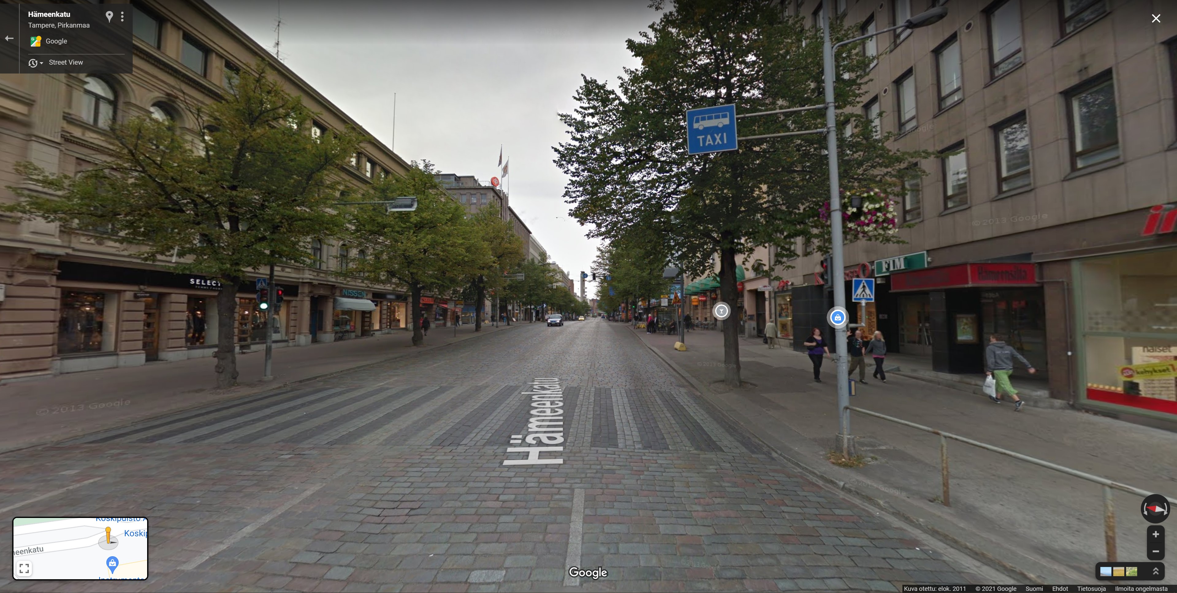 22. Хямеэнкату до реконструкции — эта улица, конечно, изменилась кардинально. Раньше она была четырехполосной, с выделенными полосами, целиком мощеная. Даже парковочные места местами были. В принципе выглядело вполне прилично, и деревья взрослые были, и пешеходные зоны широкие. Закрытие Хямеэнкату для автомобилей, конечно, многим не понравилось, тем более, помимо моста на этой улице протоку Хямеэнкоски пересекают только два других моста, плюс туннель на транзитной дороге. К сожалению, я особо не ездил по Тампере в дотрамвайные годы (да и сейчас-то по центру не езжу), так что не могу сказать, стало ли закрытие Хямеэнкату существенной проблемой для автомобилистов в итоге.