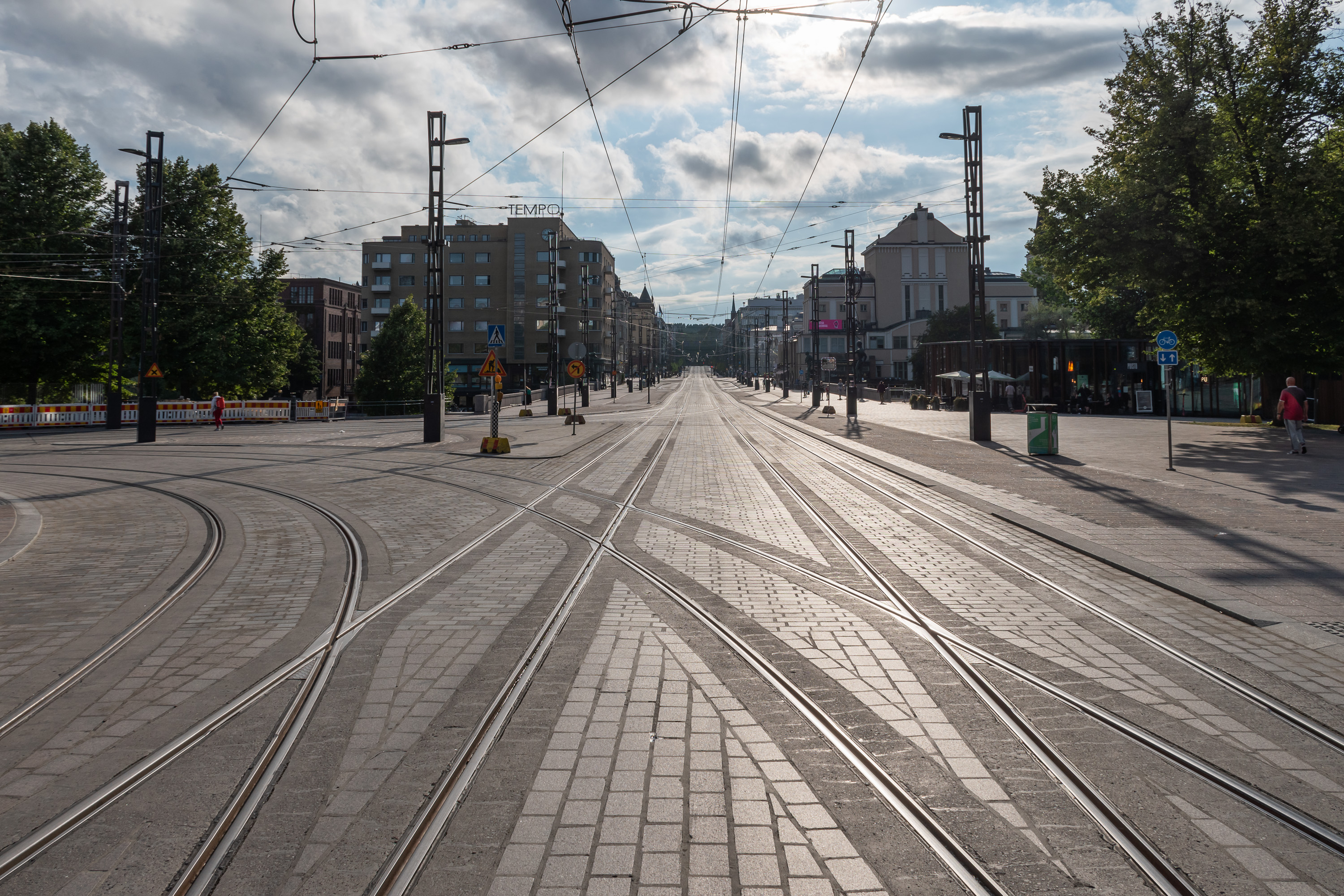29. Трамвай ныряет под вокзальными путями вниз довольно круто. Для него туннель даже пришлось углубить на полметра. От туннеля дальше на восток начинается улица Итсеняйсююденкату (Itsenäisyydenkatu, фин. улица Независимости), где теперь для автомобилей и автобусов остался только один проем туннеля, с одной полосой в каждую сторону.
