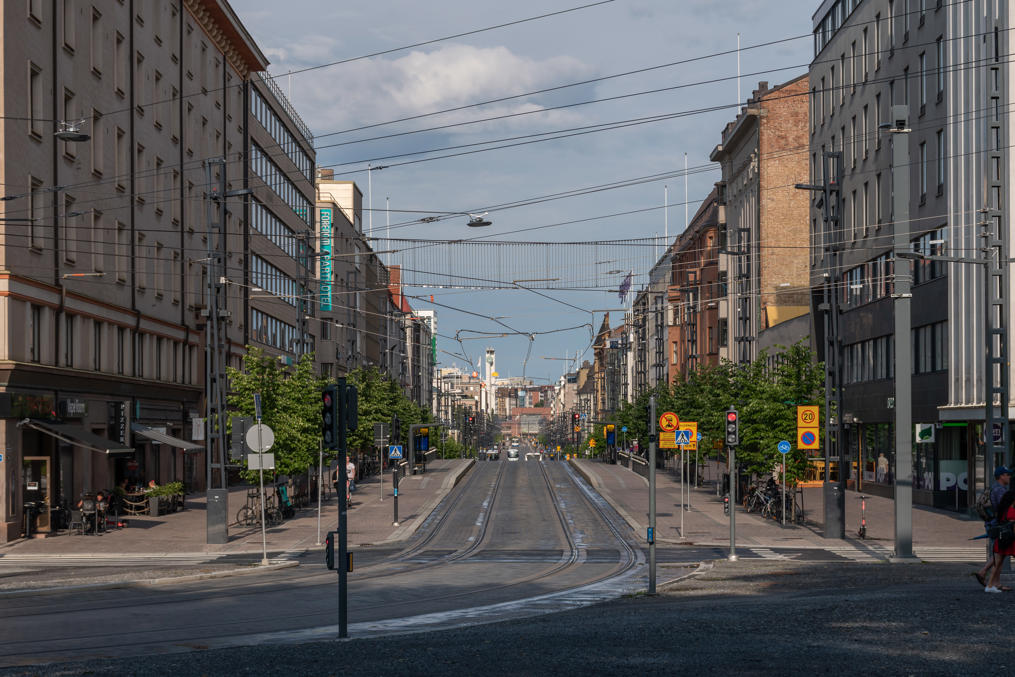 36. Саммонкату была капитально реконструирована в ходе строительства трамвая. До реконструкции она выглядела так: дорога в 1+1 полосу посередине, и отделенные от нее узкими зелеными полосами длинные парковочные карманы с обеих сторон. Такие парковочные карманы, напоминающие мне проспекты спальных районов Петербурга, для Финляндии — весьма редкое решение. Получается, реальное количество полос не уменьшилось со строительством трамвая. Но все равно для транзитного движения между центром и восточными районами на машине гораздо удобнее ехать другой параллельной дорогой, Калевантие.