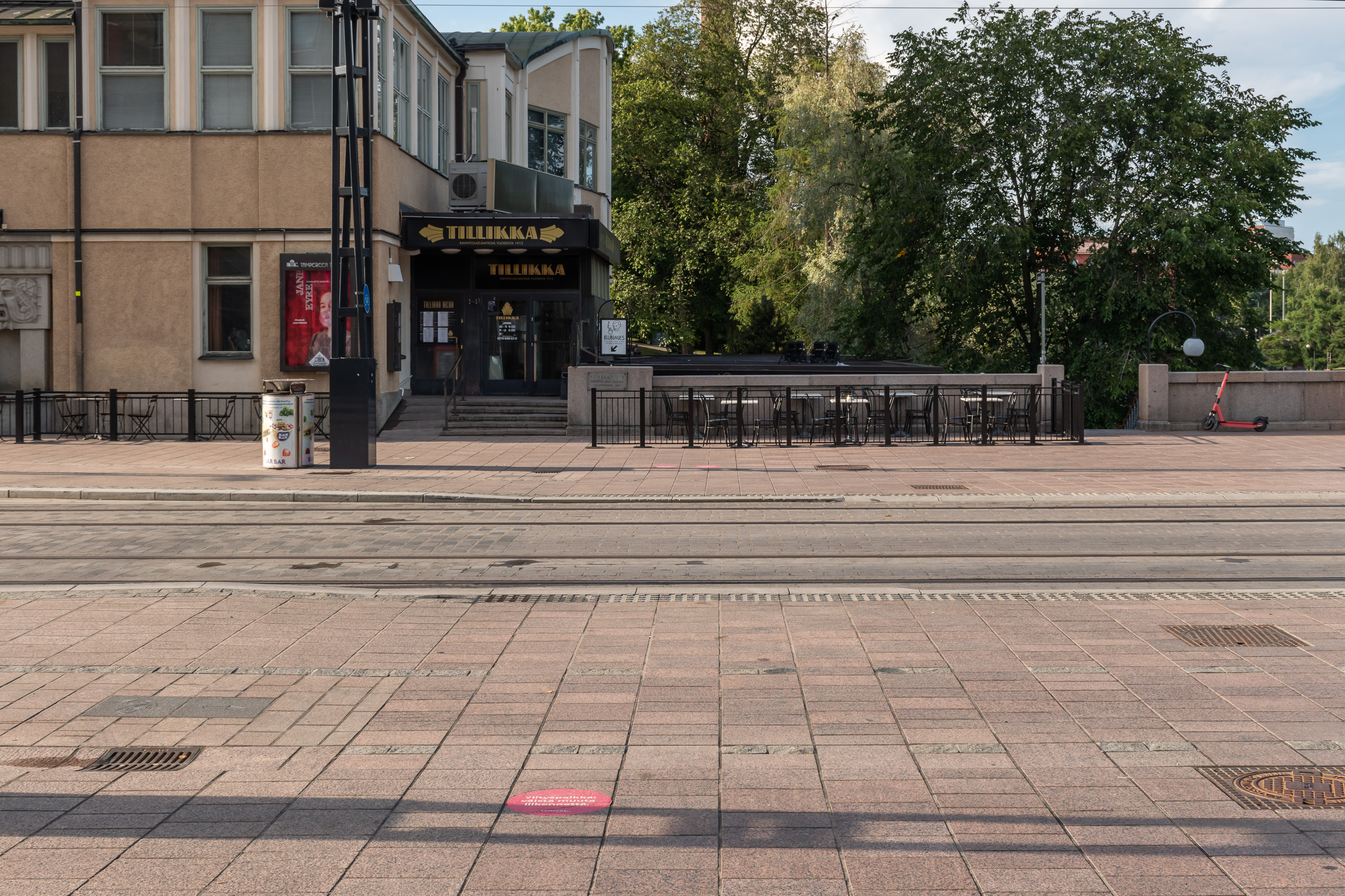 19. Самым большим косяком на Хямеэнкату я считаю велодорожки: они хоть и выделены цветом (плиткой другого оттенка), но довольно слабоконтрастно, а кроме того, они еще и лавируют туда-сюда, обходя остановки. Пешеходу не очень комфортно — переходя дорогу или подходя к остановкам, надо быть внимательным, чтобы не попасть под колеса велосипедистам, или, хуже, электросамокатчикам, которые сейчас более многочислены и ездят менее осторожно.