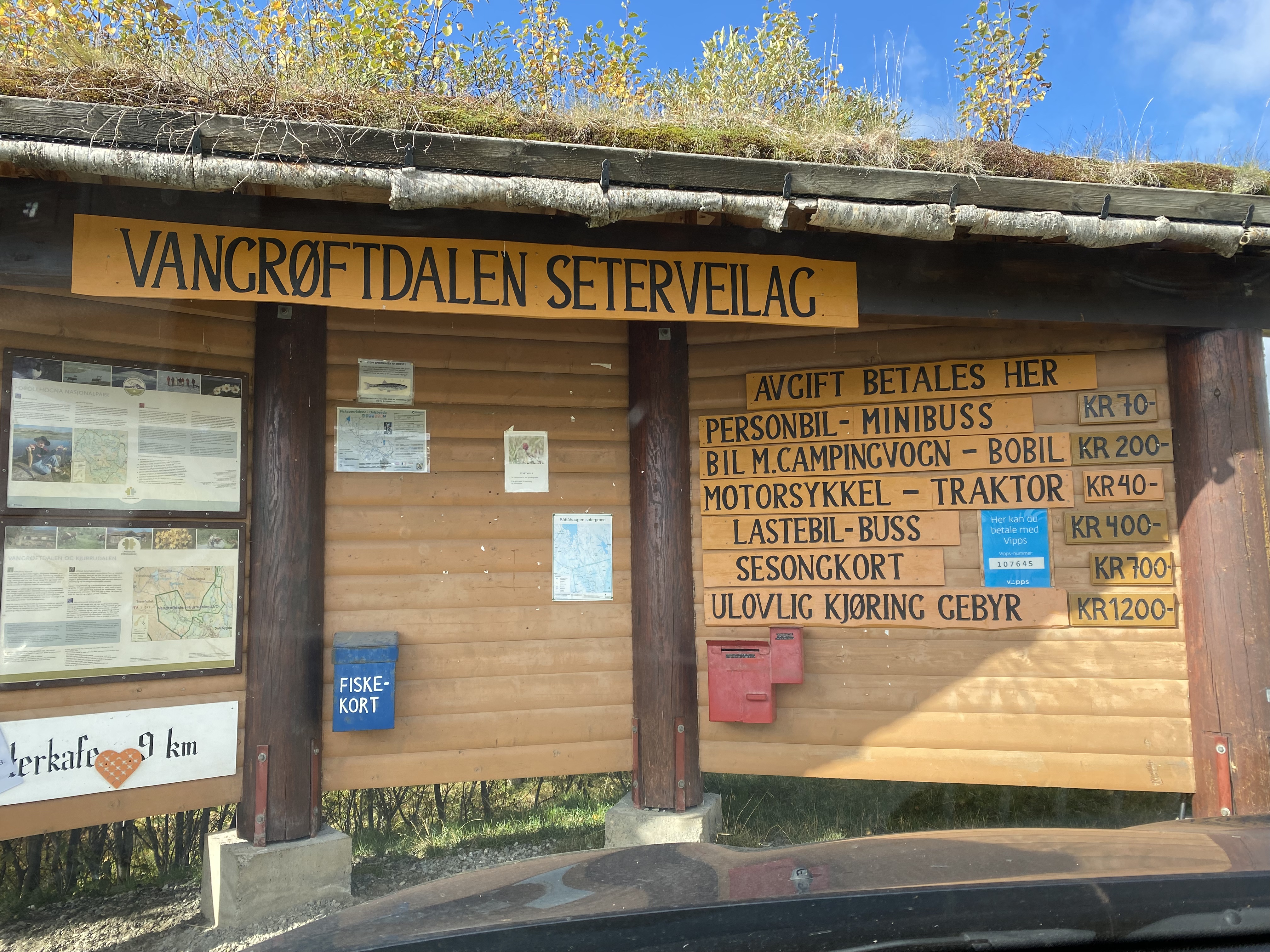 1. Я отправился на Форолльхогну, выехав с утра из того уютного кемпинга под Рёрусом — ехать было недалеко. Нужная дорога ведет через деревню Дальсбигда (Dalsbygda) и, как и многие горные дороги, является, вообще говоря, платной — потому что это частная дорога, принадлежащая местным фермерам, которые, в общем случае, не очень заинтересованы в том, чтобы она изнашивалась от потока туристов. Заплатить — 70 крон (около 7€) с легковой машины — можно наличными в ящик или через приложение Vipps — повсеместно распространное в Норвегии приложение для быстрых банковских переводов. Что делать, если у вас нет наличных (по крайней мере, без сдачи), и приложения Vipps тоже нет (насколько я понял, оно требует наличия счета в норвежском банке)? Не знаю, я в итоге проехал зайцем, просто особо и не было вариантов. В целом я бы советовал в Норвегии иметь при себе наличные, в том числе мелкими купюрами и монетами, в первую очередь как раз ради таких дорог и стоянок. Я вот снял днем раньше в Рёрусе кроны в банкомате, а разменять забыл.