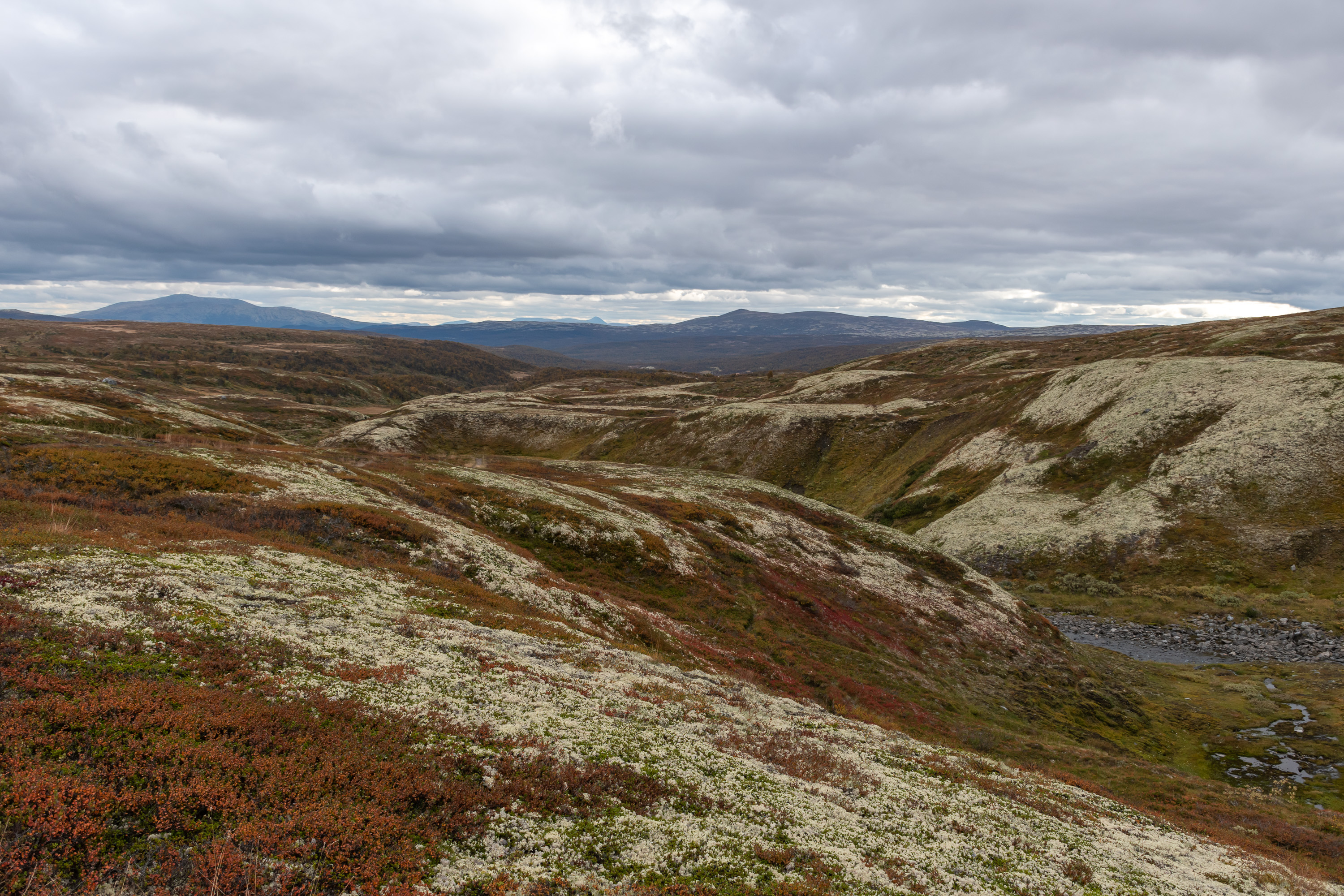 13. Так что возвращаемся обратно. В горной тундре Форолльхогны интересно огромное количество ягеля местами. Списать на отсутствие северных оленей тут уже нельзя, потому что в горах Гаулдальсвидды как раз-таки существует одна из норвежских популяций диких горных северных оленей. Видимо, их все-таки не так уж много, и/или они живут в другой части плоскогорья.