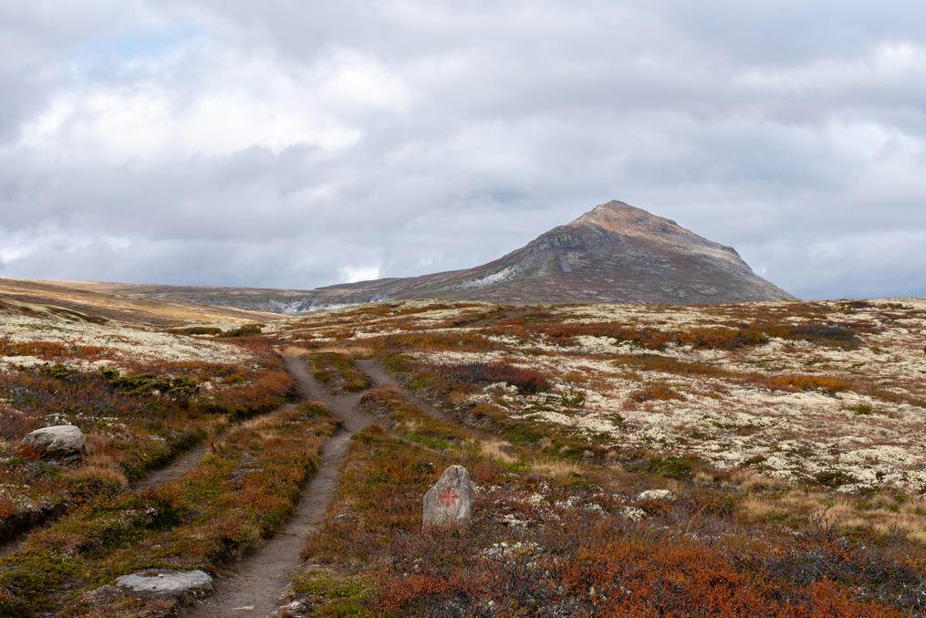 10. На самом деле к горе идет несколько параллельных ветвящихся троп и минимум одна колея, так что с точного маршрута легко сбиться, но само направление вполне очевидно. Этот маршрут через горы не изобретен для туристов — он реально использовался когда-то как дорога из Эстердалена в Тронхейм, и в числе прочего здесь возили на север рёрусскую медь.