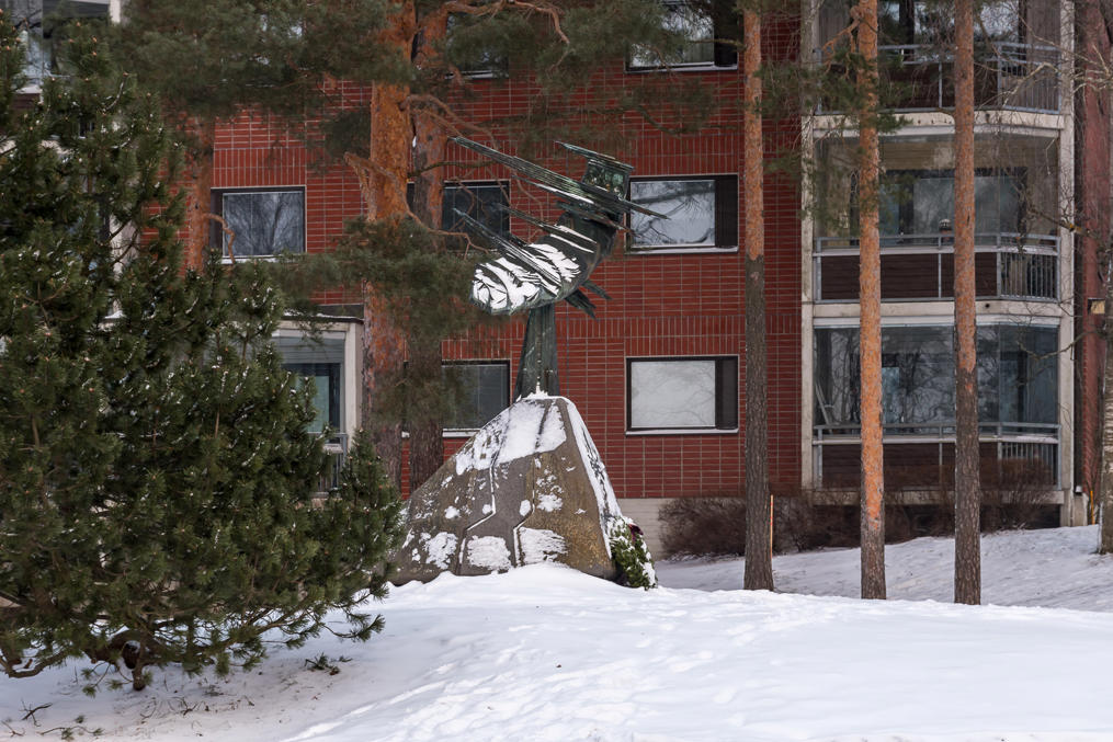 27. Рядом с фабрикой располагается, внезапно, музей охоты. Он открыт в 1990 году, хотя Финляндский союз охотников (Suomen Metsästäjäliitto) собирал для него экспонаты еще с 1930. Рийхимяки каких-то особых исторических ассоциаций с охотой не имеет, просто предложил в свое время хороший участок для музея. Я не заходил; насколько я помню, в марте 2021 музеи (как и куча всего остального) в большинстве регионов Финляндии были закрыты из-за коронаограничений, бессмысленных и беспощадных.