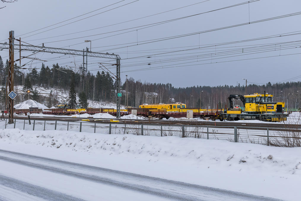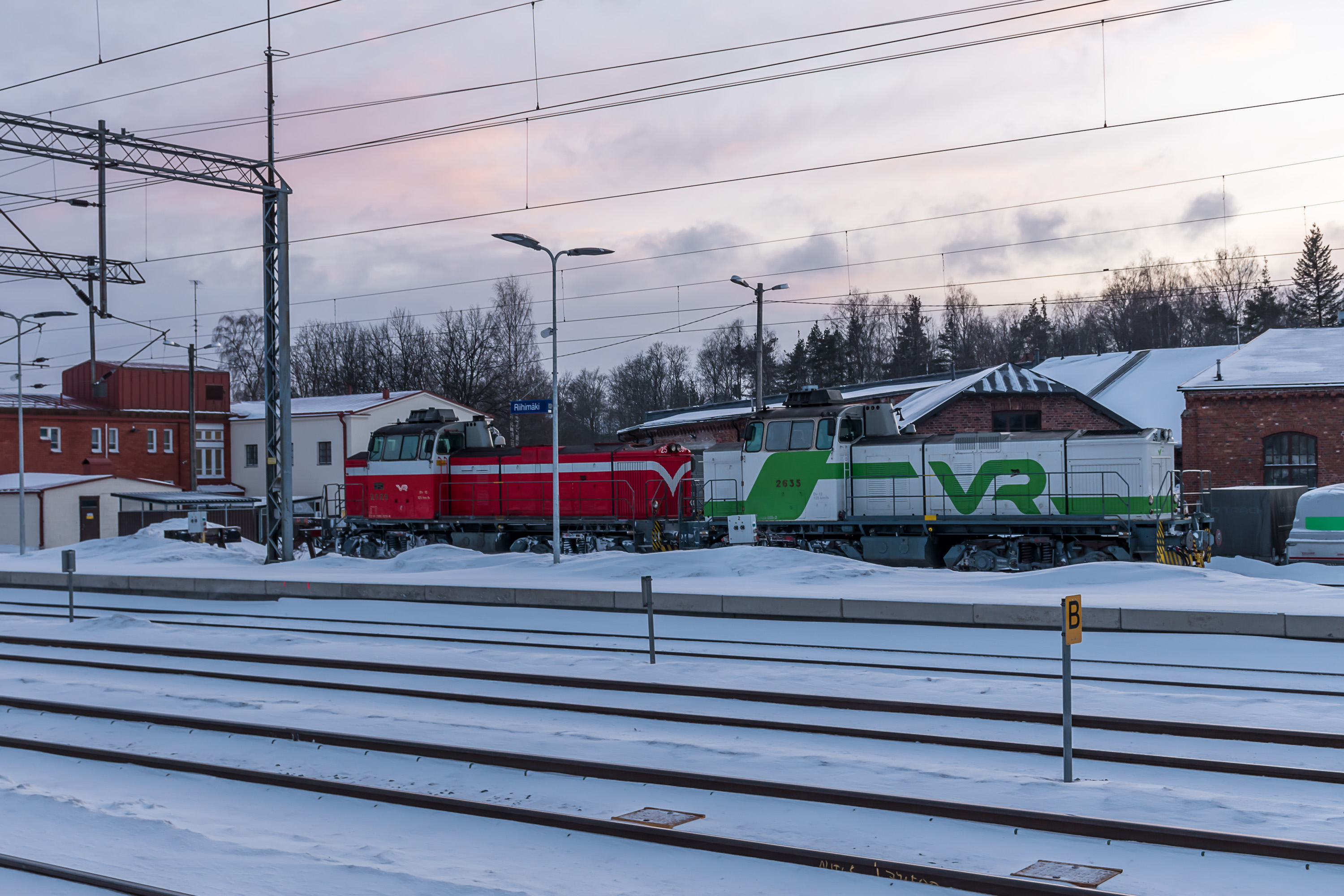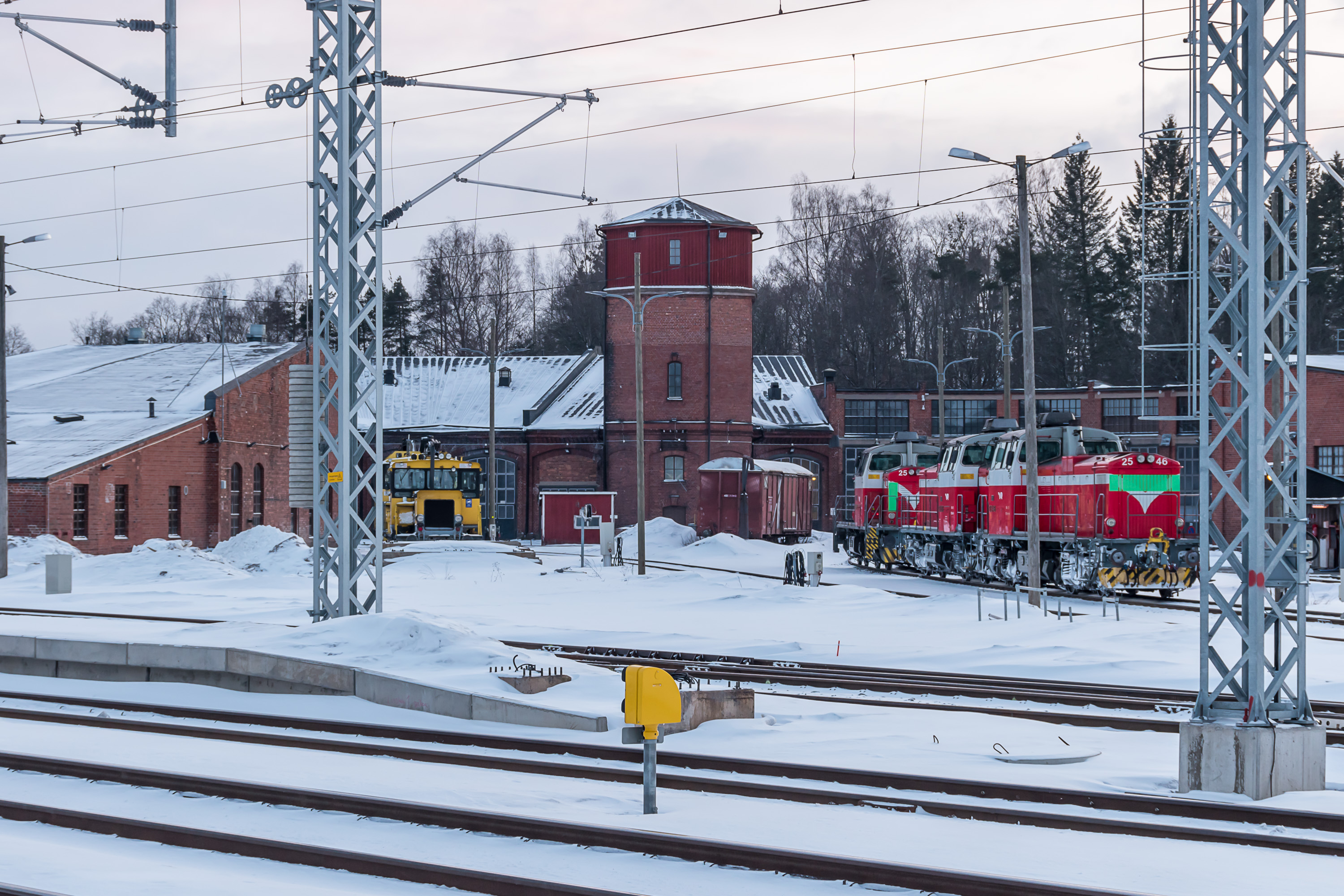 63. Веерное депо активно используется. На путях справа стоят несколько тепловозов Dv12, которые в быту обычно зовут Deeveri (по буквам D и V, и созвучно с dreeveri — породой собак древер, популярной в Швеции и Финляндии). Это повсеместно используемая в Финляндии модель тепловозов, как в маневровой, так и в поездной работе. Самые первые из них произведены еще в 1963, и, конечно, не раз с тех пор рекоструированы; тот, у которого номер виден на фото (2546) — 1965 года.