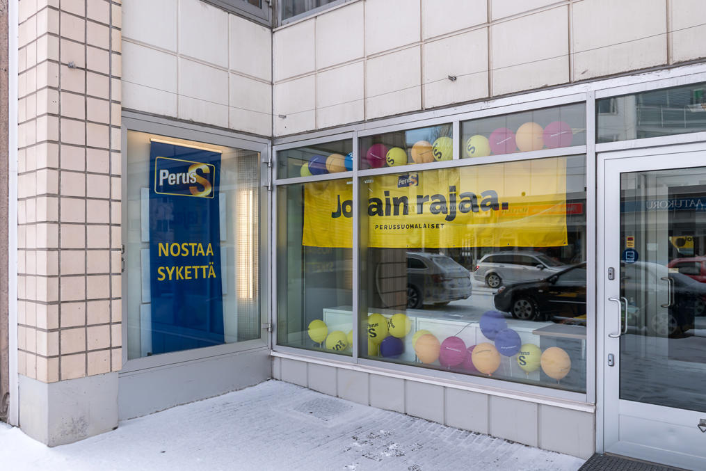 45. Приемная партии "Истинные Финны" (Perussuomalaiset), правопопулистов, выступающих, в числе прочего, против иммиграции (а также против ЕС и против борьбы с изменением климата). Лозунг Jotain rajaa — "Хоть какая-то граница" — намек на то, что границы надо бы, того, закрыть.
