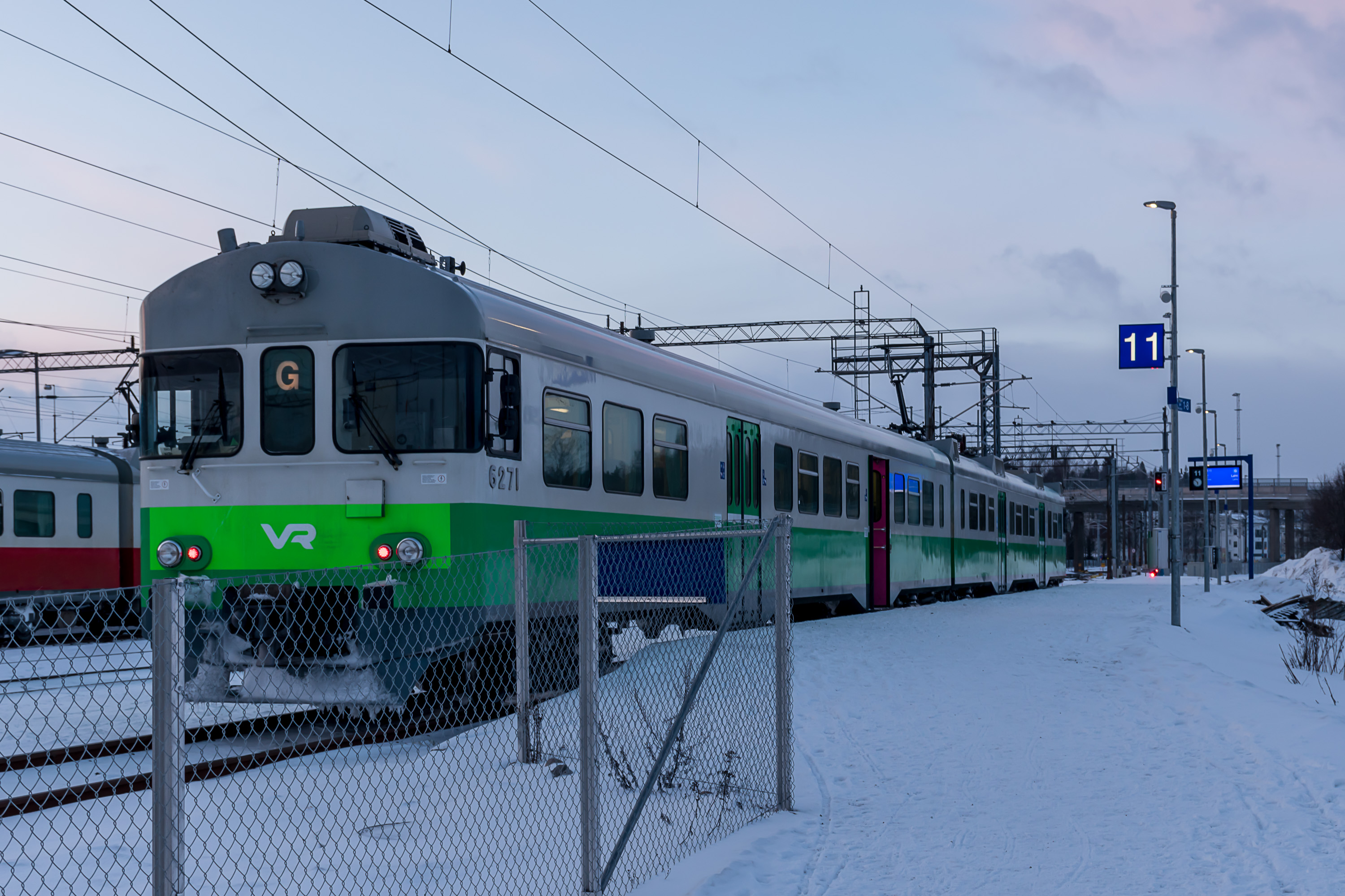 65. Так же не перекрашена и большая часть старых электричек Sm2, конца 1970-начала 1980-х годов — вполне уютных и тоже прошедших пару реконструкций, правда, не низкопольных. На момент фото из-за реконструкции станции электрички маршрута G, Рийхимяки-Лахти, отправлялись со временной платформы с 11 пути на дальнем краю станции.