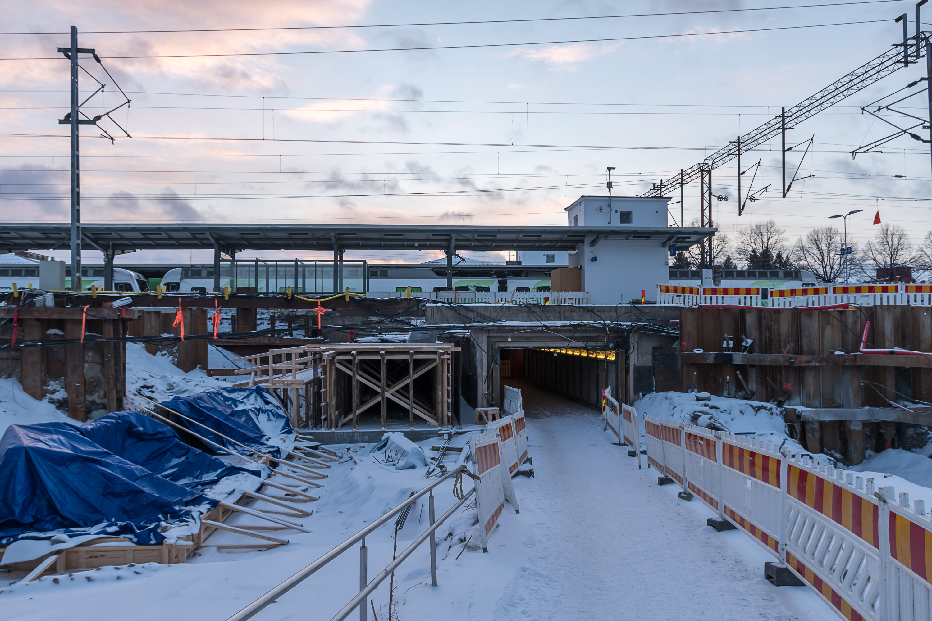 69. Что ж, возвращаемся на станцию. В районе пассажирских платформ идет достаточно серьезная реконструкция, тут вот расширяют пешеходный туннель. В целом в 2017-2021 станция была полностью реконструирована с заменой всех путей, моста через речку Вантаанйоки и проч., в рамках проекта реконструкции всего Главного хода на участке Хельсинки-Рийхимяки, когда отремонтировали кучу всякой железнодорожной инфраструктуры, а местами и построили новые пути.