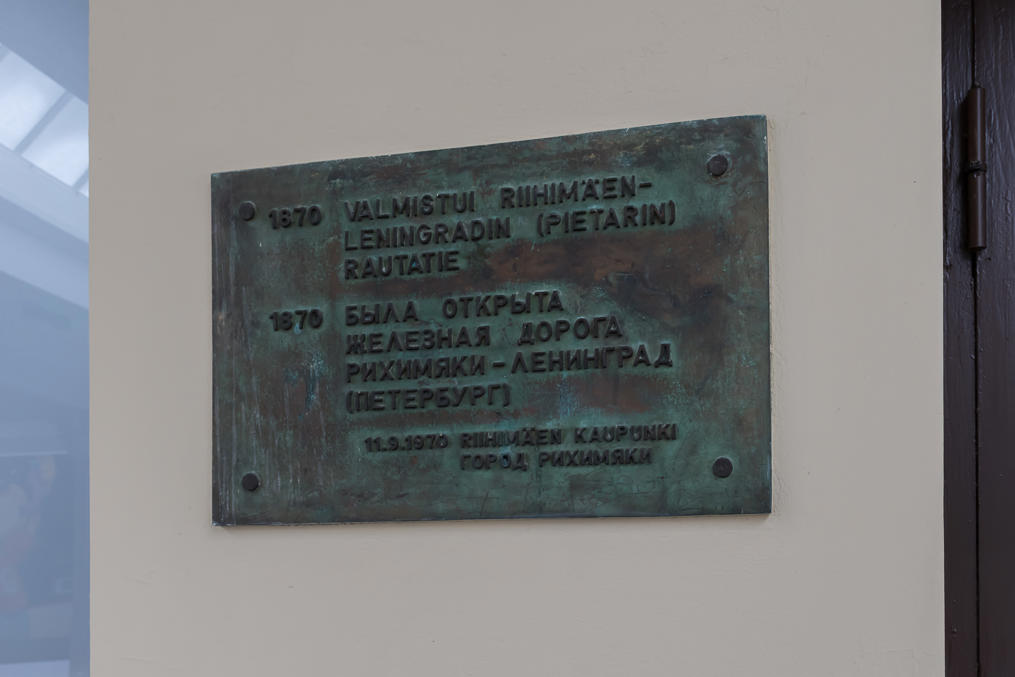 6. На стене вокзала можно найти памятную табличку про строительство железной дороги на Петербург, в том числе и на русском.