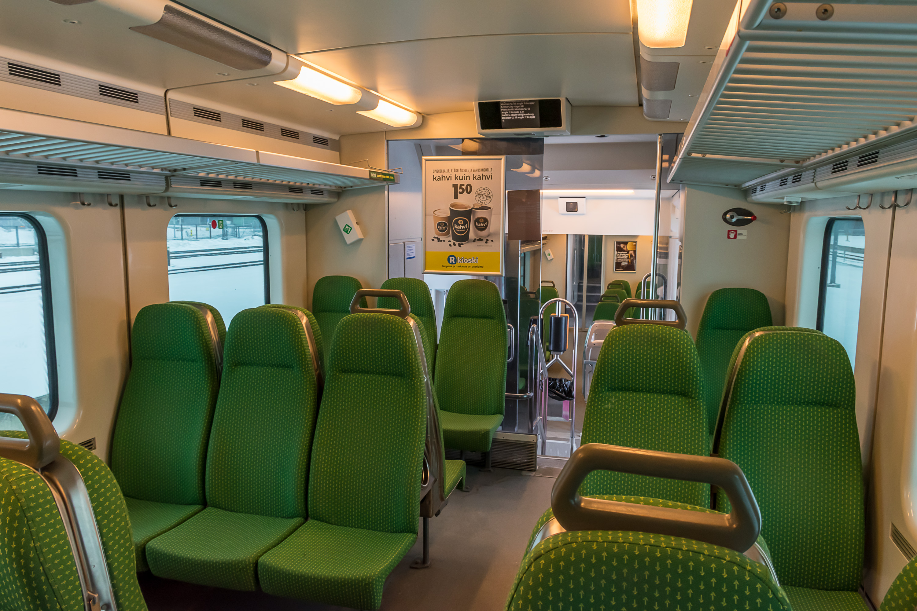 1. На большинстве рейсов R-электричек сейчас ходят составы Sm4, производства испанского завода CAF, закупленные на рубеже веков в количестве 30 шт. Максимальная скорость — 160 км/ч. Капитальный ремонт произведен в 2013-2016; не слишком давно, но салоны этих электричек все равно уже выглядят ощутимо "уставшими". В отличие от поездов дальнего следования и новых пригородных электричек, в Sm4 нет ни розеток, ни Wi-Fi. Проехаться от Хельсинки до Тампере будет заметно дешевле, чем на поезде дальнего следования, но и дольше — где-то два часа вместо полутора, а от Рийхимяки до Тампере, соответственно, около часа. За дальними пригородами Хельсинки в салоне обычно становится довольно пусто.