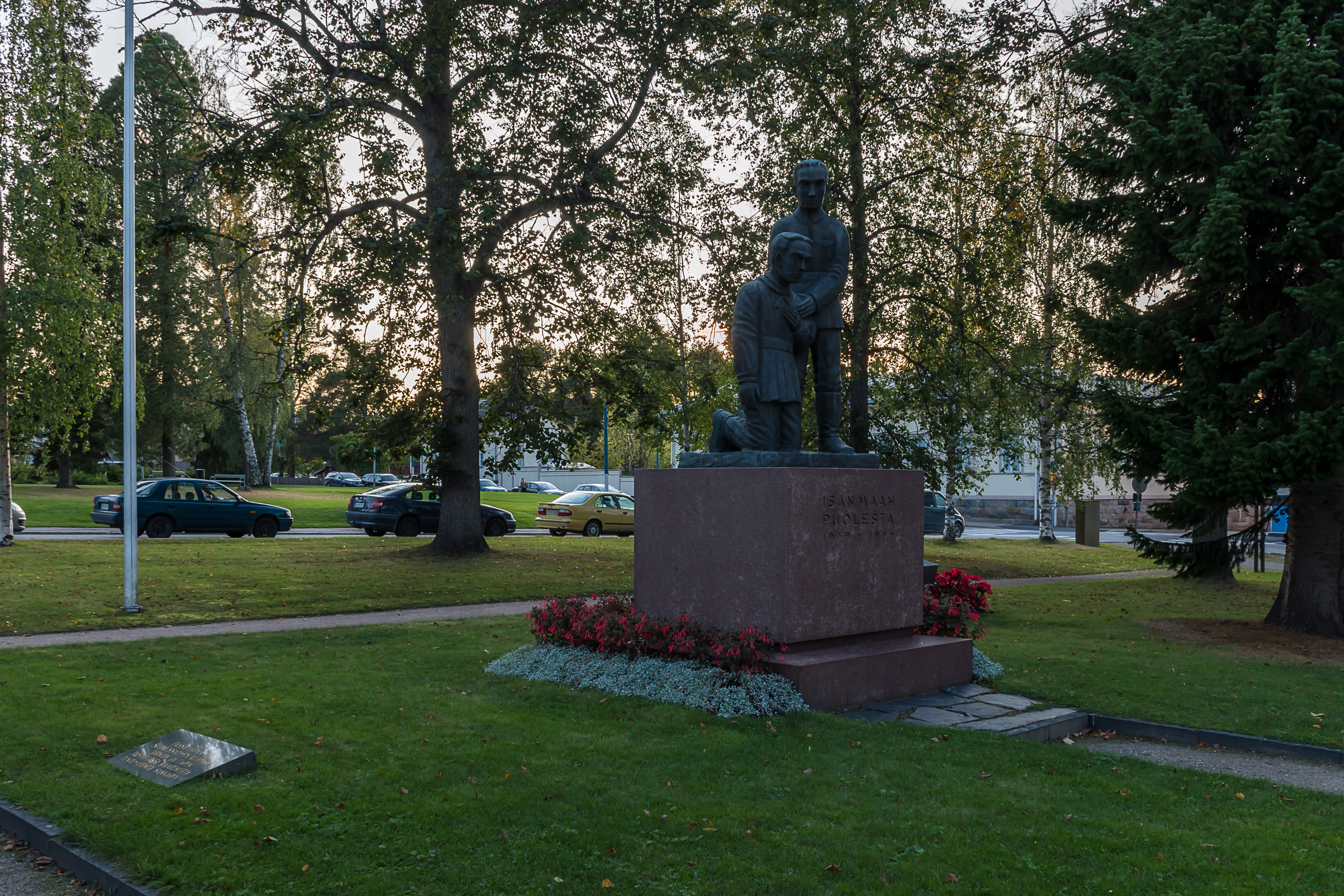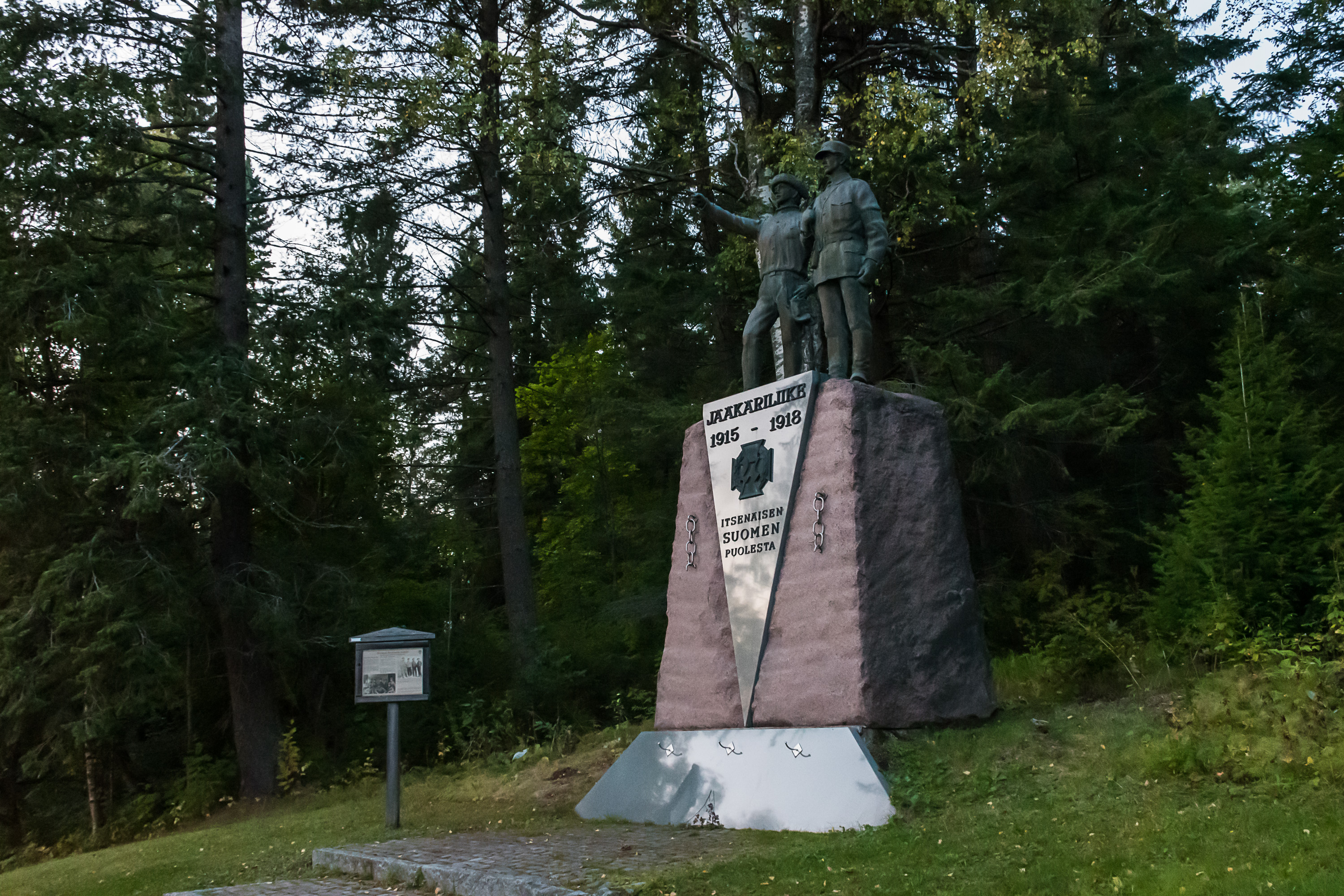 46. Еще у ГЭС и дегтярного шлюза стоит памятник местным егерям — тайно отправившейся в 1915 на учебу воинскому ремеслу в кайзеровскую Германию молодежи. Вернувшись в Финляндию после провозглашения ею независимости, егеря составили основной костяк сил белых в Гражданской войне 1918. Кто был в той войне прав, кто виноват — вопрос далеко не однозначный, но исторически егерей принято считать освободителями, вот и на памятнике — разорванная цепь.