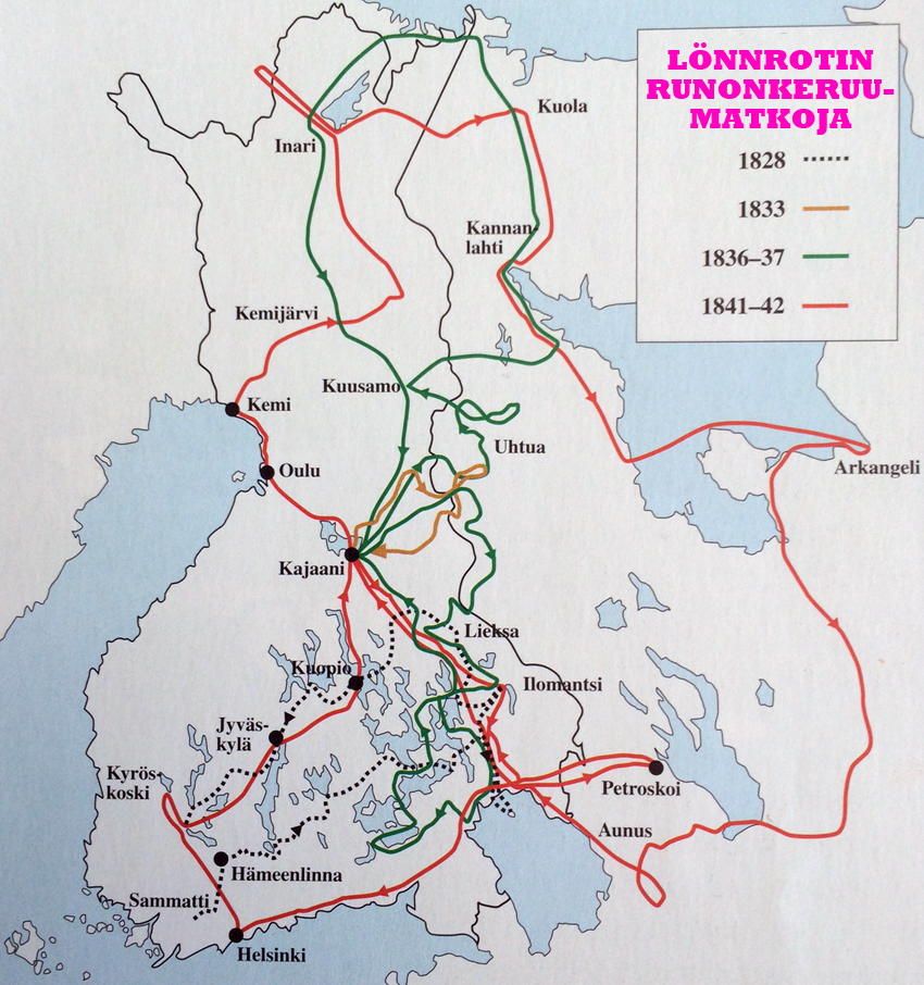 4. В 1833 уездным врачом в Каяани был назначен Элиас Лённрот (Elias Lönnrot, 1802-1884), недавно закончивший университет; с эпидемиями оспы, скарлатины, холеры и брюшного тифа работы у него тут хватало, хотя даже отдельного здания больницы в городе, населением в 400 человек на тот момент, не было. В какой-то момент он и сам пролежал шесть недель с тифом. Тем не менее, именно этот край местом своей работы он выбрал сам, благодаря близости к столь интересующей его Беломорской Карелии на российской стороне границы; туда он мог ездить в отпуска заниматься своим основным увлечением, сбором местного фольклора — ведь в глухой Карелии фольклор и языческие верования сохранились намного лучше, чем в строго протестантской Финляндии. Лённрот бывал в Кайнуу и Карелии и до своей работы врачом тут, но из Каяани путешествовать было намного удобнее. Именно в Каяани, в 1835 году, он выпустил первую редакцию своего знаменитого эпоса "Калевалы", скомпилированного из обрывков в основном карельского фольклора. В Каяани Лённрот прожил двадцать лет, и уехал оттуда в 1854 году на должность профессора финского языка и словесности в Хельсинкский университет.