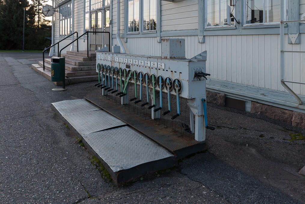 17. На станции Каяани, как и на нескольких других станциях Савонской ж/д, сохранился интересный артефакт — пост механической централизации — рукоятки, которыми управляли стрелками и семафорами станции, с помощью проходящих под землей тяг. На участке Иисалми-Каяани-Контиомяки такие девайсы использовались до самого 2006 года, до электрификации этого участка, и сохранены на память.