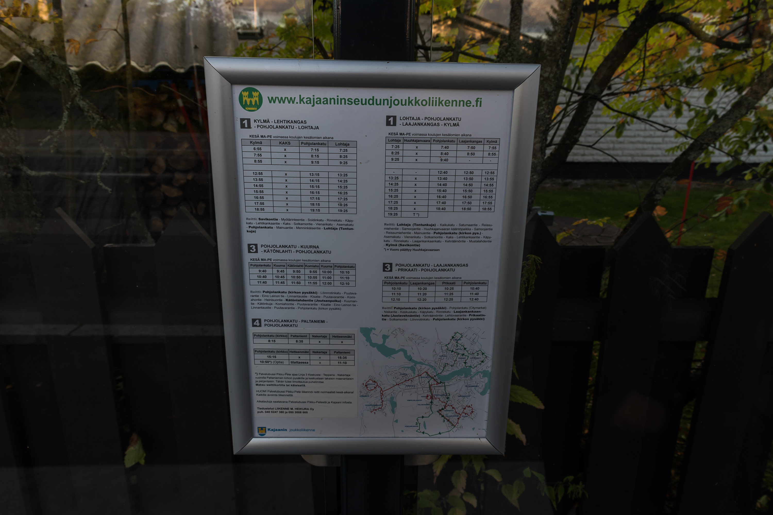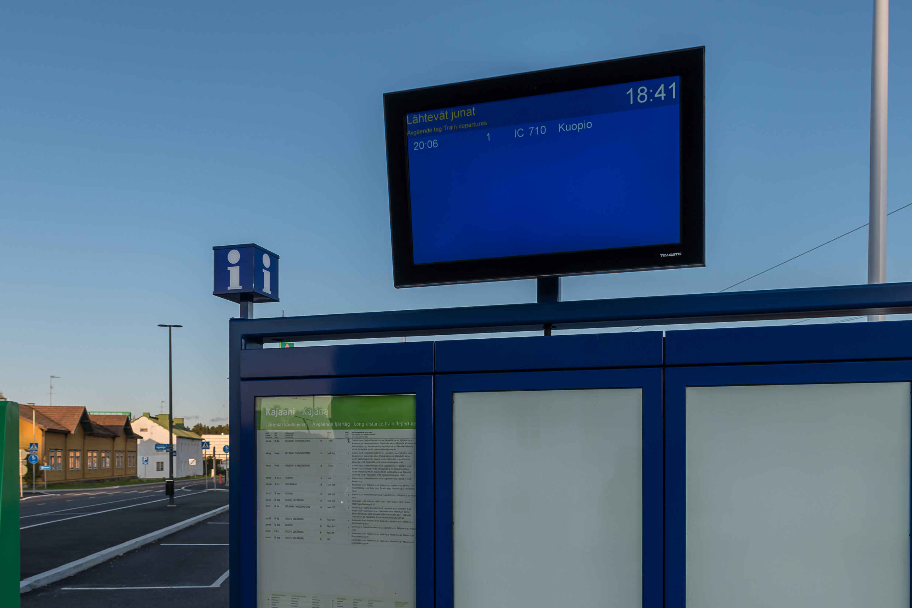 19. Движение не самое активное, но есть, можно слева присмотреться к бумажному расписанию. Поезда идут на юг на Куопио, Миккели, Коуволу, Хельсинки и на северо-запад на Оулу и Рованиеми. Большинство поездов между Хельсинки и Оулу идут по Главному ходу, через Тампере-Сейняйоки-Кокколу, но некоторые — через Савонскую ж/д, через Каяани. Раньше были ночные поезда Хельсинки-Каяани с возможностью погрузки автомобилей, но были отменены в 2006. Местные очень мечтают об их восстановлении, но пока денег на это никто не выделил (ночные поезда, несмотря на относительную дороговизну, еще и субсидируются).