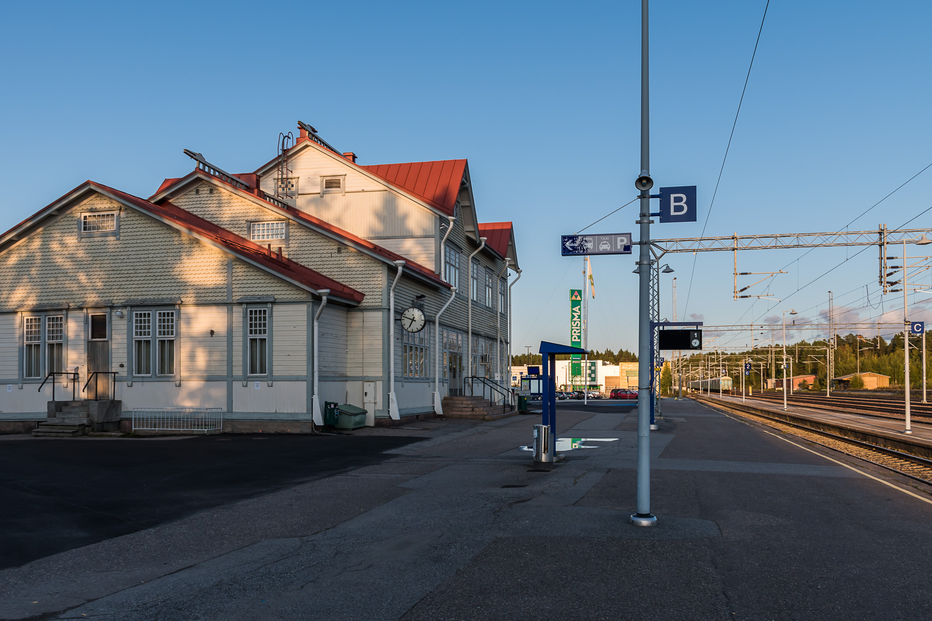 15. Вот и вокзал! Как уже упоминалась, железная дорога в Каяани пришла в 1904, и тогда же построен вокзал, архитектора Густава Нюстрёма (Gustaf Nyström); нетиповой, не слишком похож на типовые финские деревянные вокзалы, и на мой взгляд — один из самых красивых вокзалов страны. Других вокзалов этот архитектор вроде бы не строил.