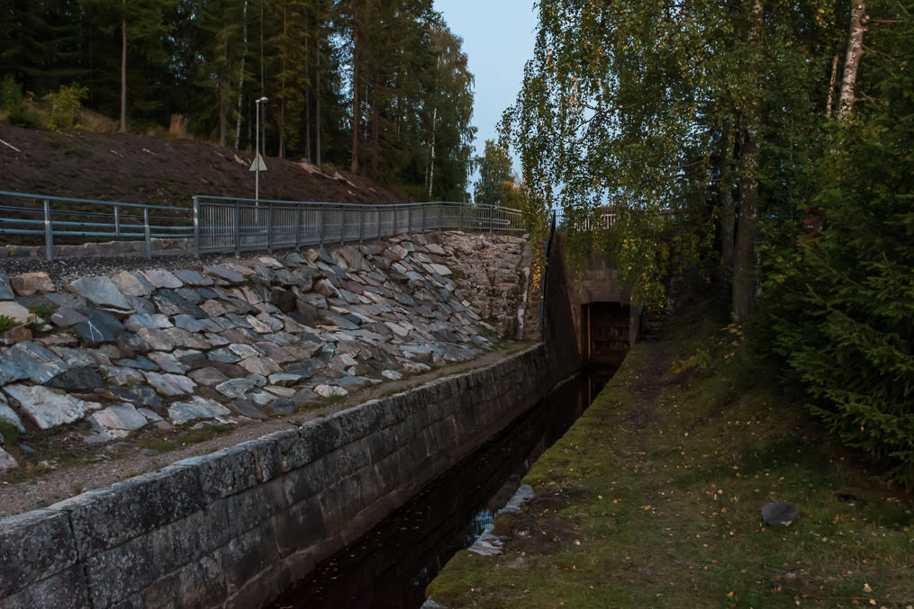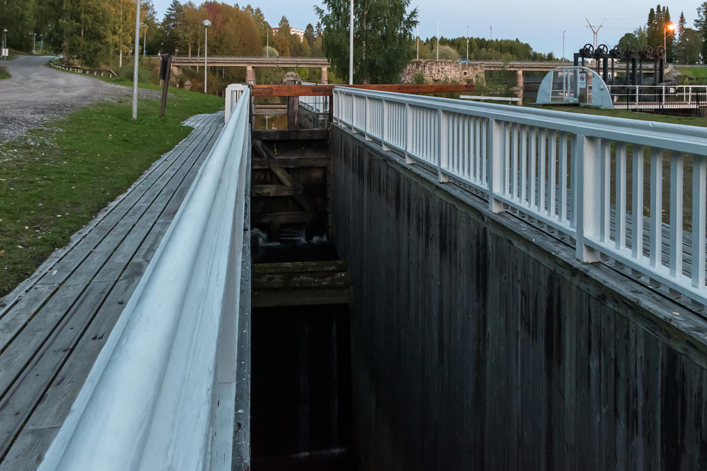 43. Так как река использовалась для перевозок дегтя в Оулу еще до строительства ГЭС, в обход порогов были построены к 1847 году два необычных узеньких шлюза для лодок с бочками дегтя. Шлюзы активно использовались 70 лет до естественного завершения дегтярного промысла; в 1915 году один из них был снесен, второй — законсервирован и закопан. Этот второй шлюз восстановили в 1984 году, как местную достопримечательность, и сейчас он во вполне рабочем состоянии.