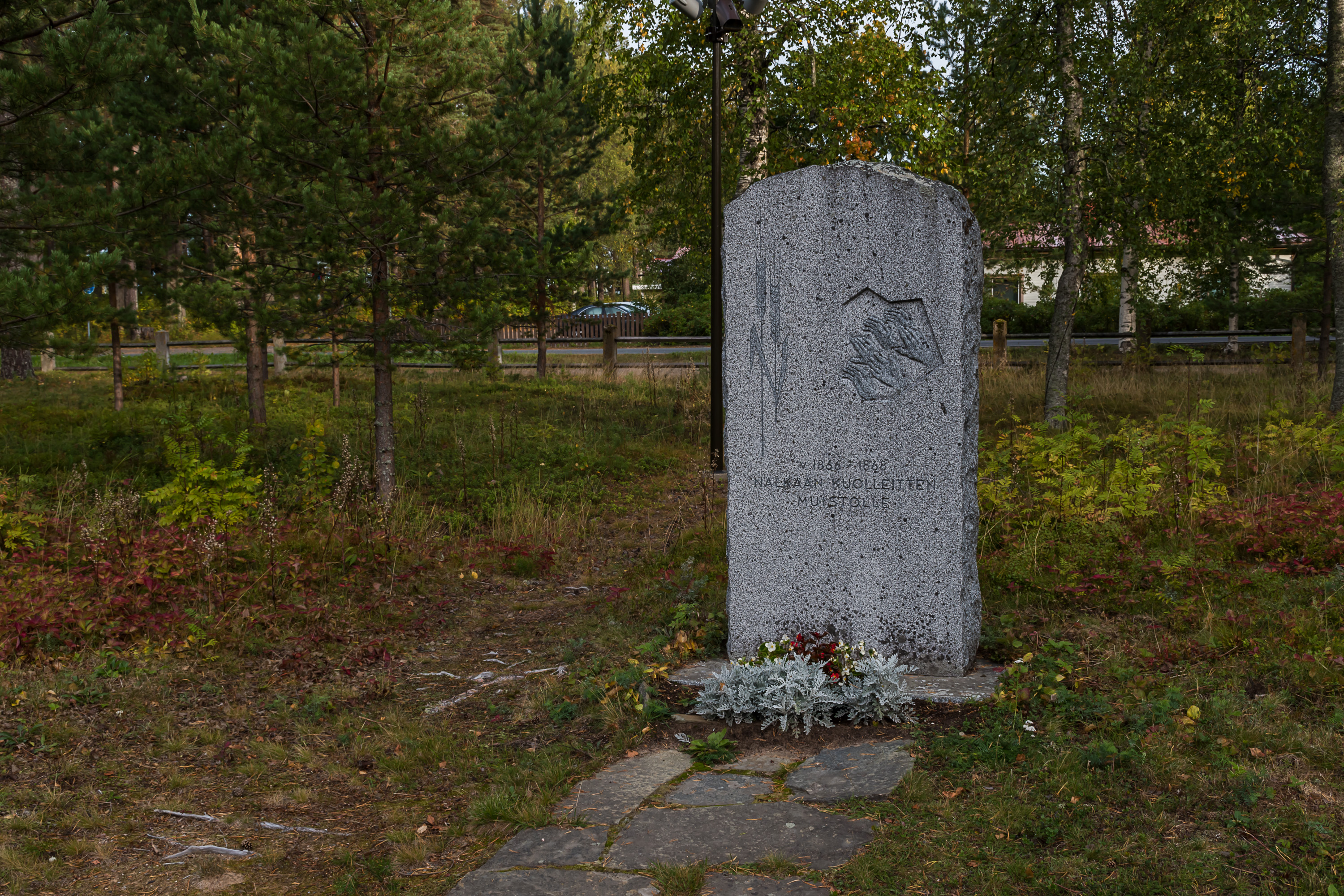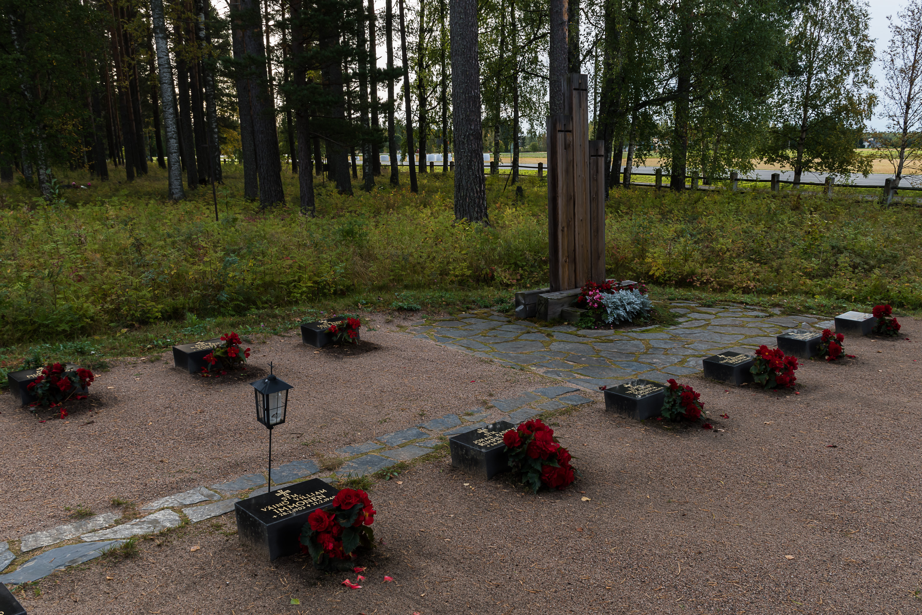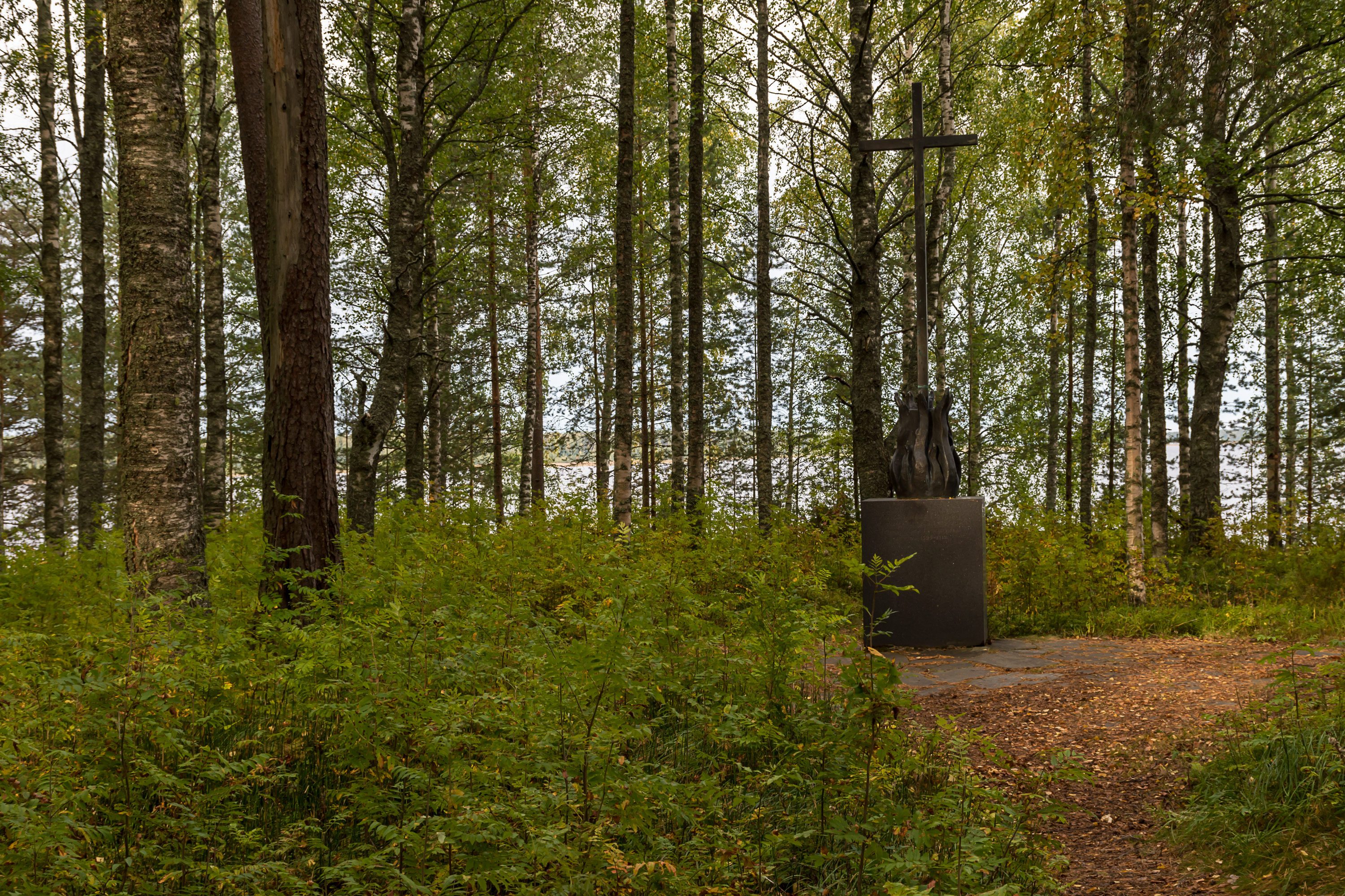 9. И еще один памятник, но уже не у церкви, а на мысу в паре километров западнее — как раз здесь, непосредственно на берегу озера, и были предыдущие две церкви Палтаниеми и их кладбище, от которого уже ничего не осталось. Открытый в 1967 памятник называется "Крест и пламя" (Risti ja leikki) — предыдущая церковь же сгорела. Берег Оулуярви, которое просвечивает за деревьями, здесь песчаный и крутой, и из-за постепенной эрозии некогда раньше на берегу постоянно находили человеческие кости с бывшего кладбища, постепенно обваливающегося в озеро. Берег укрепили в 1950-х годах, с тех пор костей больше не было.