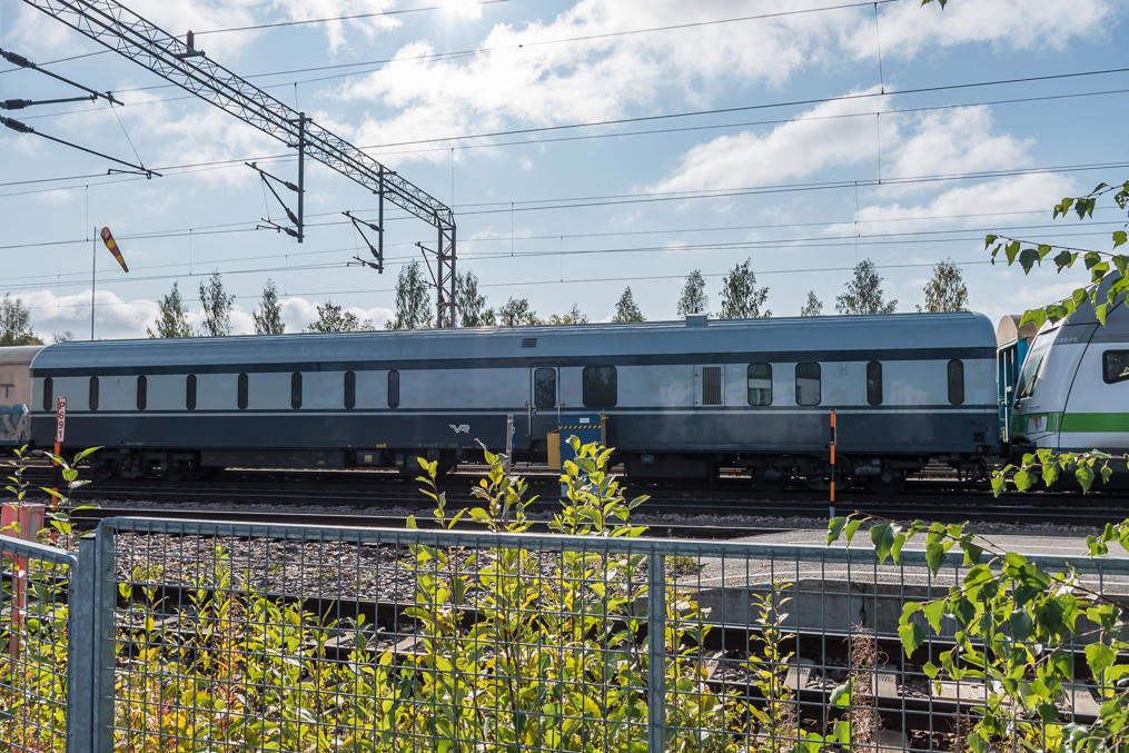 13. У одного из составов я заметил необычный вагон в хвосте, который позднее идентифицировал как вагон модели Nom, по назначению — вагонзак. Весьма примечательно, что в Финляндии вообще до сих пор используются вагонзаки — ж/д логистика для страны далеко не так важна, как для России — ввиду относительно более скромных размеров Финляндии и хорошей автодорожной сети. Но эти вагоны, построенные в начале 1980-х, до сих пор пару раз в неделю ходят по расписанию в составе поездов Хельсинки-Куопио-Оулу. Хотя по маршруту следования поезда действительно есть ряд тюрем, все же практичность такой организации в наши дни выглядит несколько сомнительно.