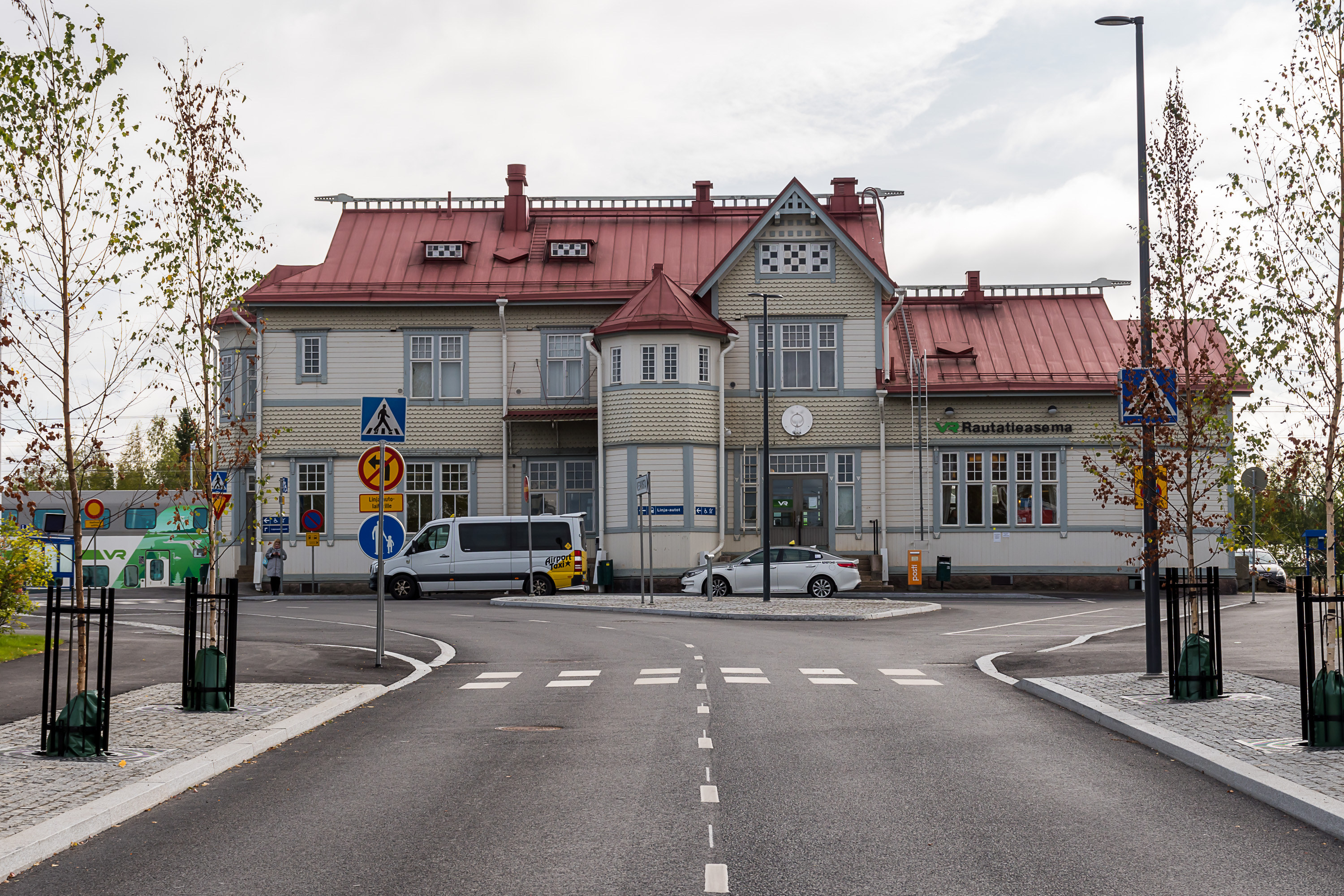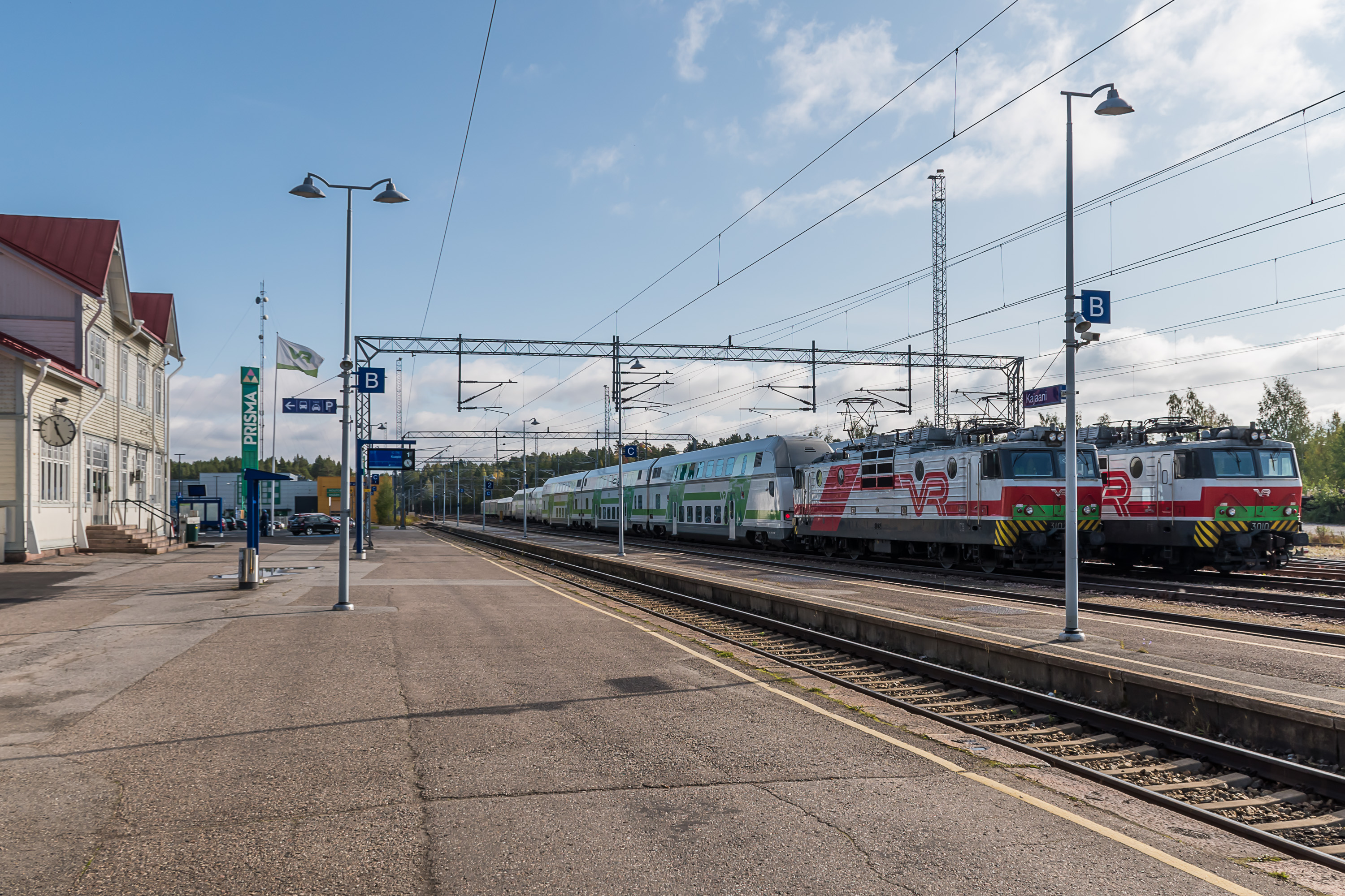 12. Ну а теперь мы опять на вокзале, на следующий день после происшествия и поездки в больницу. Погода снова прекрасная, осенью не сильно пахнет, хотя уже 16 сентября, а широты тут довольно северные — не доходят всего где-то 250 км до Полярного круга. На путях гордо стоят пассажирские составы под электровозами Sr1 — советского производства, из Новочеркасска, 1970-х годов, но до сих пор активно использующимися в Финляндии. Но под пассажирскими поездами их обычно можно увидеть только ближе к северу страны. В хвост финских поездов InterCity сейчас ставят пассажирский вагон со второй кабиной, так что при обороте поезда электровоз не обязательно перецеплять в голову, благодаря этой кабине можно ехать с ним и в хвосте. Но такая опция доступна только с более новыми электровозами Sr2 и Sr3, а Sr1 ее не поддерживают.