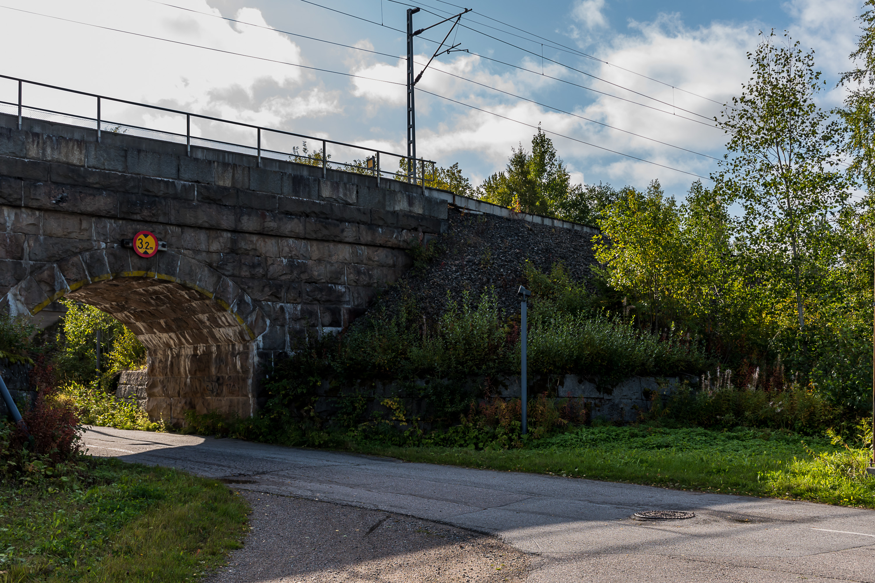 18. На небольшом протяжении набережная идет прямо вдоль железной дороги, продолжающейся от Каяани на северо-восток, к узловой станции Контиомяки. На ж/д сохранились красивые каменные мосты. За Каяани до Контиомяки железную дорогу протянули в 1923 году, существенно позже, чем она пришла в сам Каяани.