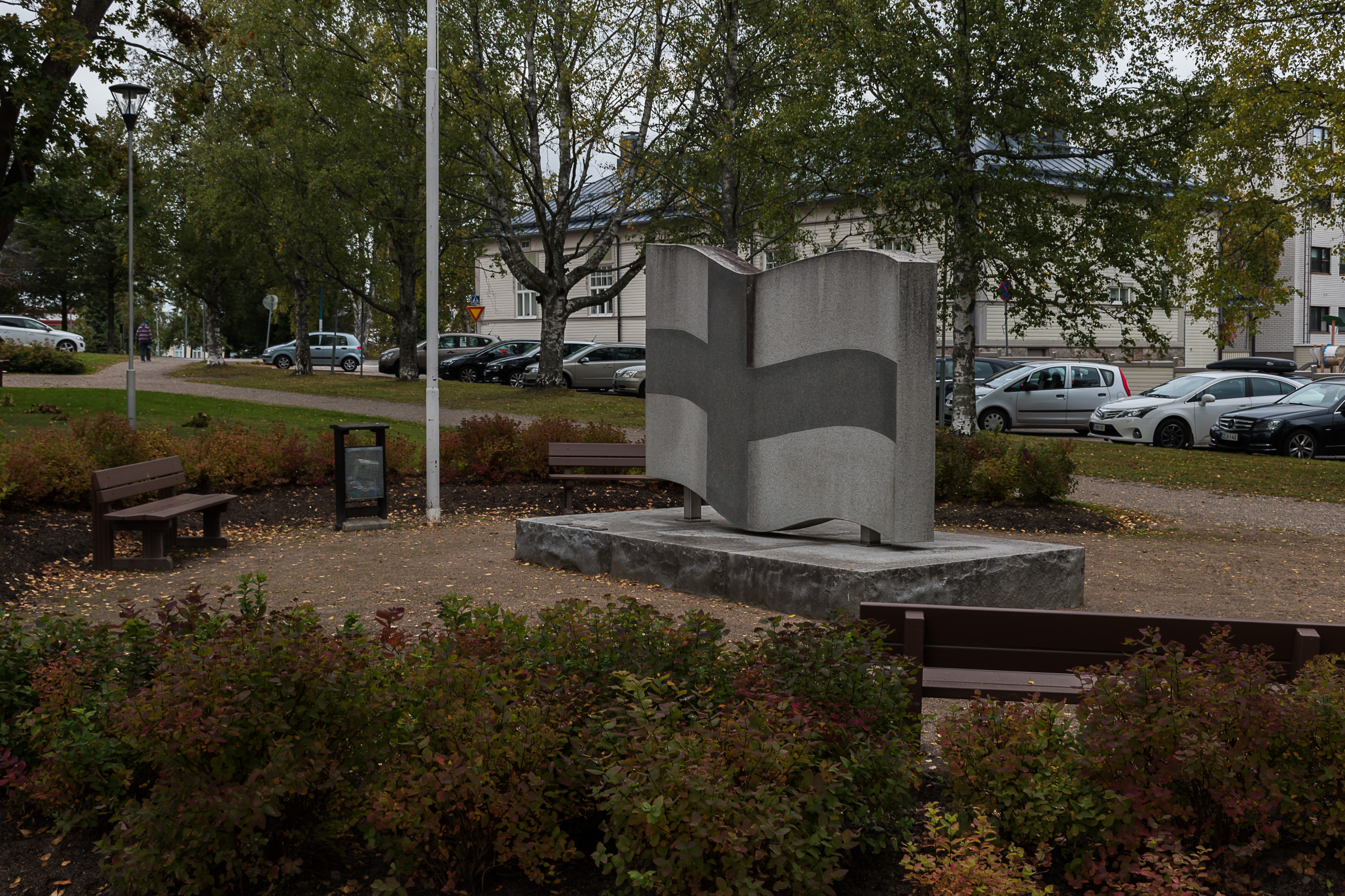 42. Памятник ветеранам на бульваре в центре. Финляндский флаг — нетипичный мотив для памятников.