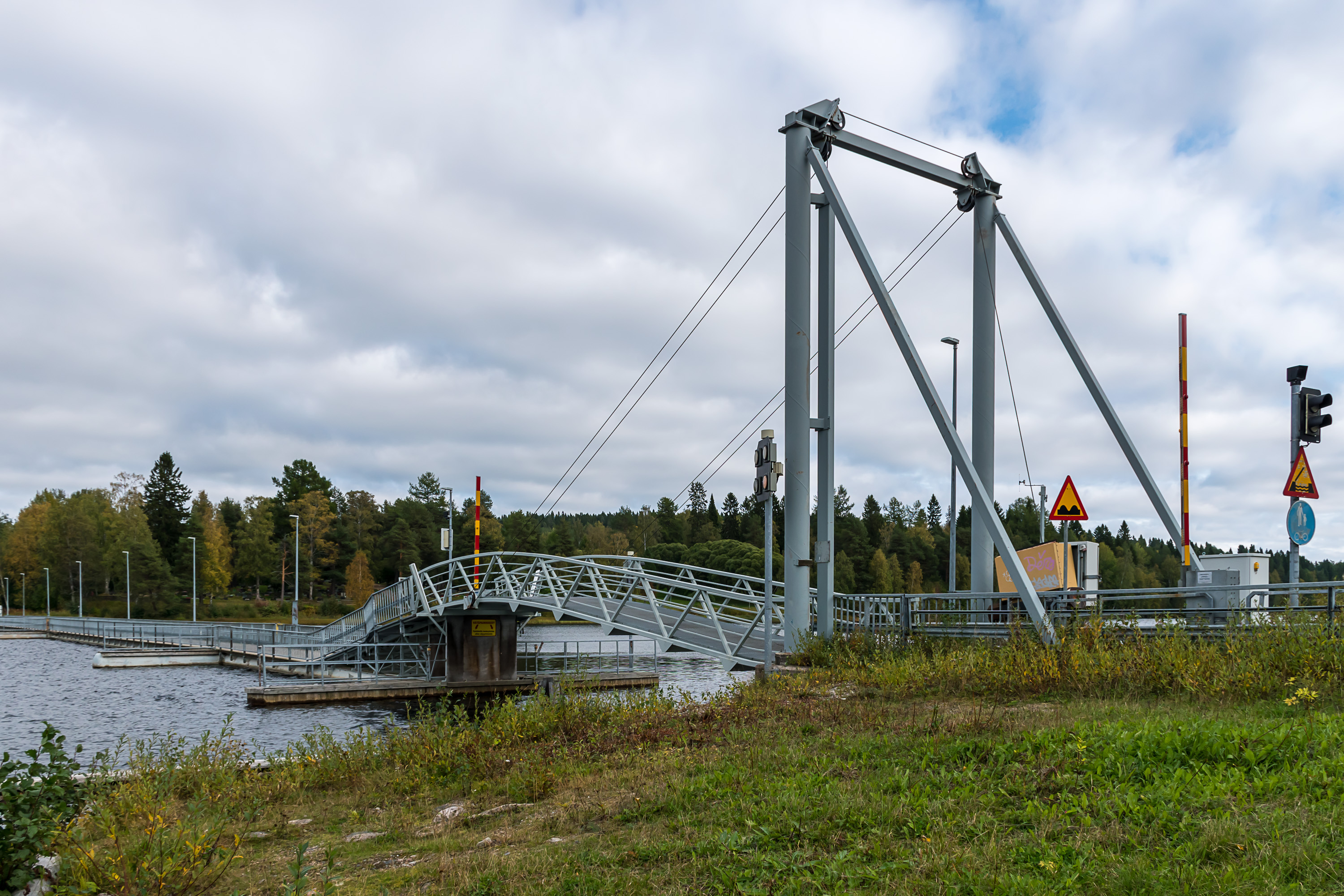 34. Дальше в течение километра вниз по течению ничего интересного нет, а еще дальше — самый нижний мост через Каяанинйоки — довольно нетипичный для Финляндии: пешеходный понтонный, но с разводным пролетом. Видимо, специально для парохода и заморочились.
