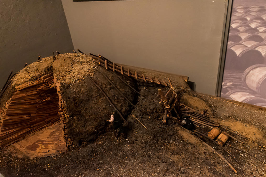 45. Так деготь получали — складывали из соснового леса такую, показанную в разрезе, круглую печь, обкладывали дерном и мхом, и поджигали изнутри, чтобы она несколько дней тлела без притока воздуха, и смола посредством пиролиза превращалась в деготь, который в конце концов вытекал по вставленной в печь трубке, и им наполняли бочки. Как и очень похожий процесс углежжения (получения древесного угля), выгонка дегтя вроде бы концептуально проста, но требует определенного, плохо формализуемого, мастерства. Сейчас кое-где в Финляндии энтузиасты еще производят подобным образом деготь в мелких масштабах, больше для сувениров и тому подобного.