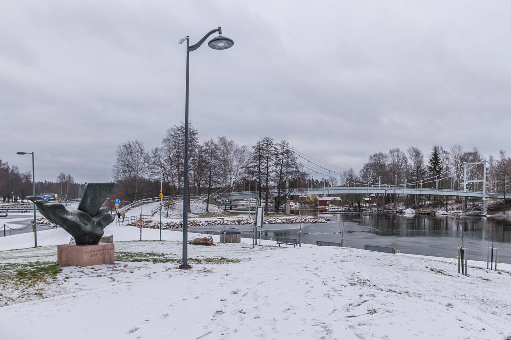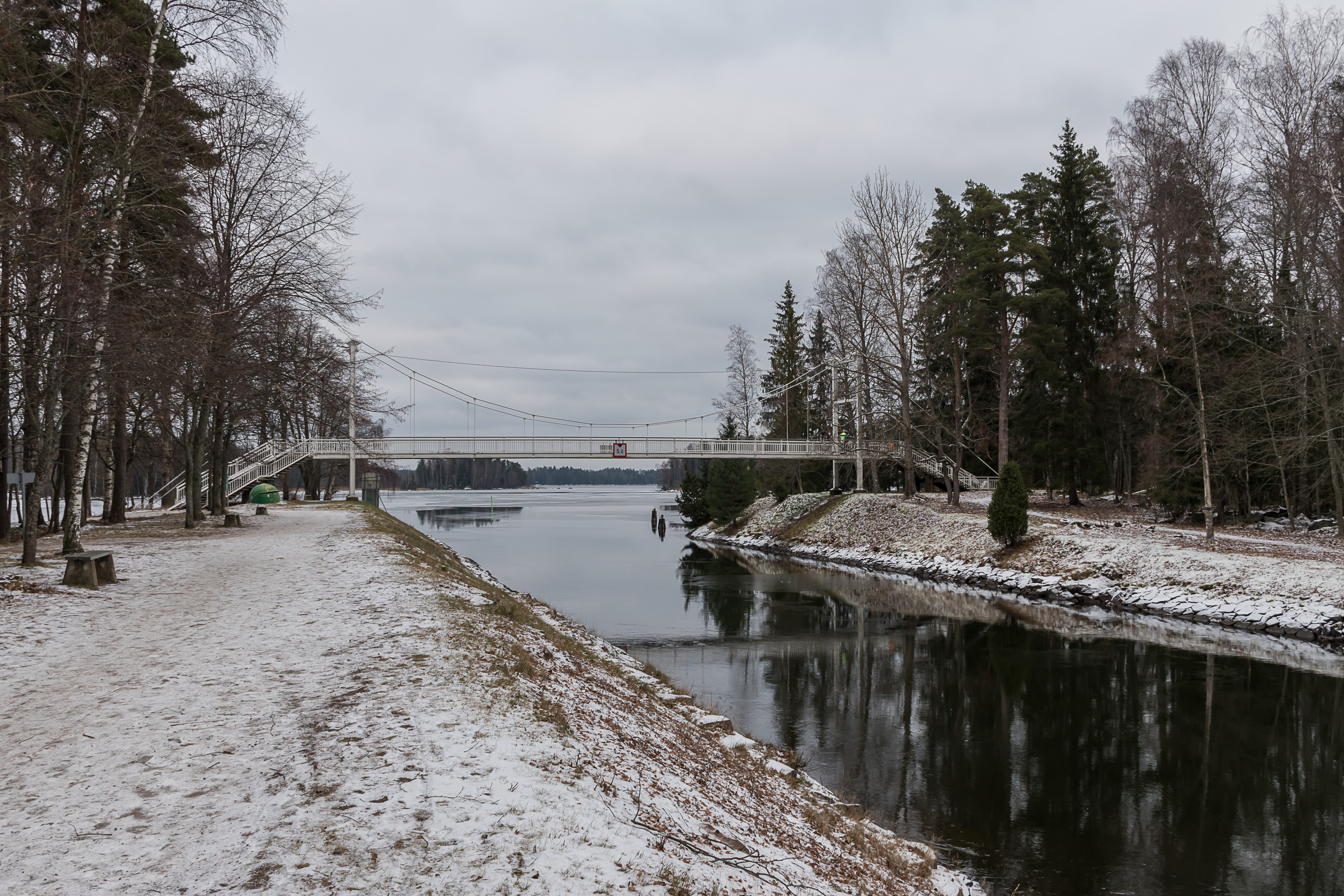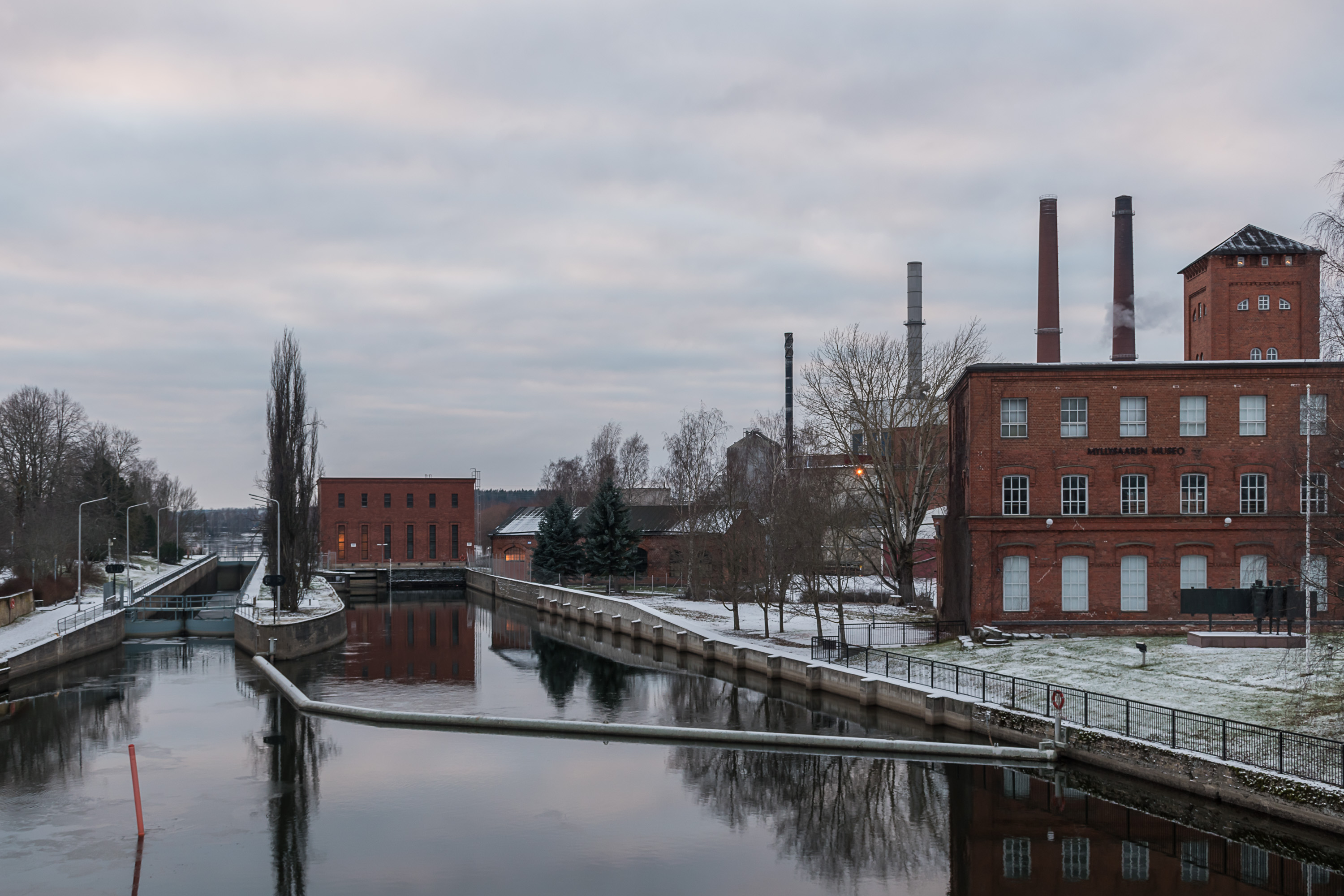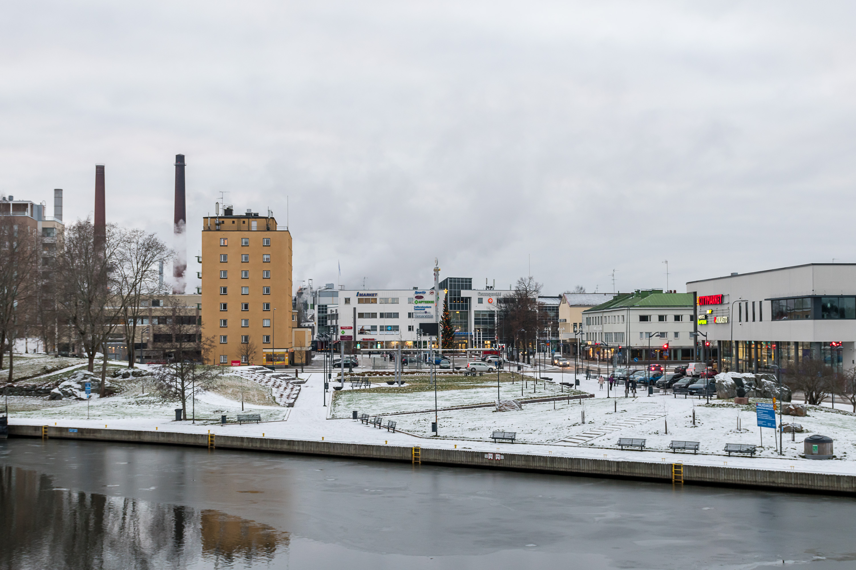 14. Вид с автомобильного моста. Справа на берегу — здание старого завода, в котором сейчас расположен городской и заводской музей, музей Мюллюсаари (Myllysaaren museo), в котором я, как обычно, до сих пор не побывал, несмотря на то, что он круглогодичный и бесплатный. В этом же здании действует Финляндский музей футбола — город, как я понимаю, в плане футбола (не самого в целом популярного в Финляндии вида спорта) относительно заметный.