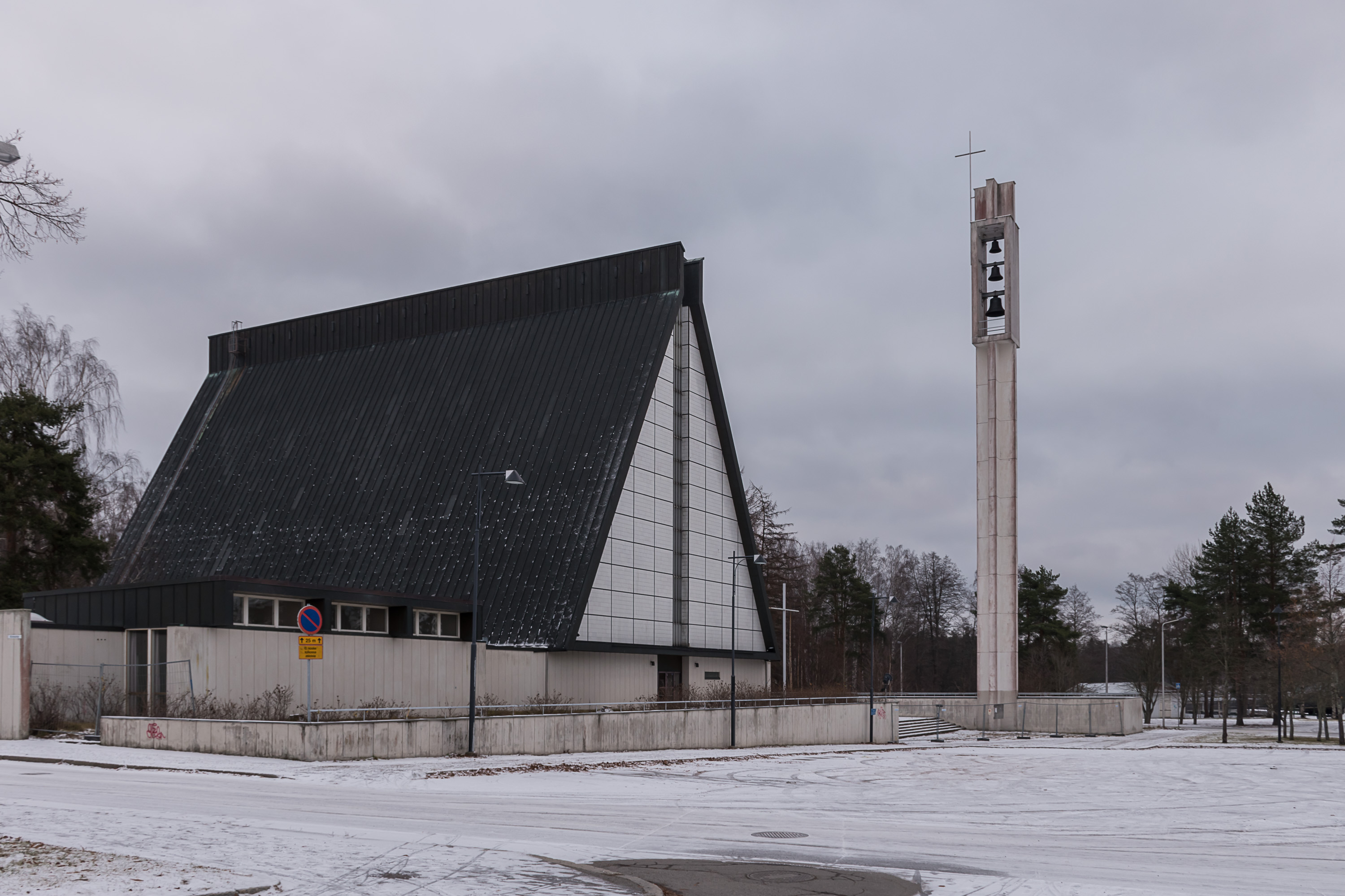26. Сделаем круг вдоль берегов Валкеакоски. Чуть дальше от центра располагается довольно брутального облика церковь. 1969 год, архитектор Вейкко Ларкас (Veikko Larkas) — он построил целый ряд церквей, по форме похожих на средневековые каменные церкви Финляндии, но по облику функционалистских/модернистских. Я неиронично большой фанат.
