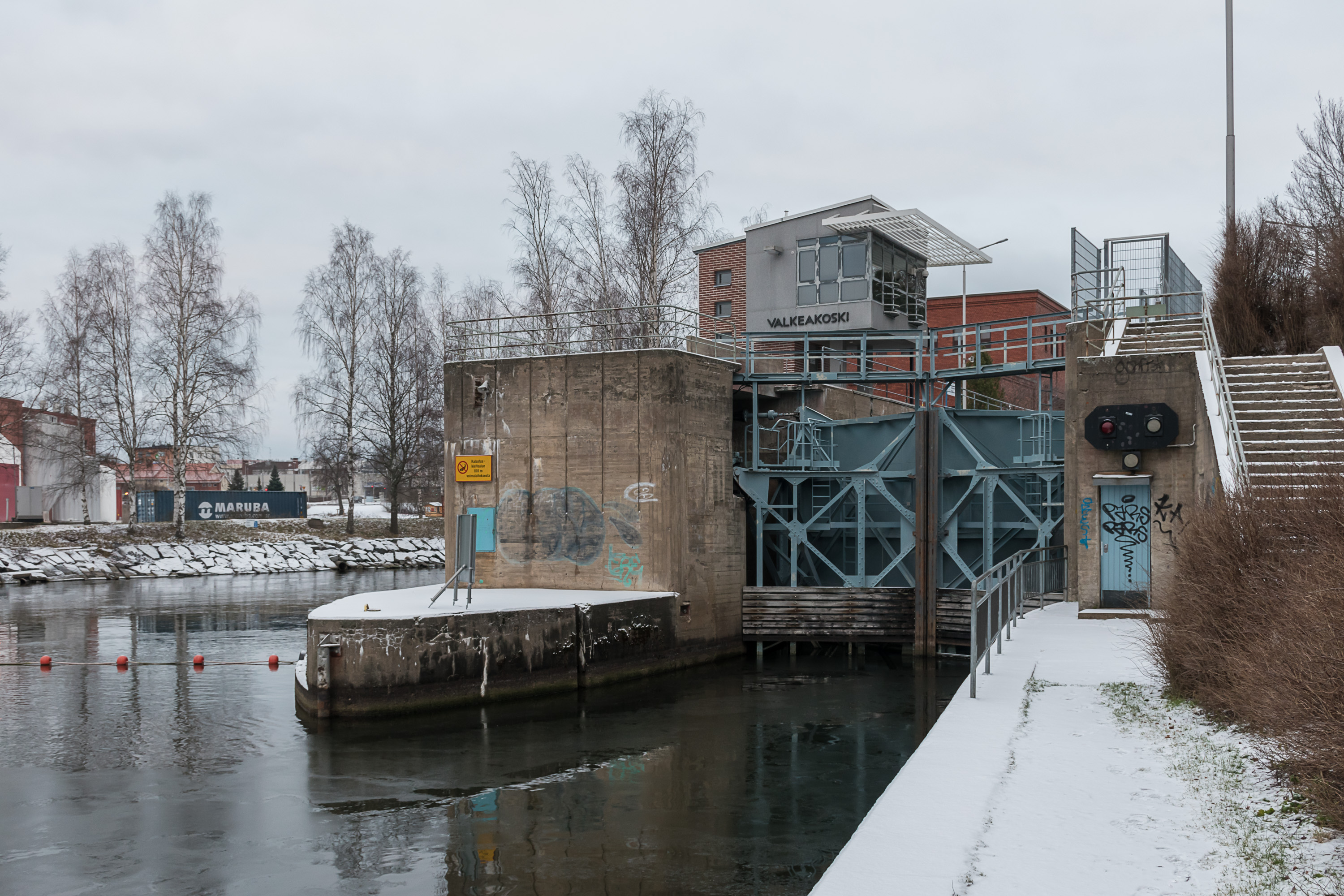 12. ГЭС Валкеакоски построена одновременно со шлюзом, в начале 1950-х — тогда же, по всей видимости, пороги как таковые и были уничтожены. Мощность ГЭС не превышает 3 МВт, она нужна больше для регулировки уровня озерной системы выше по течению.