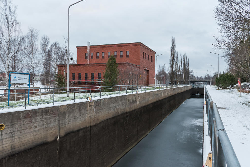 9. Гидроузел Валкеакоски состоит сейчас из довольно большого шлюза и ГЭС. Изначально канал был прокопан дугой в обход порогов, и имел два маленьких шлюза по 35 м длиной. В нынешнем виде канал, с шлюзом 145 м, построен в 1955 году, после чего старый канал был засыпан.
