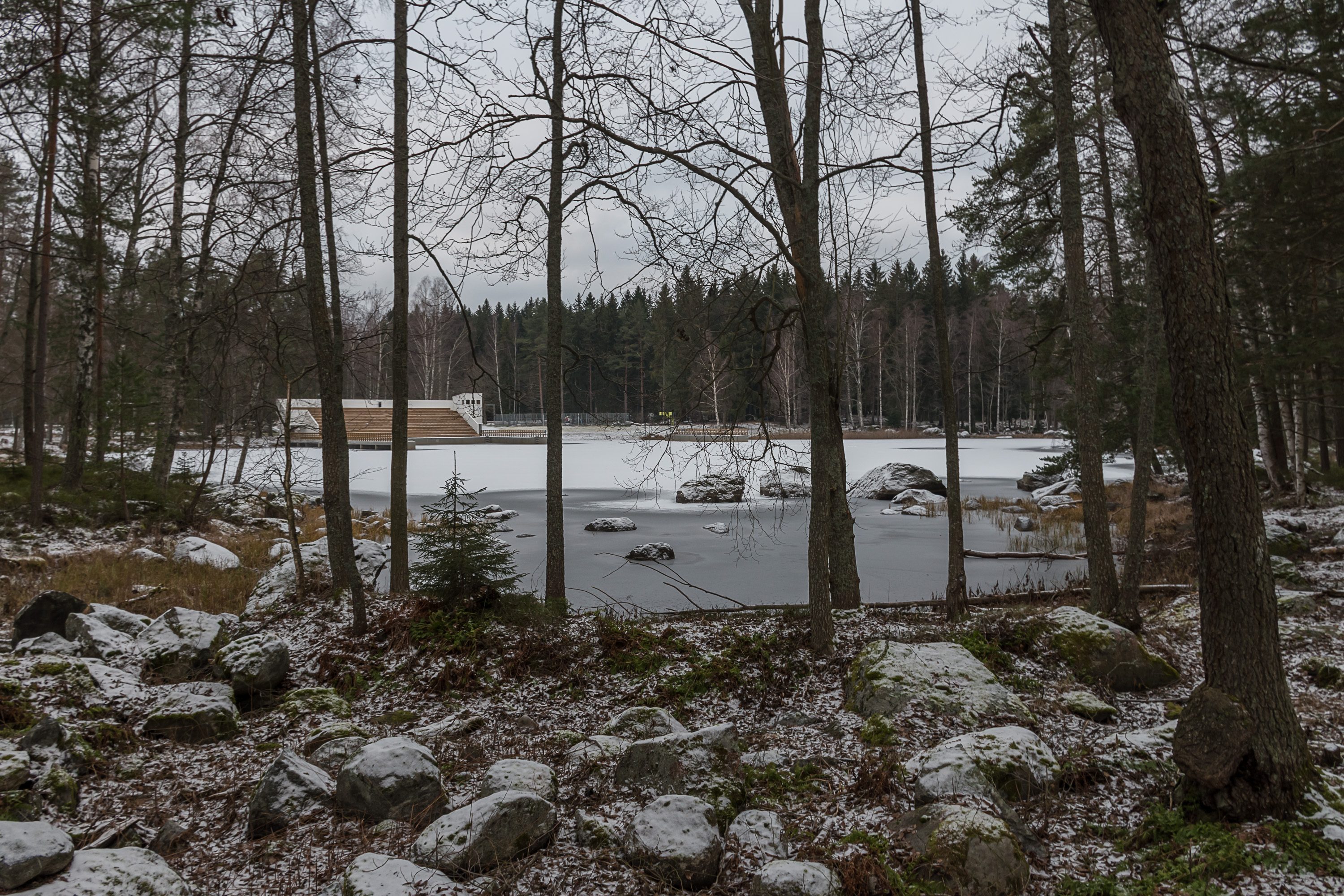 30. Посреди которого — маленькое озерцо Кирьяслампи (Kirjaslampi, фин. Пестрый пруд) с не менее маленьким водным стадионом.