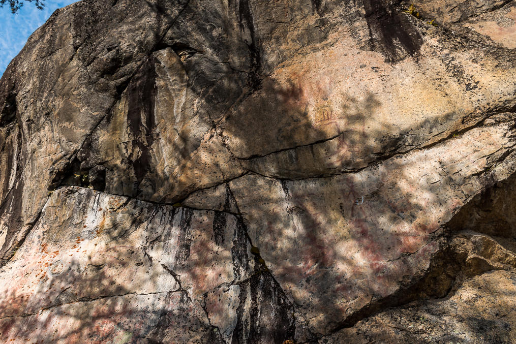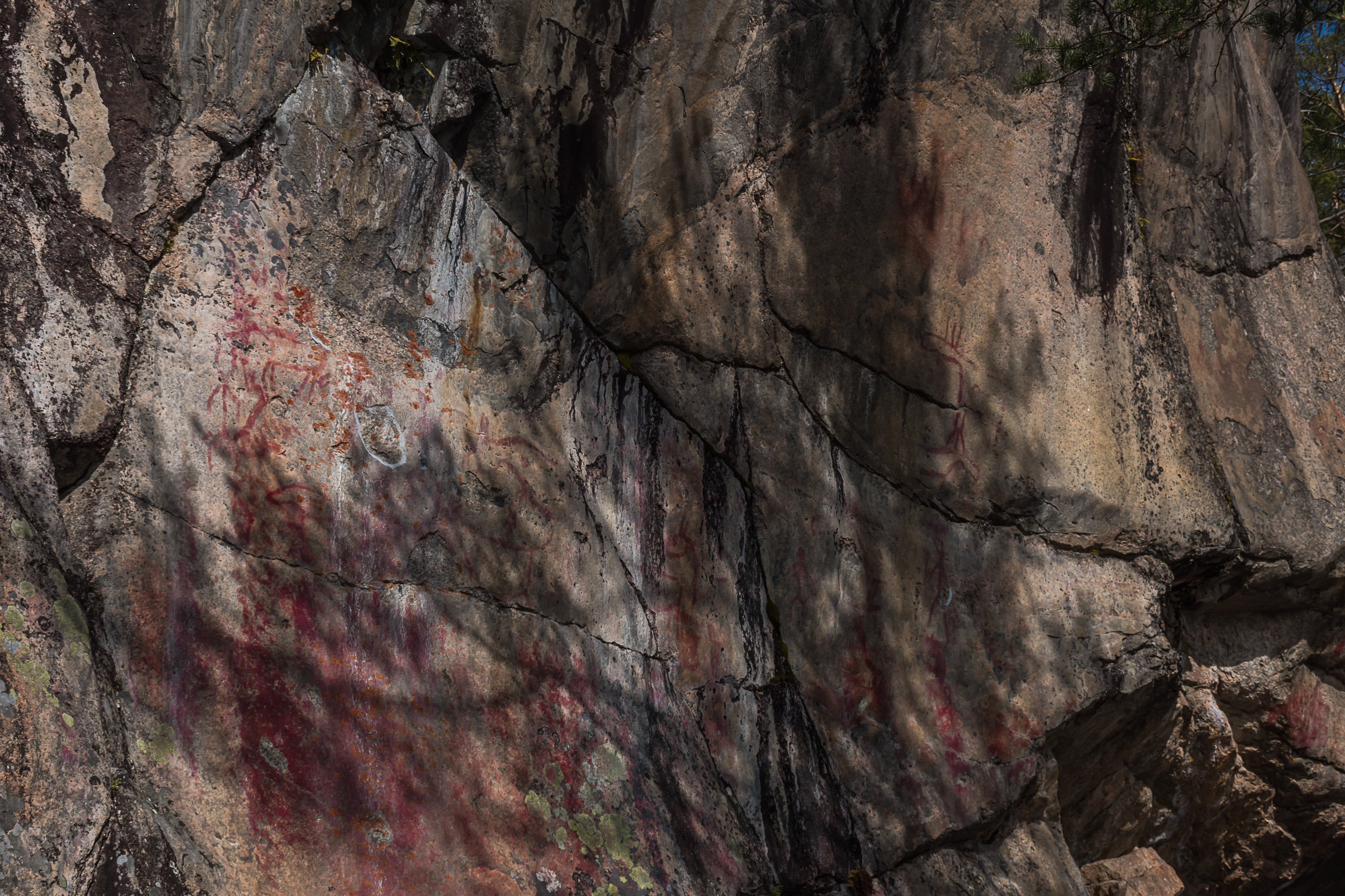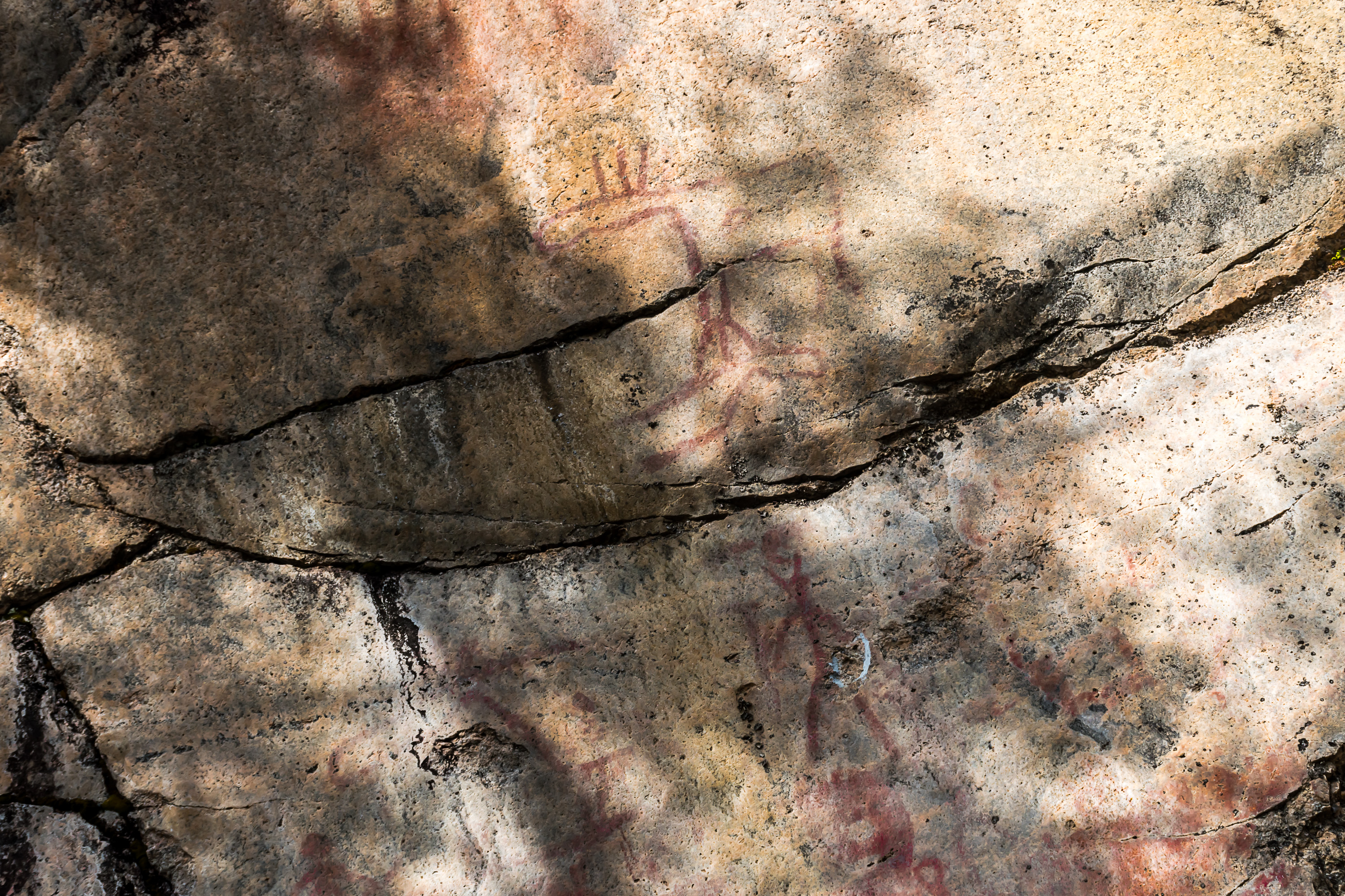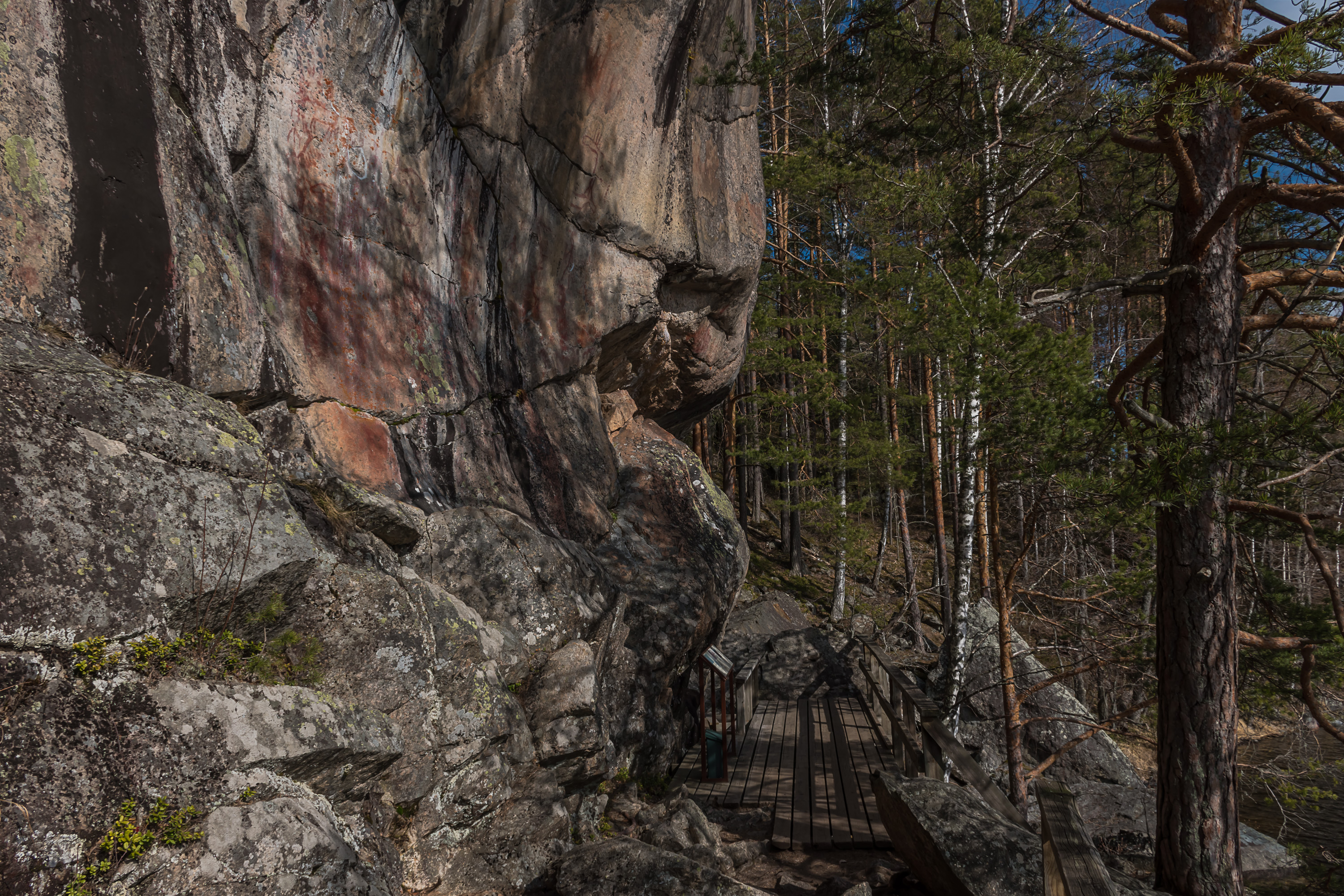 Начнем мы с самой крупной, наверное, местной природной достопримечательности — наскальных рисунков Астувансалми (Astuvansalmi, Astuvansalmen kalliomaalaukset). Вторые по размерам (по количеству фигур — 65 шт., хотя можно насчитать и больше, смотря как считать) в Финляндии. Что такое вообще наскальные рисунки? В контексте Финляндии — это сделанные доисторическим человеком и сохранившиеся до наших дней небольшие (но иногда многочисленные) рисунки красной охрой на поверхности вертикальных скал, практически всегда — на берегу озер. Я уже рассказывал и показывал про них подробнее в посте про Суомуссалми — там были наскальные рисунки Вярикаллио (Värikallio, фин. Цветная скала) в национальном парке Хосса. Процитирую себя оттуда дословно: