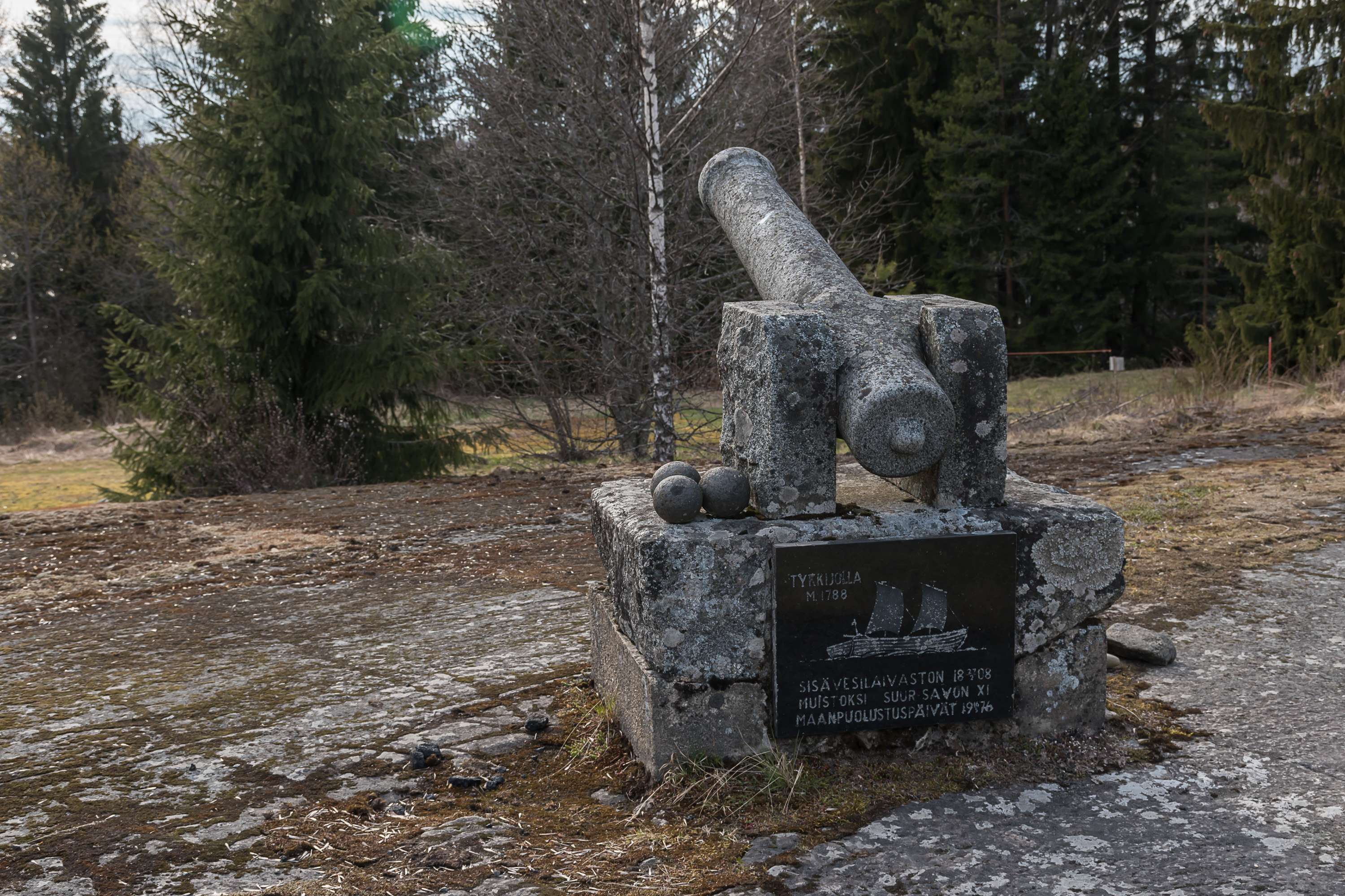 30. А рядом — каменная пушка — памятник Сайменской флотилии. С 1743 по 1809 годы граница России и Швеции проходила прямо через Сайму, и после войны 1788-1790 (Война Густава III) обе страны стали воспринимать Сайму как потенциальное поле битвы; обе завели флотилии канонерских лодок — по крайней мере у шведов они были, как нарисовано на памятнике, парусные, длиной порядка 20 м, с пушкой на корме. В Ристийне была шведская база этих лодок, коих было около десятка (еще вроде бы были в Варкаусе). Россия имела три таких базы, а также на своей стороне Саймы даже построила четыре канала (Суворовские каналы), чтоб при случае иметь возможность двигаться в обход ключевого пролива Пуумалансалми, через который проходила граница и который был хорошо укреплен шведами. Эти достопримечательности и связанные с ними небольшие сайменские крепости я не осматривал до сих пор, досадное упущение! Но так или иначе в войне эти канонерские лодки не поучаствовали; в 1808 Россия весьма предусмотрительно начала войну в феврале, когда Сайма была замерзшей, и шведские войска, отступая, всю свою флотилию были вынуждены сжечь. Ну и российской стороне каналы те тоже не пригодились в итоге, соответственно.