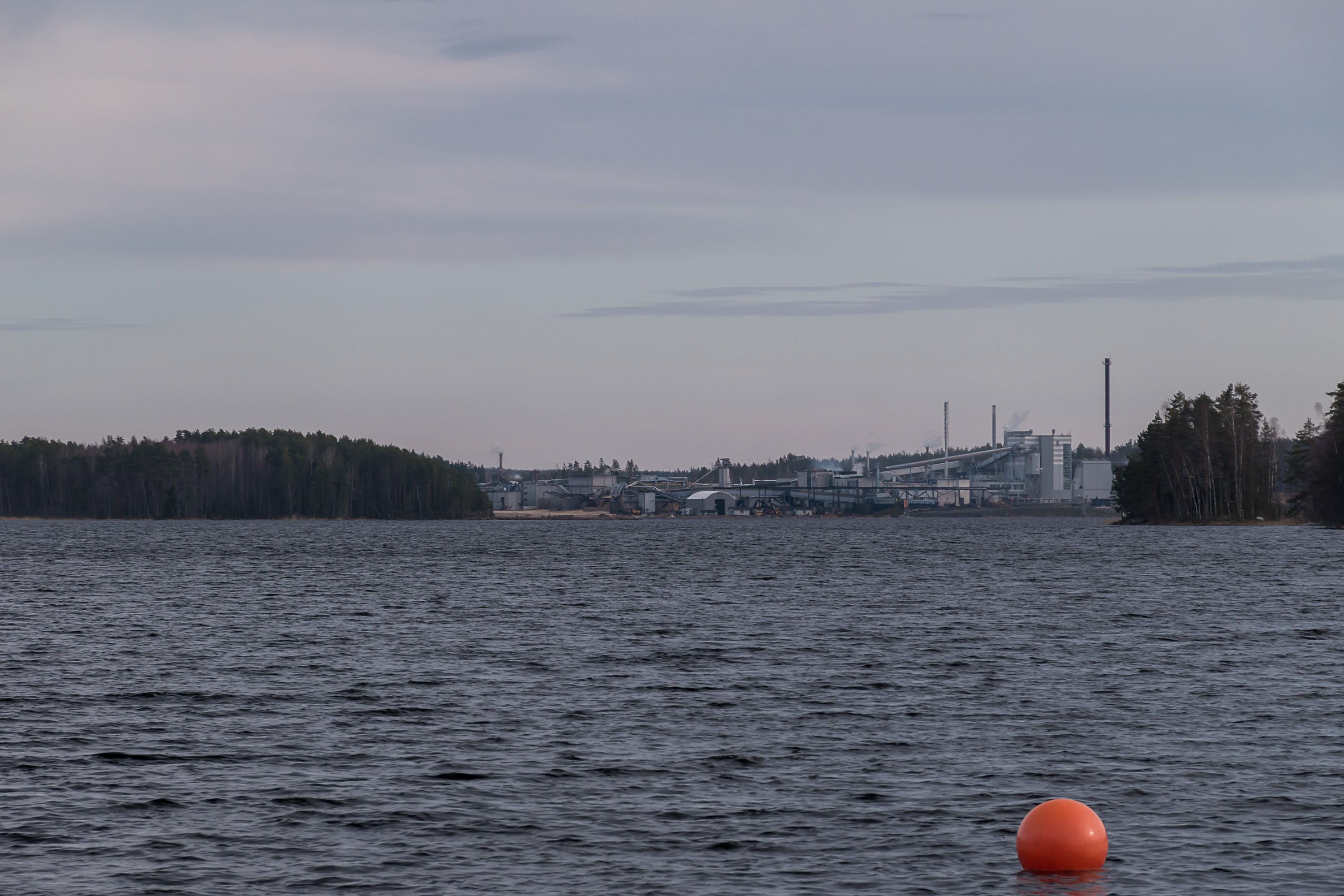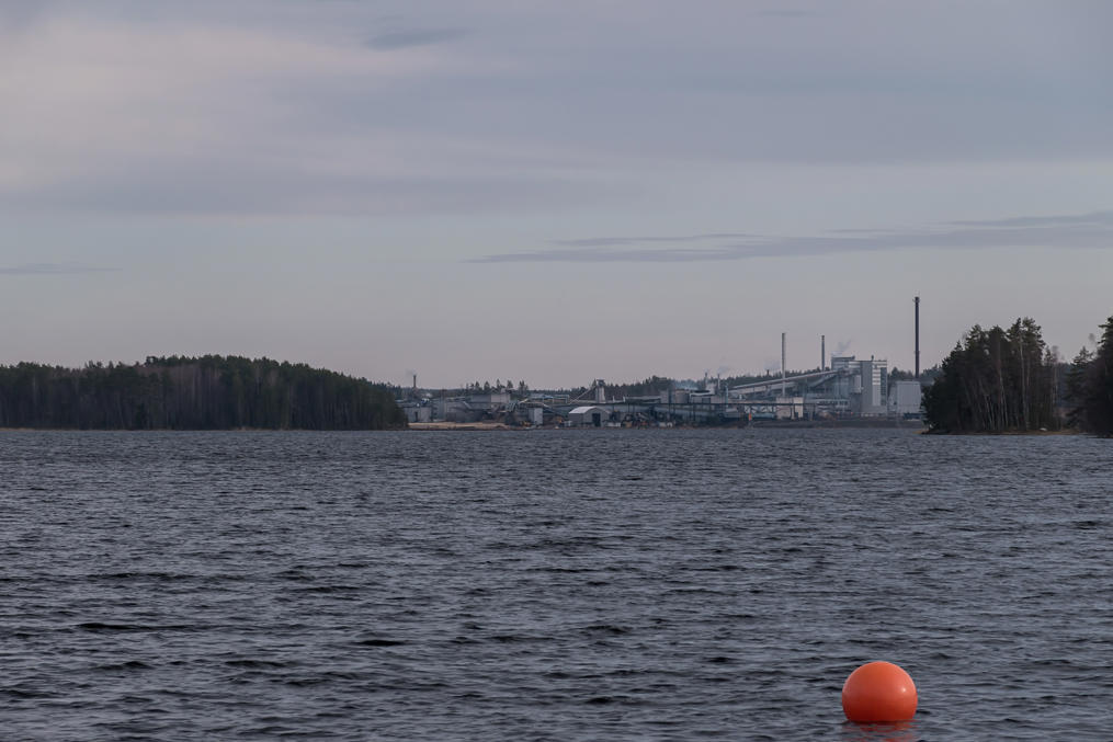 39. А по другую сторону озера виднеется главное предприятие Ристийны, Пеллосский завод. Если в самом Миккели крупной промышленности нет, то в относящейся к нему теперь административно Ристийне — вполне себе — фанерный завод на мысе Пеллосниеми у деревни Пеллос (Pellos), основанный в 1964 году и ныне принадлежащий корпорации UPM. Ранее был также завод ДСП, он закрылся в 1994, зато производство фанеры с тех пор только расширялось. Из самой Ристийны до завода ехать 7 км, зато у него есть собственная 21-километровая железнодорожная ветка от Савонской ж/д, и озерная гавань; это как раз одно из предприятий, пользующихся водным транспортом на Сайме, более того, наряду с Каукасским заводом в Лаппеенранте сюда по Сайме до сих пор ведется лесосплав. Вот с вывозом готовой продукции теперь, скорее всего, будет сложнее; из-за Известных Событий Сайменский канал, обеспечивающий связь Саймы с морем, но частично находящийся на российской территории, может быть теперь закрыт Россией в любой момент, и по крайней мере в 2022 никто не хочет заводить свои суда с моря в Сайму, рискуя, что в любой момент они могут там оказаться в ловушке.