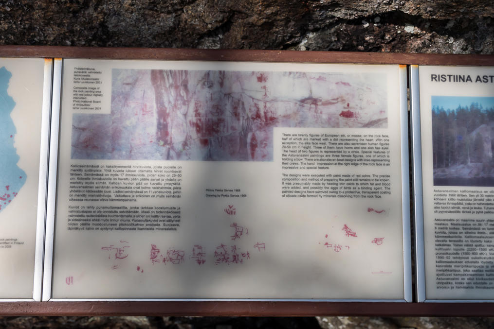 Всего в стране известно около 100 наскальных рисунков, в основном на юго-востоке, но также и на востоке (как здесь [в Суомуссалми]) или юге. Большинство рисунков маленькие, с всего одной или несколькими фигурками. Сколько рисунков уничтожены временем или еще никем не открыты — можно только гадать. Поразительно, что вообще хоть какие-то рисунки охрой, сделанные доисторическими людьми, пережили тысячелетия, осадки и эрозию, деятельность микроорганизмов, мхов, лишайников и других людей, и видны до сих пор.