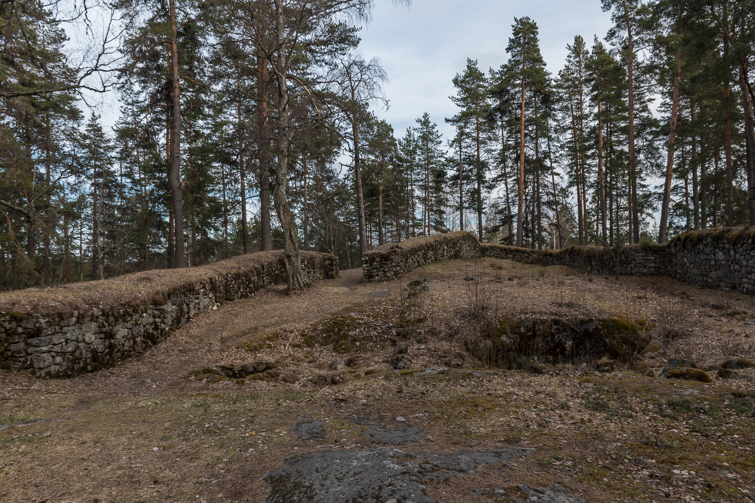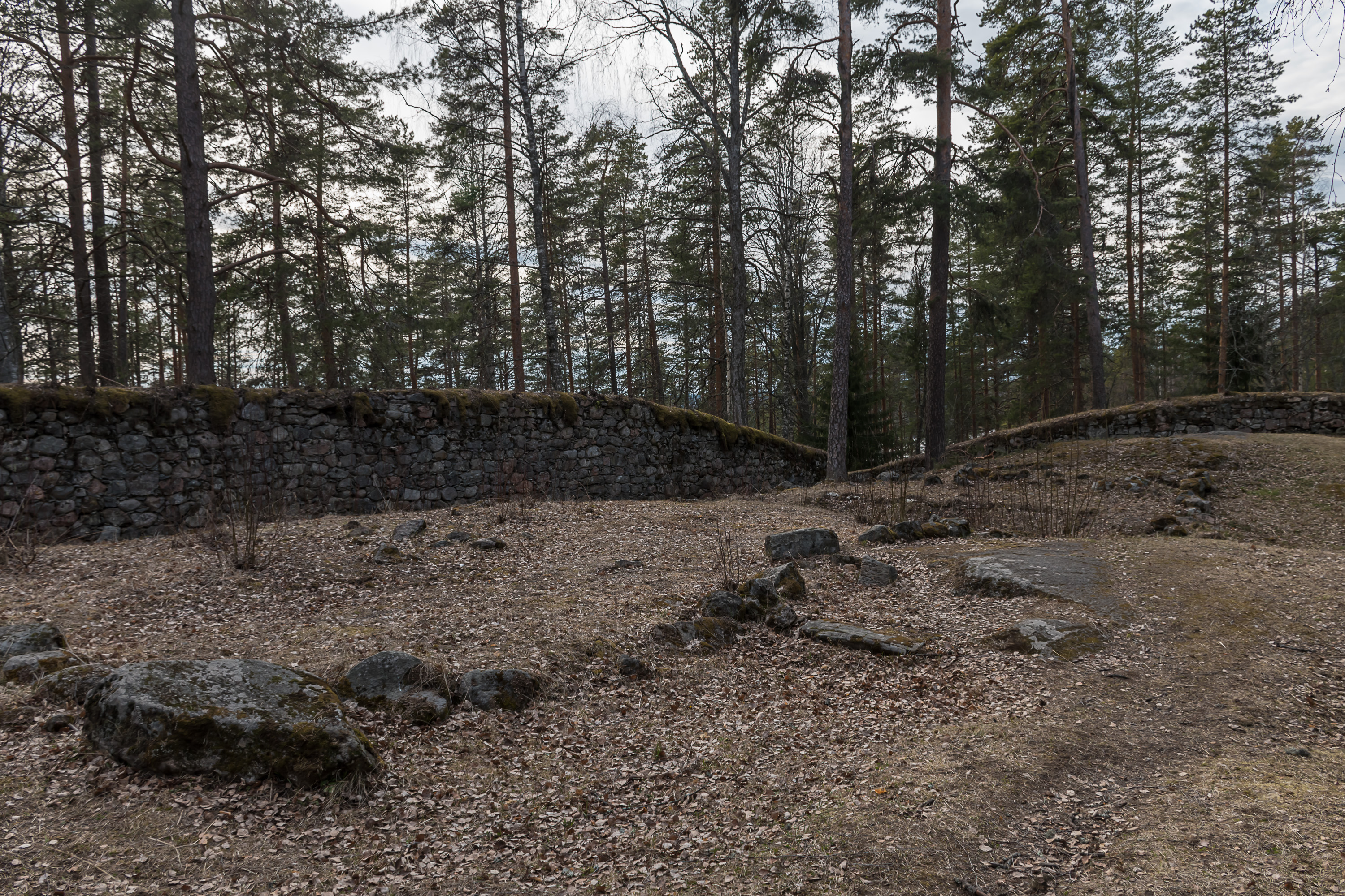 21. И как и в Каяани, Браге построил в Ристийне себе замок, ну или замок — громко сказано, оборонительной функции он не нес; но во всяком случае была большая усадьба, которую так и звали Брахелинна (Brahelinna) — Замок Браге — или по-шведски Брахеслотт (Braheslott). Строили его долго и печально, закончили только в 1669. Сама Брахелинна была двух-трехэтажным зданием, примерно 10x20 м, с 15-20 комнатами, с первым этажом из камня и выше из дерева. Ее окружала невысокая каменная стена. Вот на фото и видно стену и немного остаток фундамента.