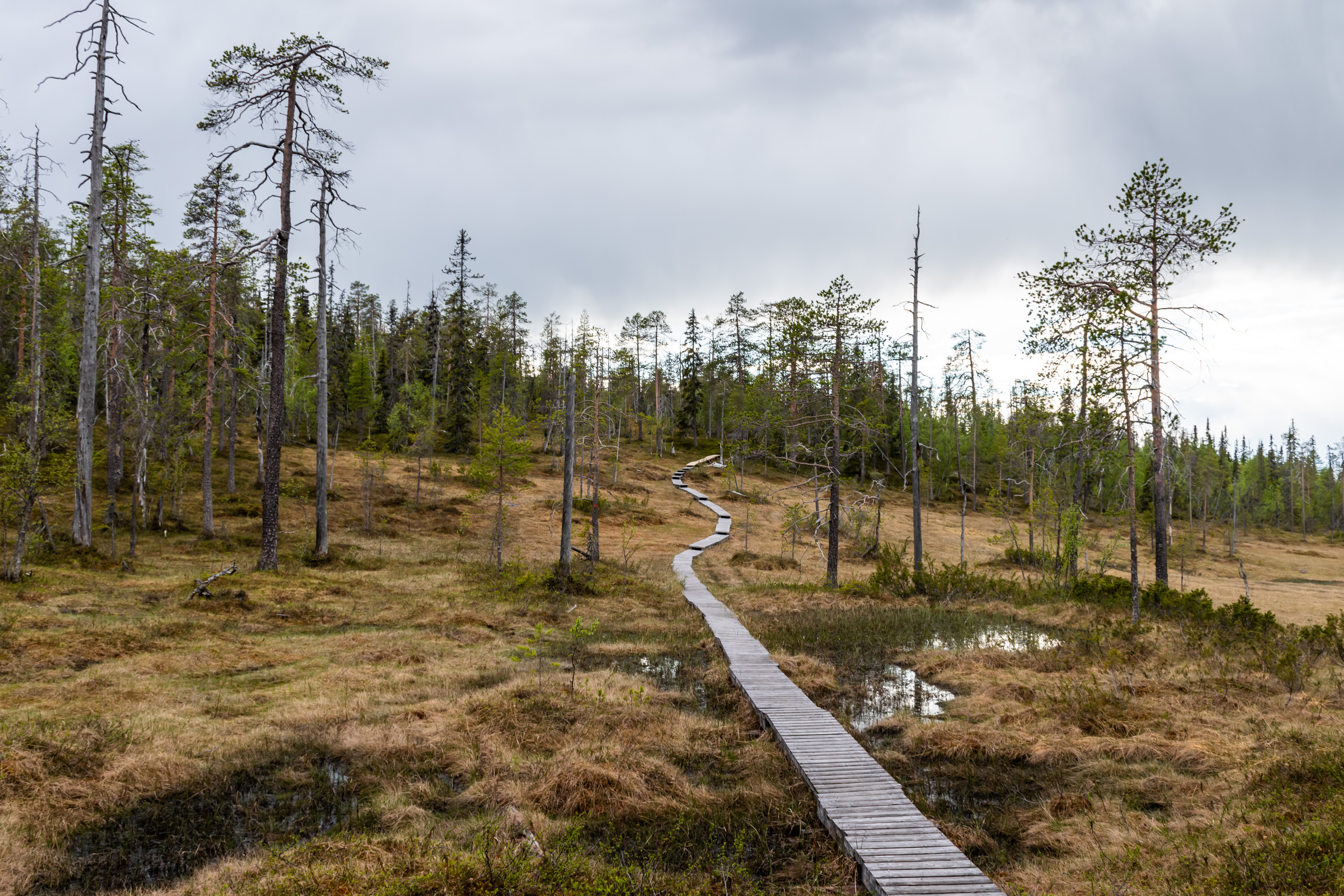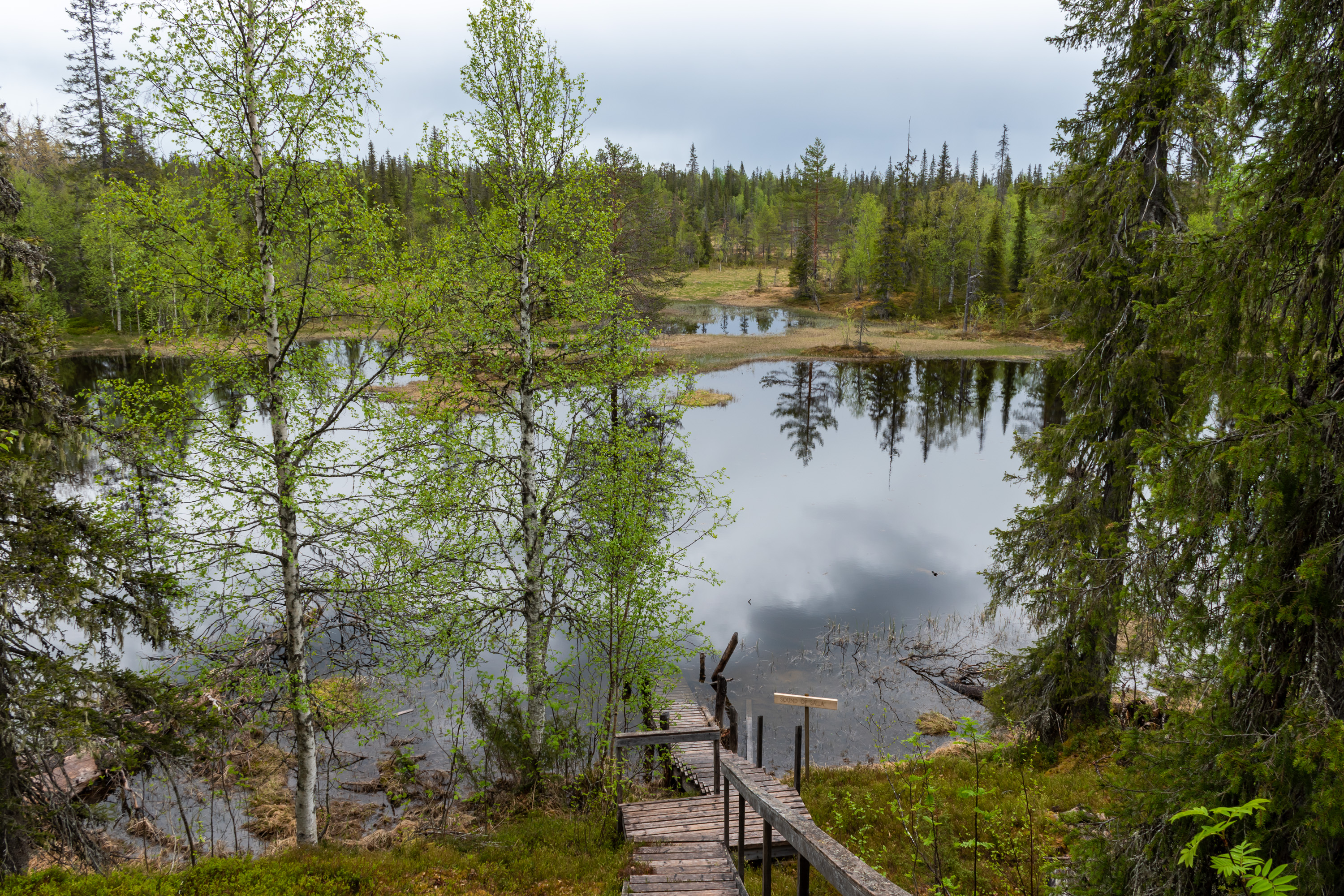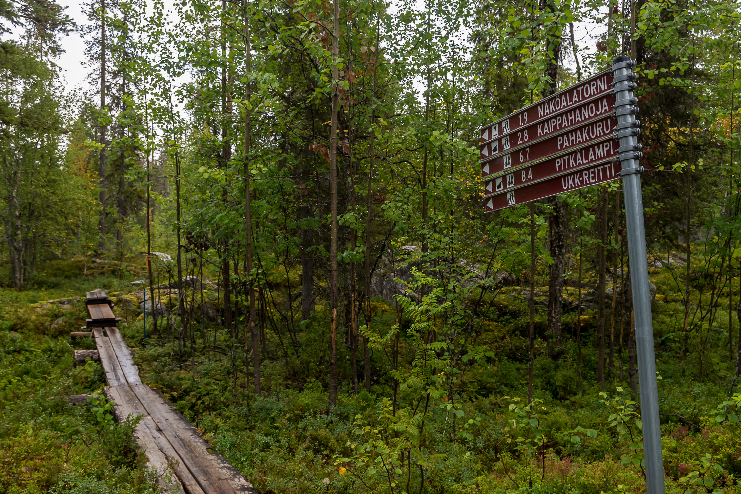На данный момент в национальном парке ведутся относительно масштабные работы — походные тропы и места привалов обновляют. Для официального открытия национального парка в июне 2022, честно говоря, было еще рановато — из-за этих работ даже маршрут на вершину Исо-Пюхятунтури был закрыт. Эти фото сделаны в 2020 году; я тогда ехал из Куусамо в Инари, и заехал сюда, чтоб по-быстрому забраться на вершину. Тропа (1.9 км в одну сторону) начинается с небольшой стоянки в конце дороги между Исо- и Пиени-Пюхятунтури, на высоте около 300 м над уровнем моря.