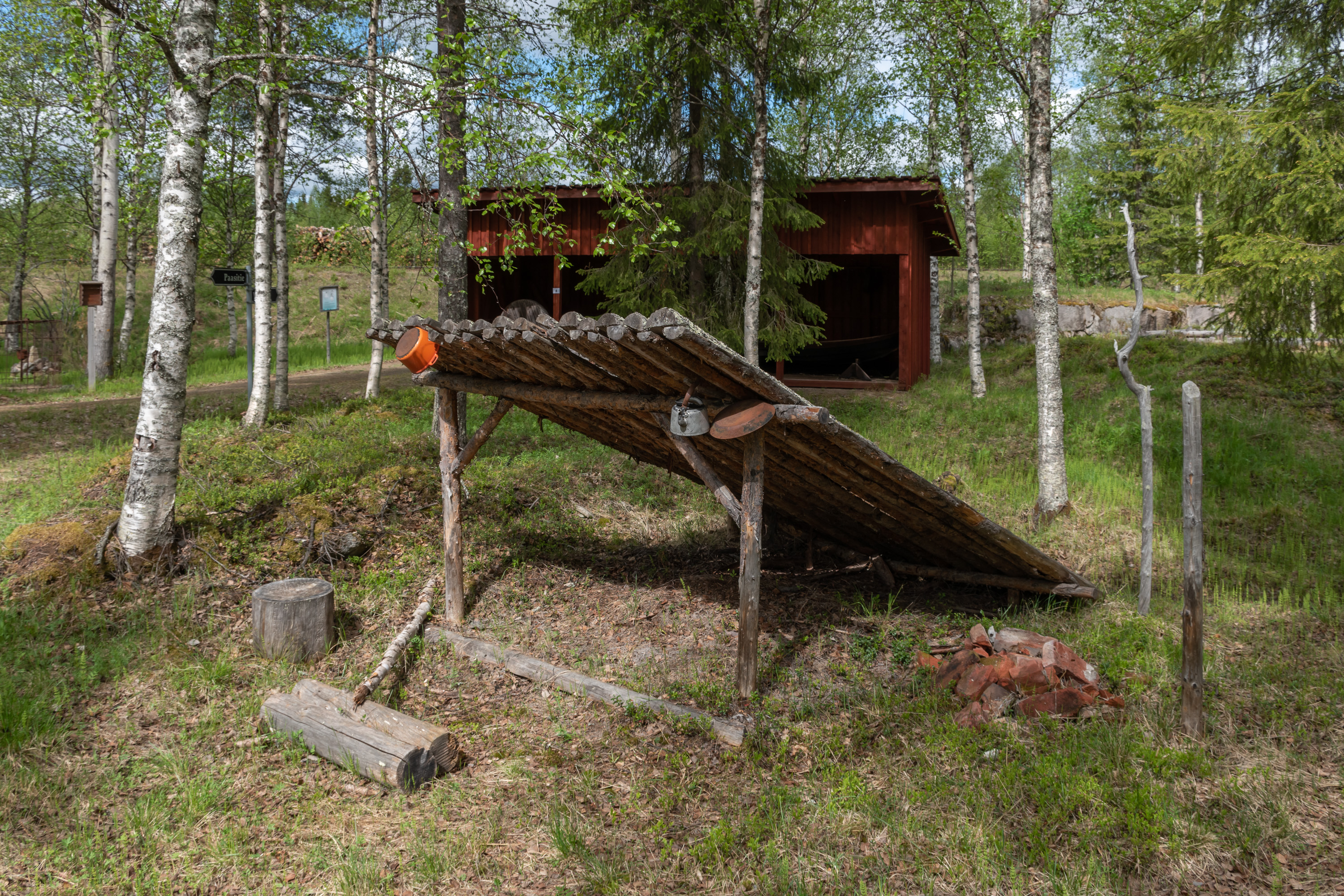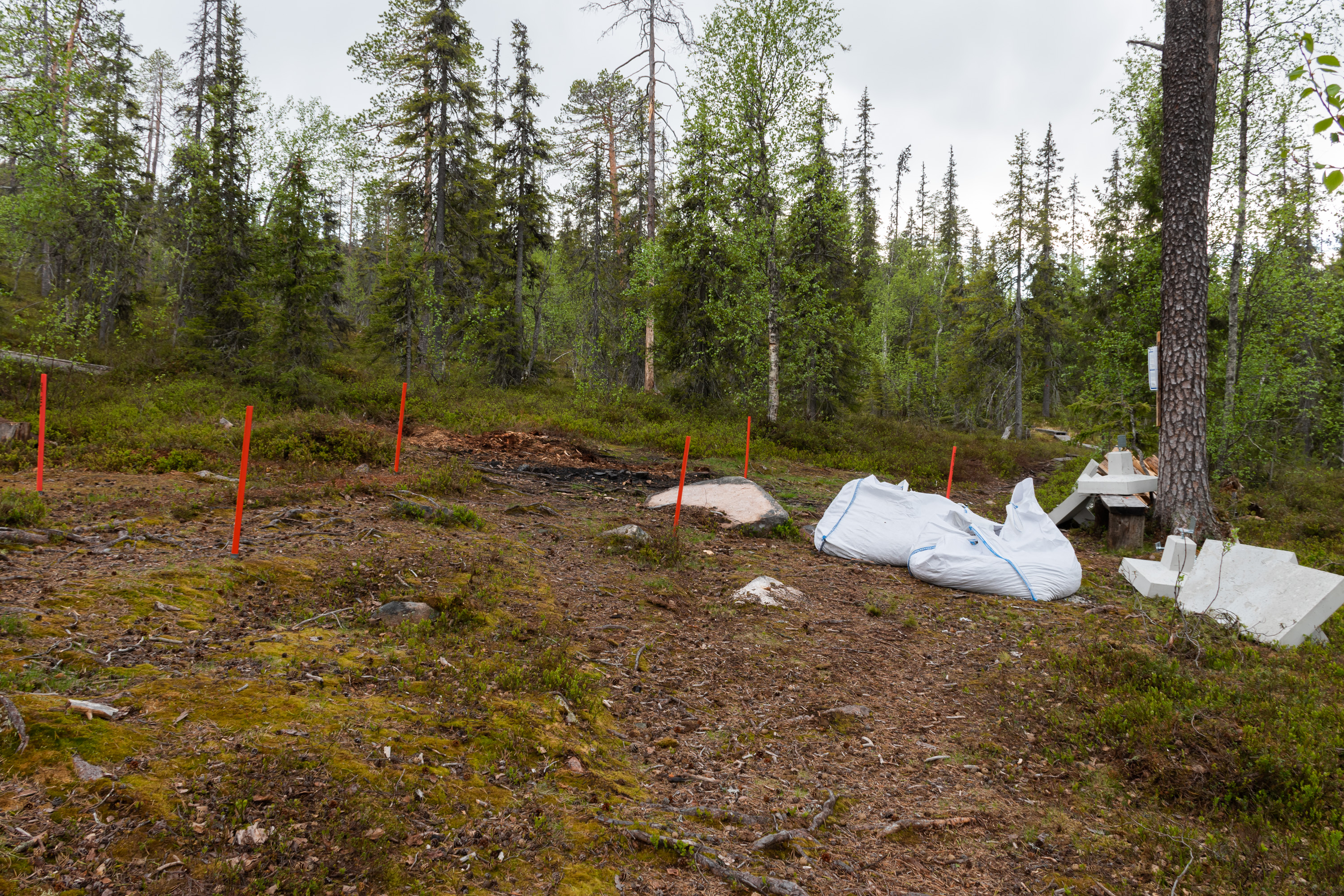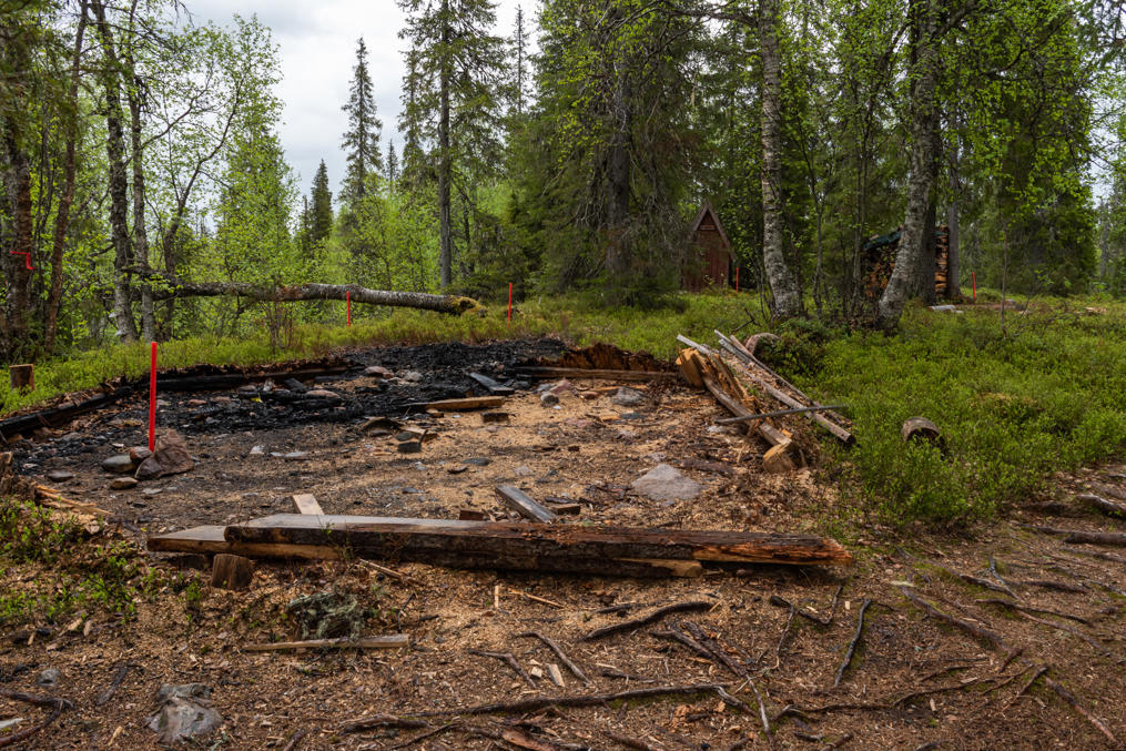 56. Несколько навесов-лааву по пути снесены и строятся заново. Точнее, это лааву, точнее чум-кота Кюльмяхете (Kylmähete, фин. Холодный родник), по-видимому вообще еще и сгореть успел.