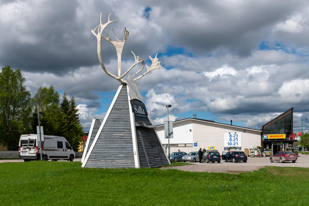 7. Встреча культур! Слева же нарисован саам, в традиционном саамском костюме и шапке. Но на самом деле саамов — коренного народа Лапландии — в Салле нет, и не было уже много веков (так что это культурная апроприация :). Ближайшее место, где саамы живут в наши дни — деревня Вуотсо (Вуохччу, Vuotso, Vuohčču), в Соданкюля, в 150 км отсюда по прямой на северо-запад.