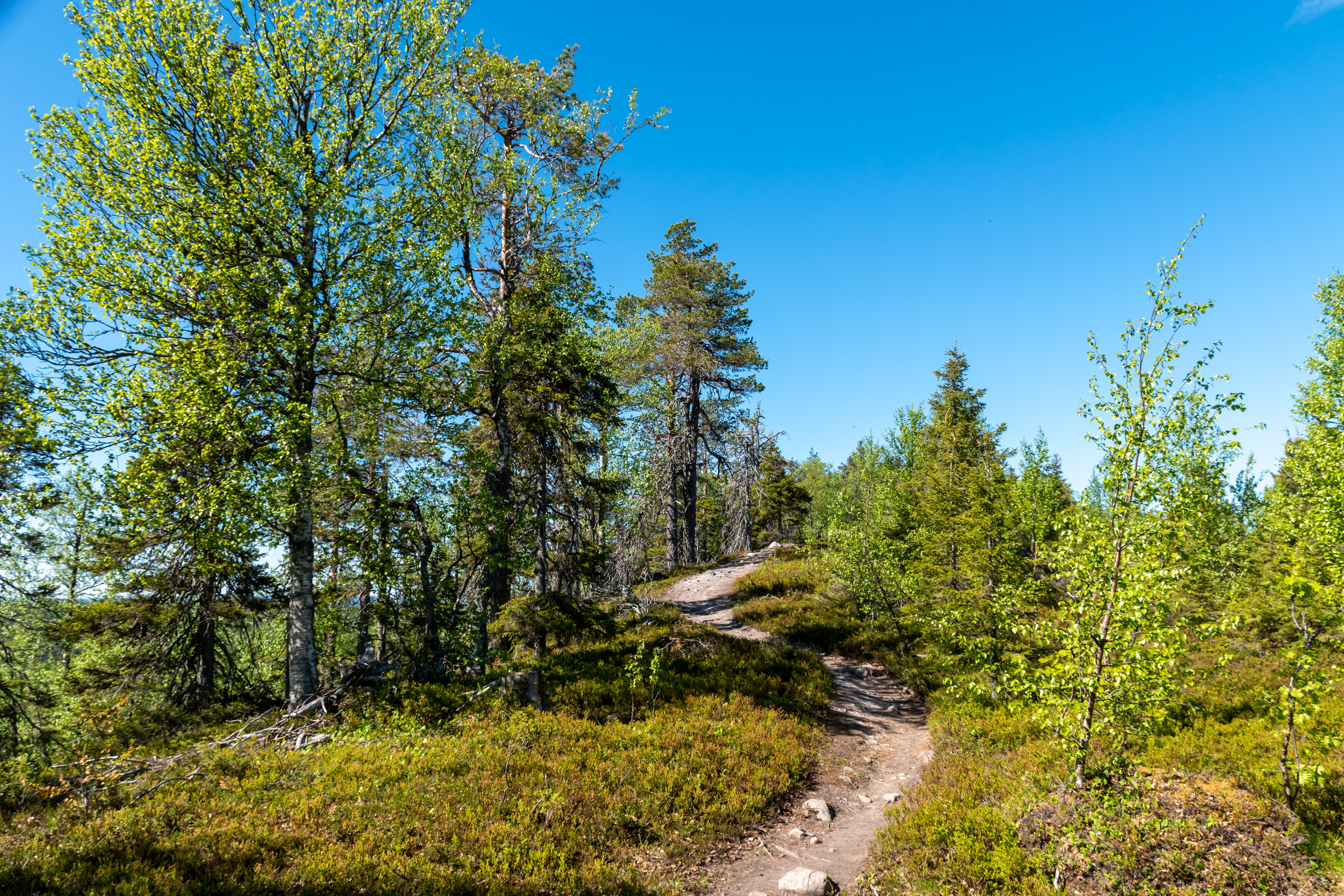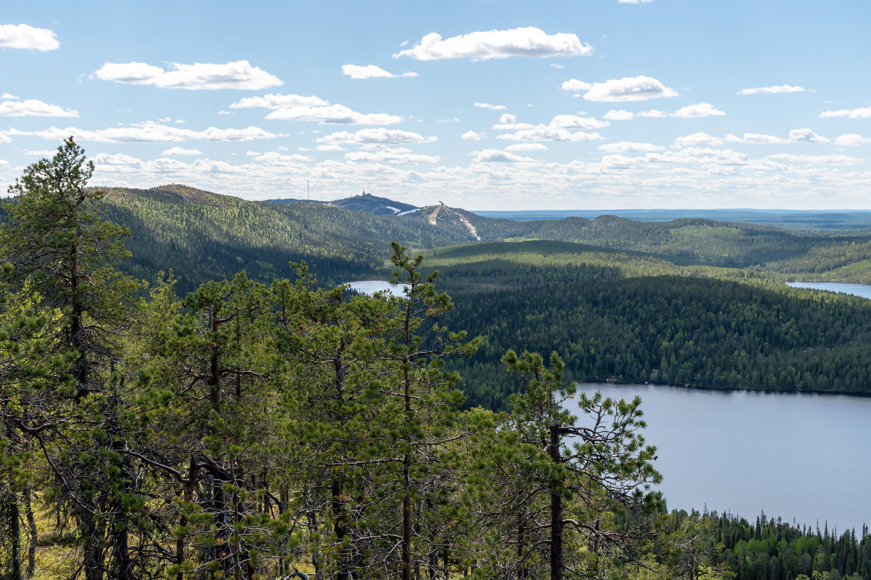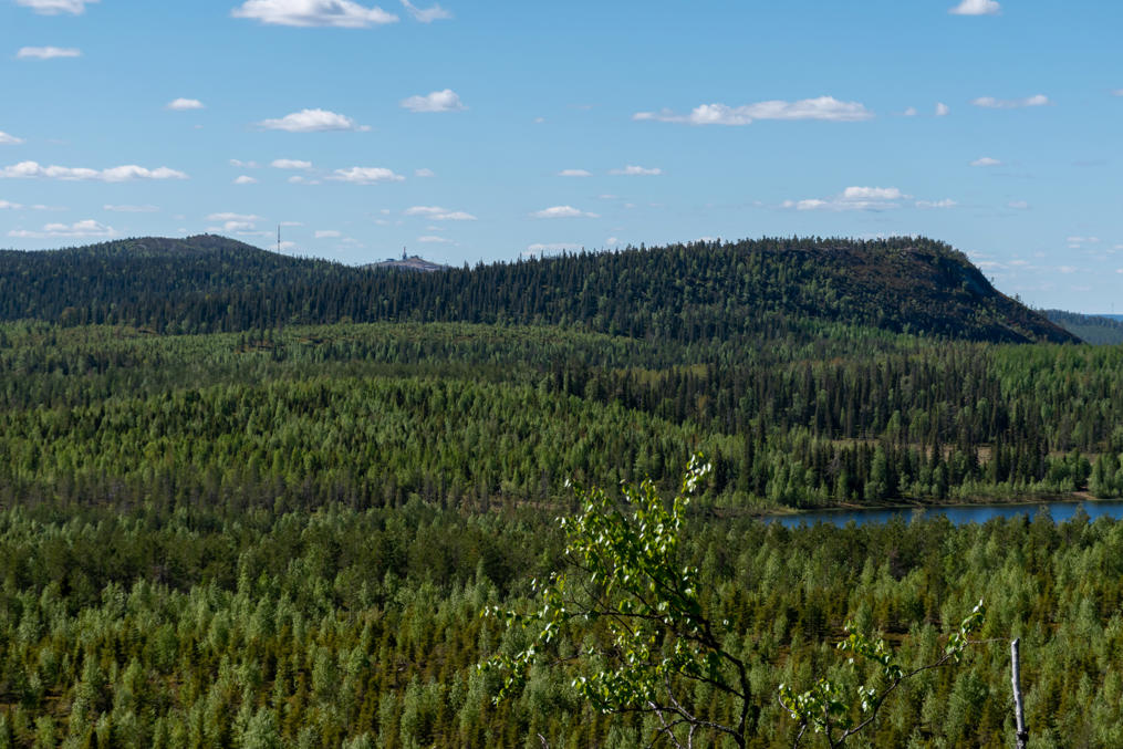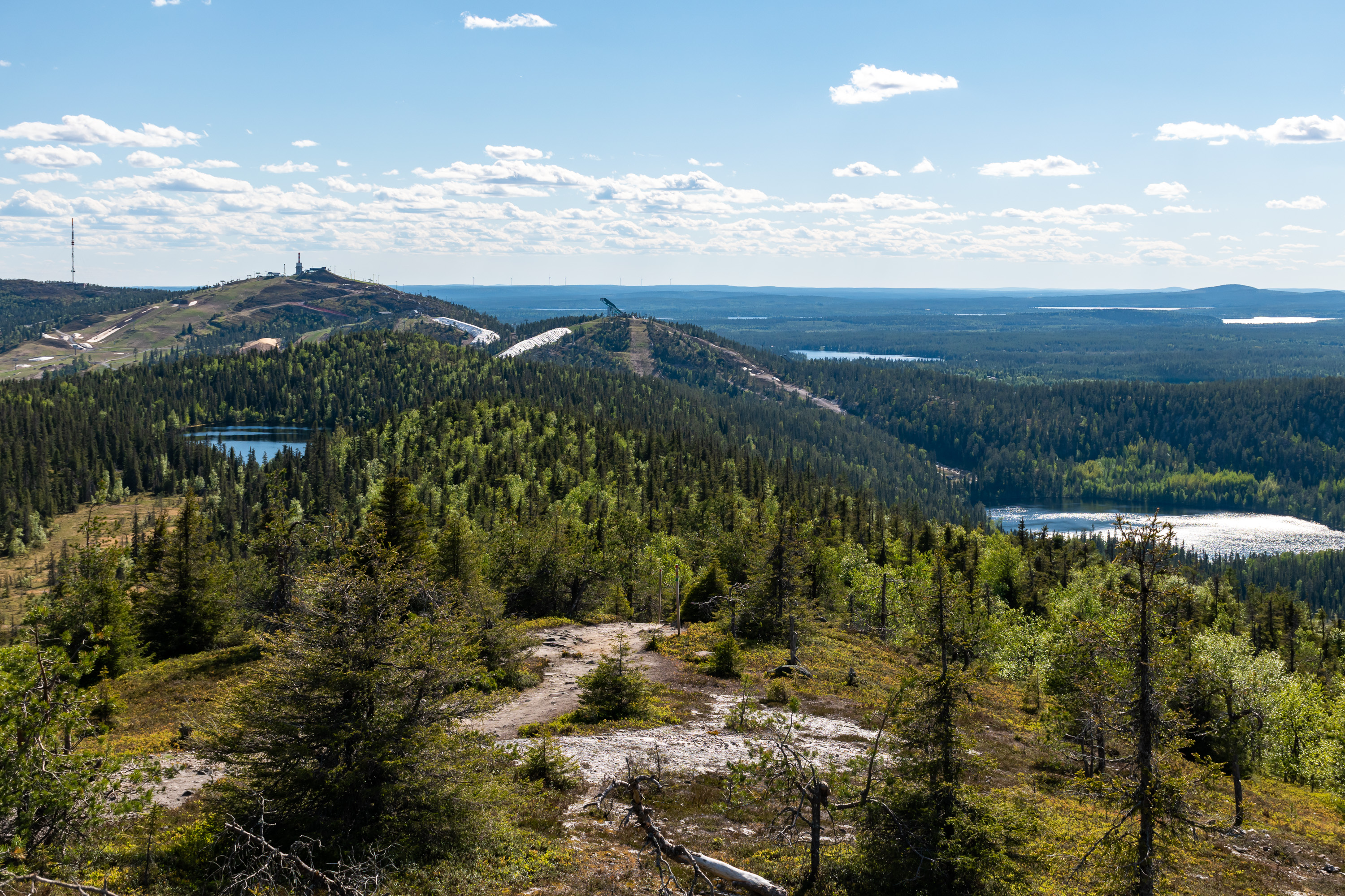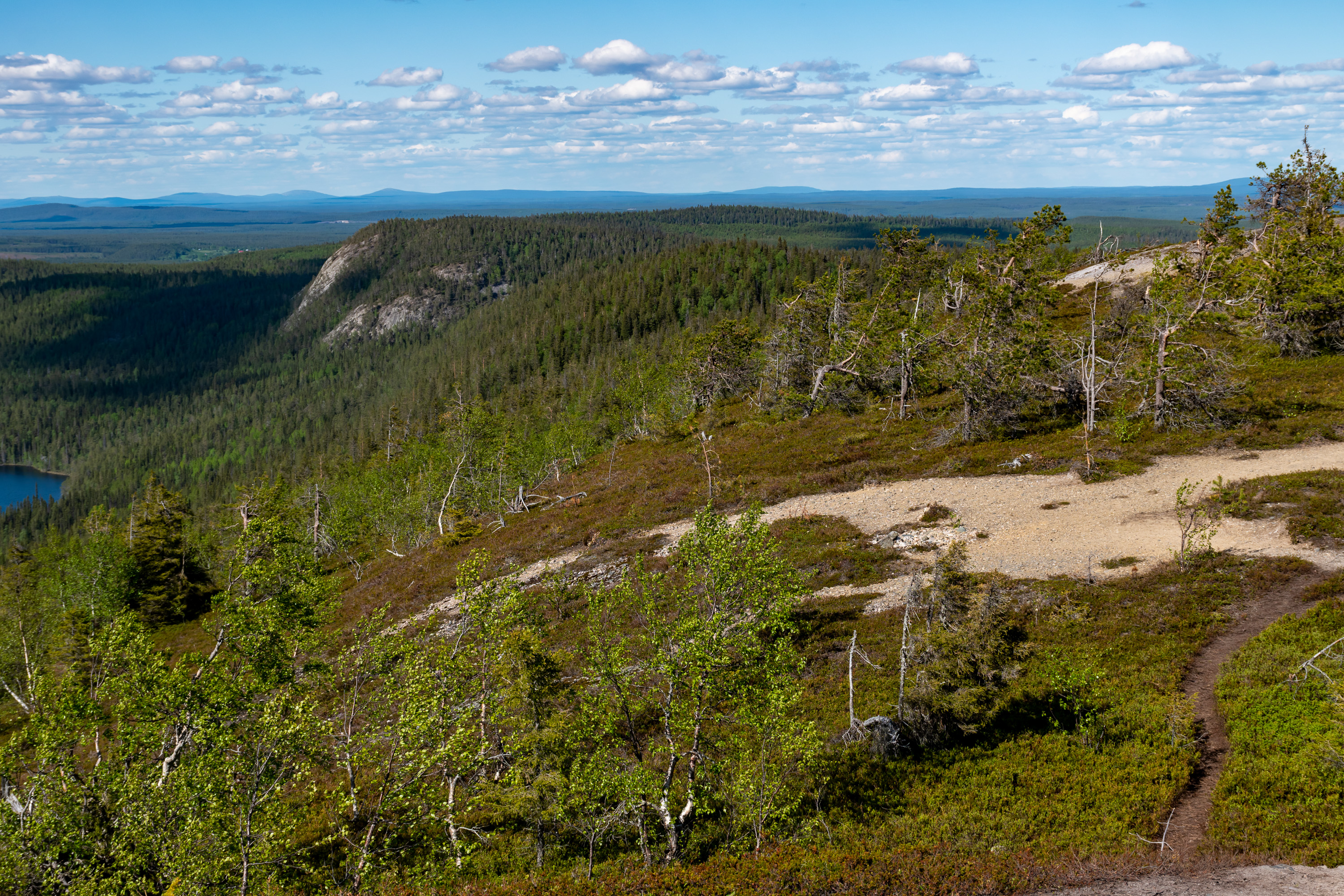 65. Вершина горы — на высоте 410 м над уровнем моря. На этой высоте лес уже начинает редеть, и виды отсюда неплохие; на юге видны следующие горы. Справа — Конттайнен, слева — Валтаваара, и на заднем плане выглядывает Рукатунтури с лыжными подъемниками.