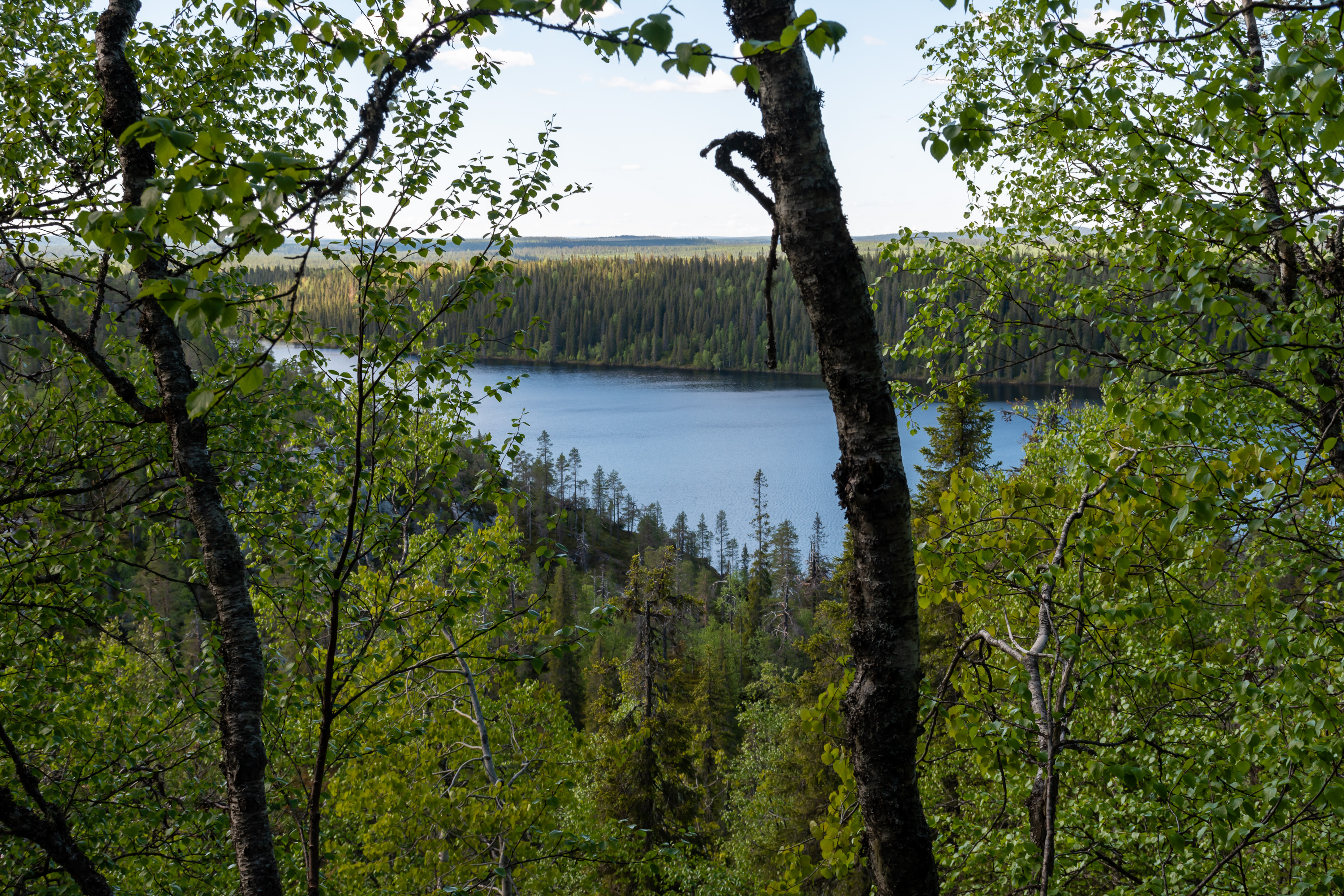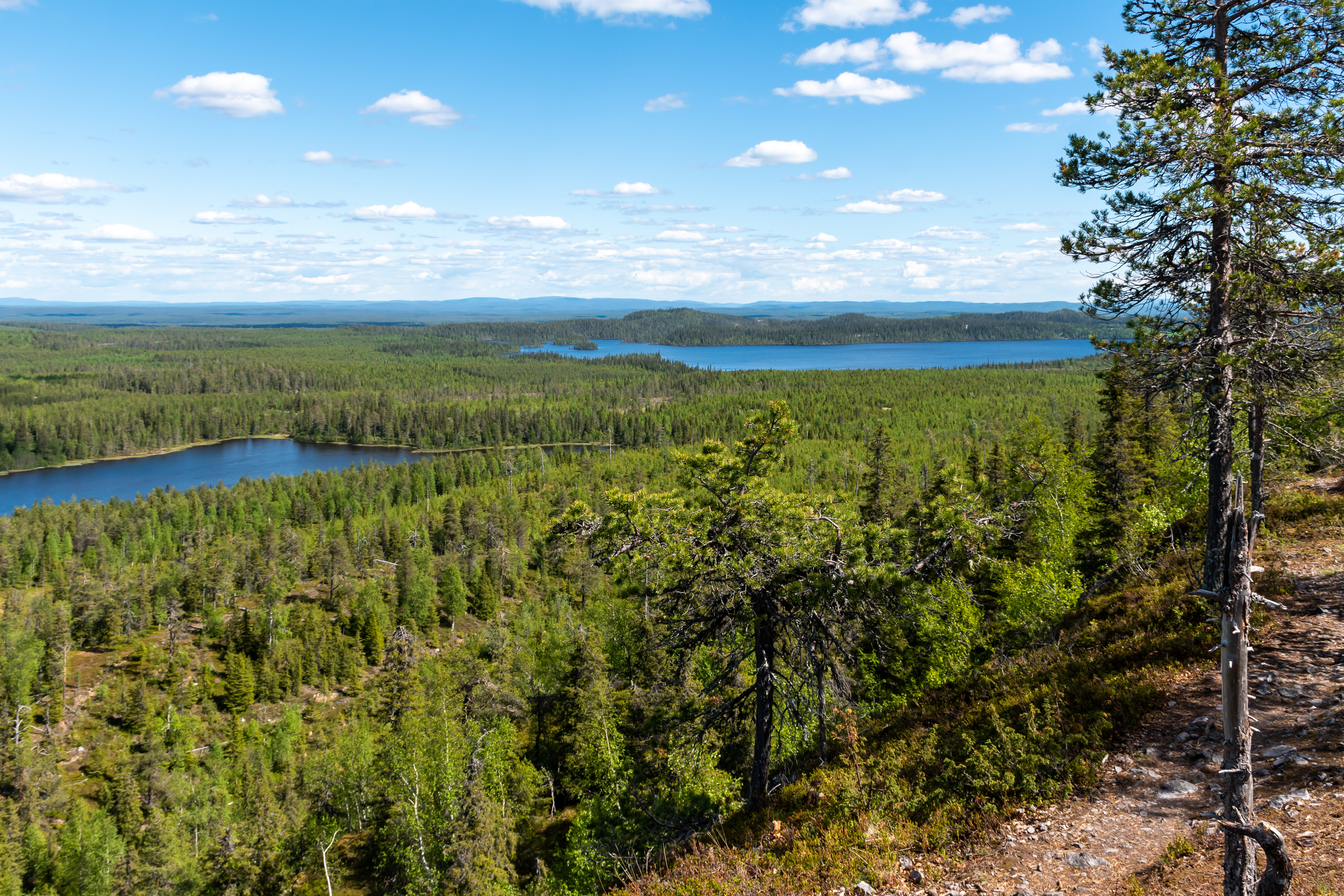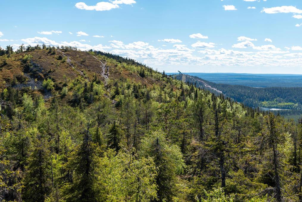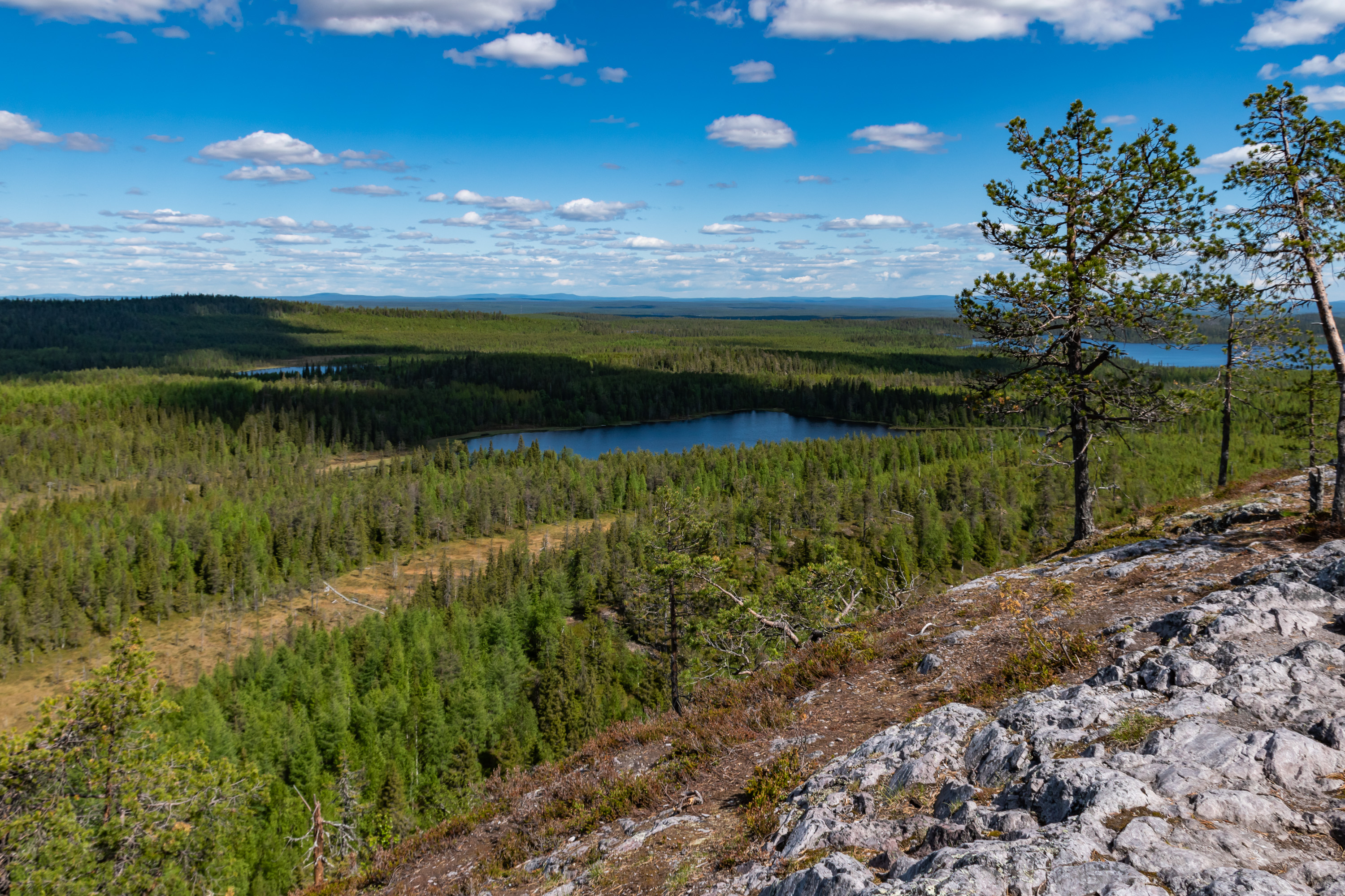 65. Вершина горы — на высоте 410 м над уровнем моря. На этой высоте лес уже начинает редеть, и виды отсюда неплохие; на юге видны следующие горы. Справа — Конттайнен, слева — Валтаваара, и на заднем плане выглядывает Рукатунтури с лыжными подъемниками.