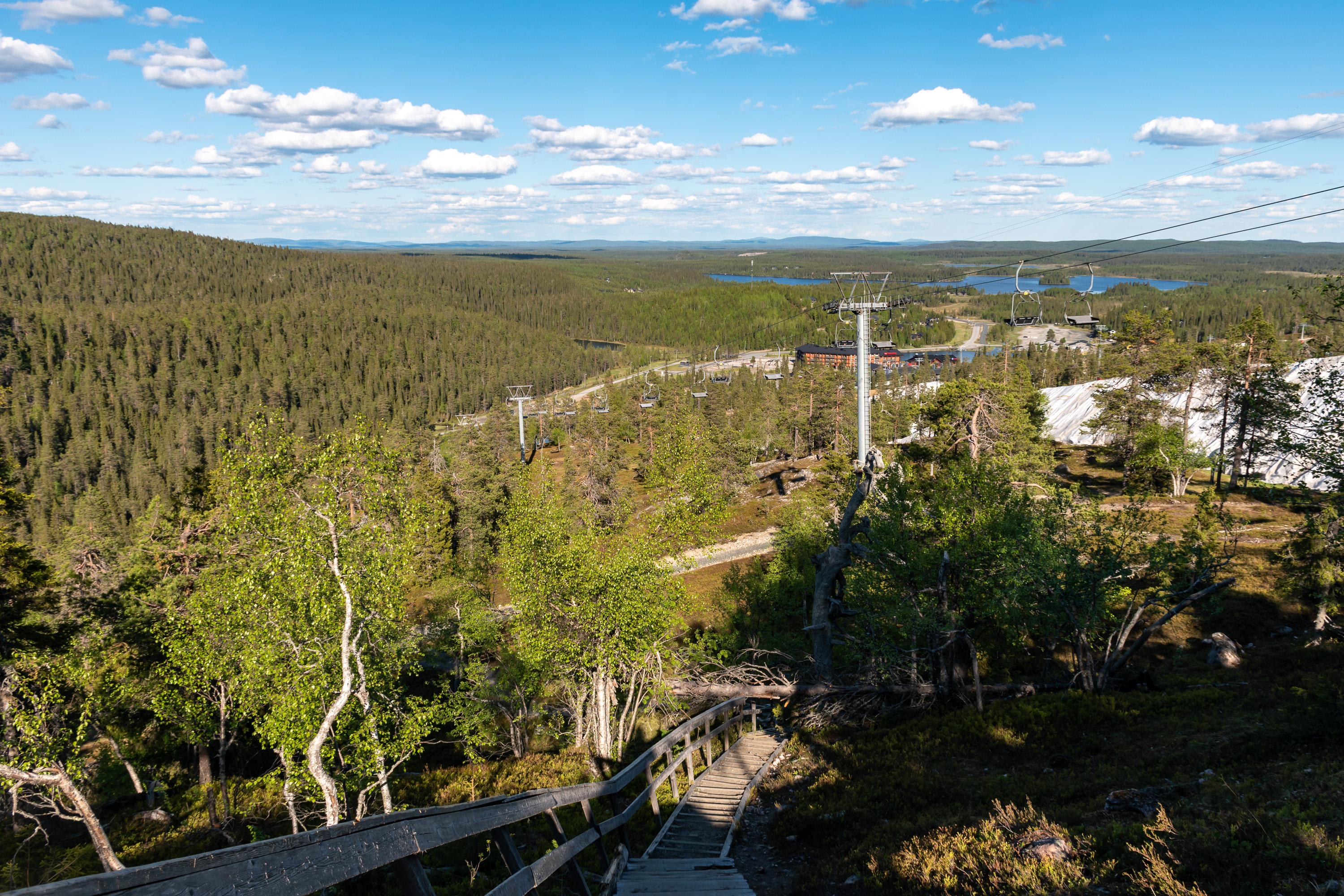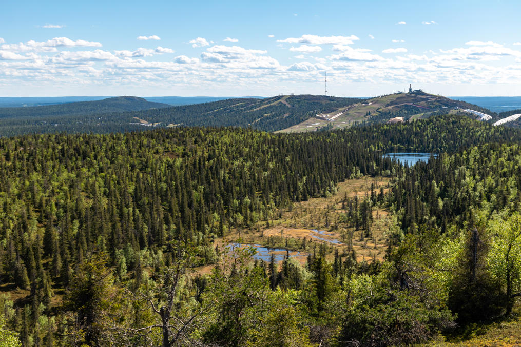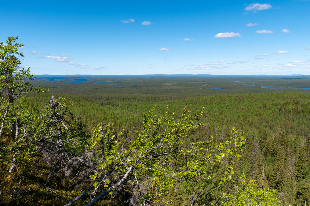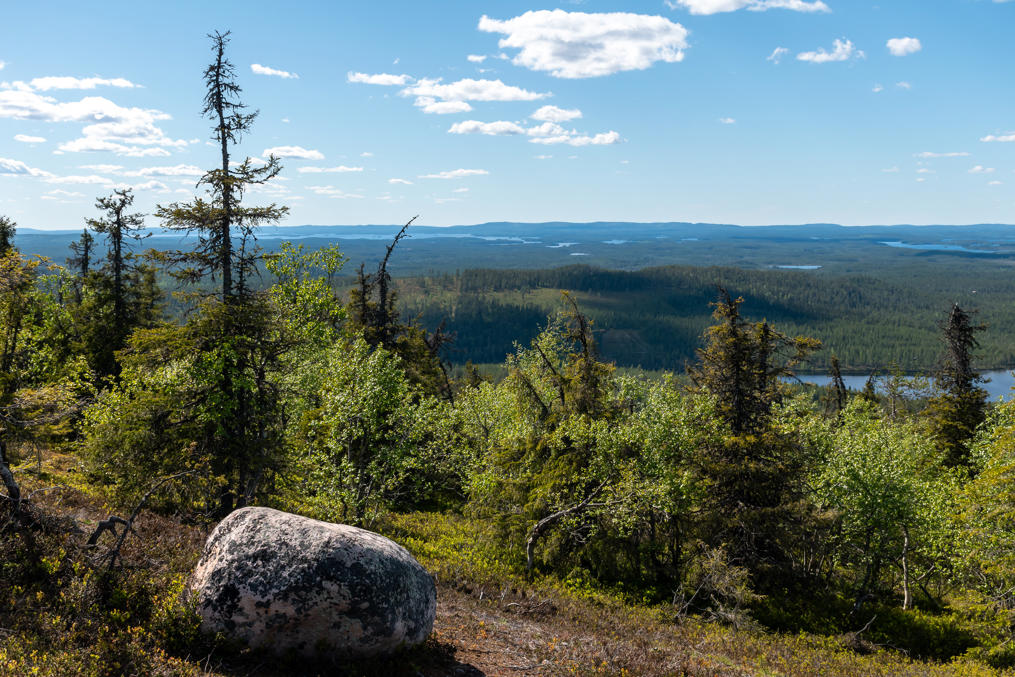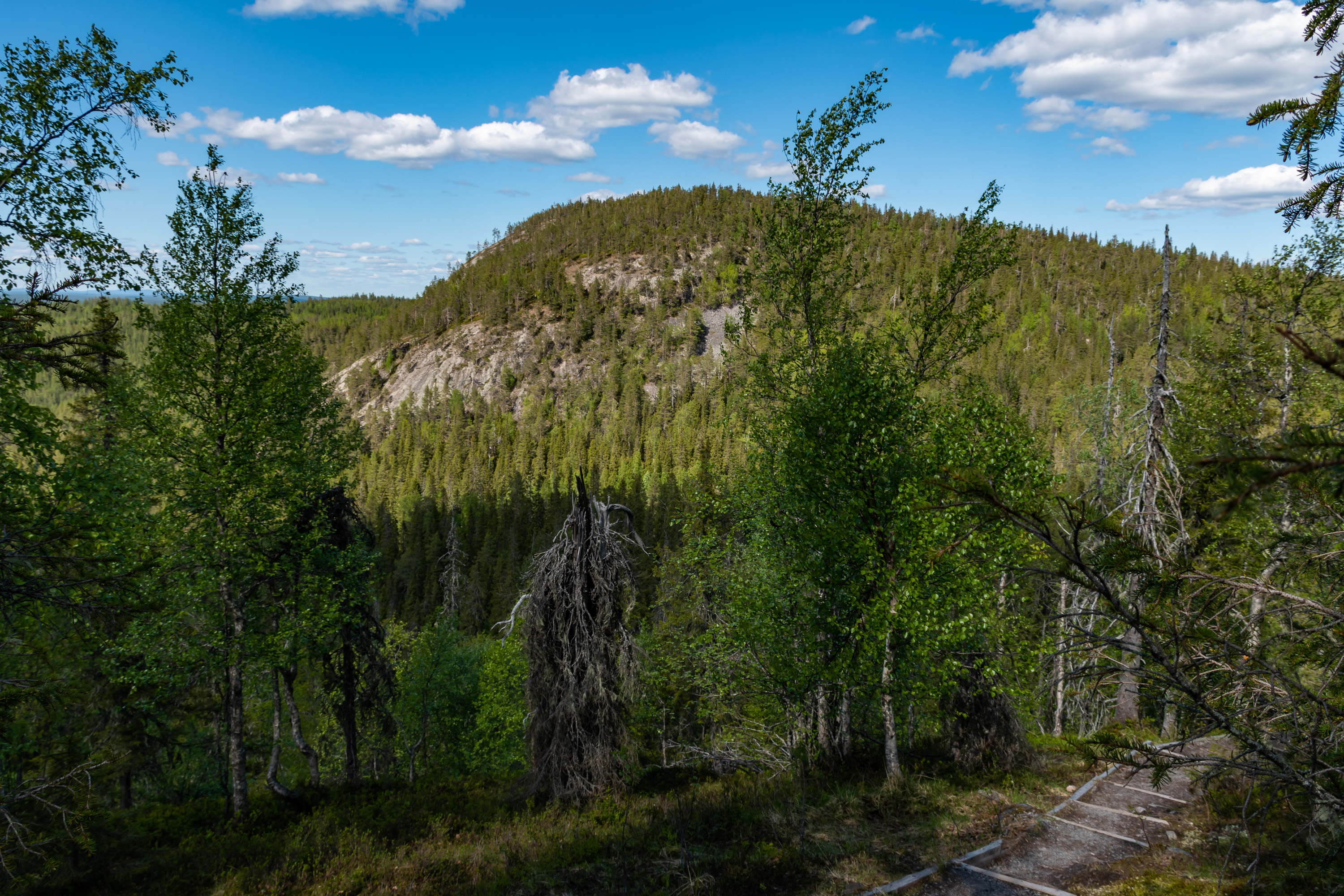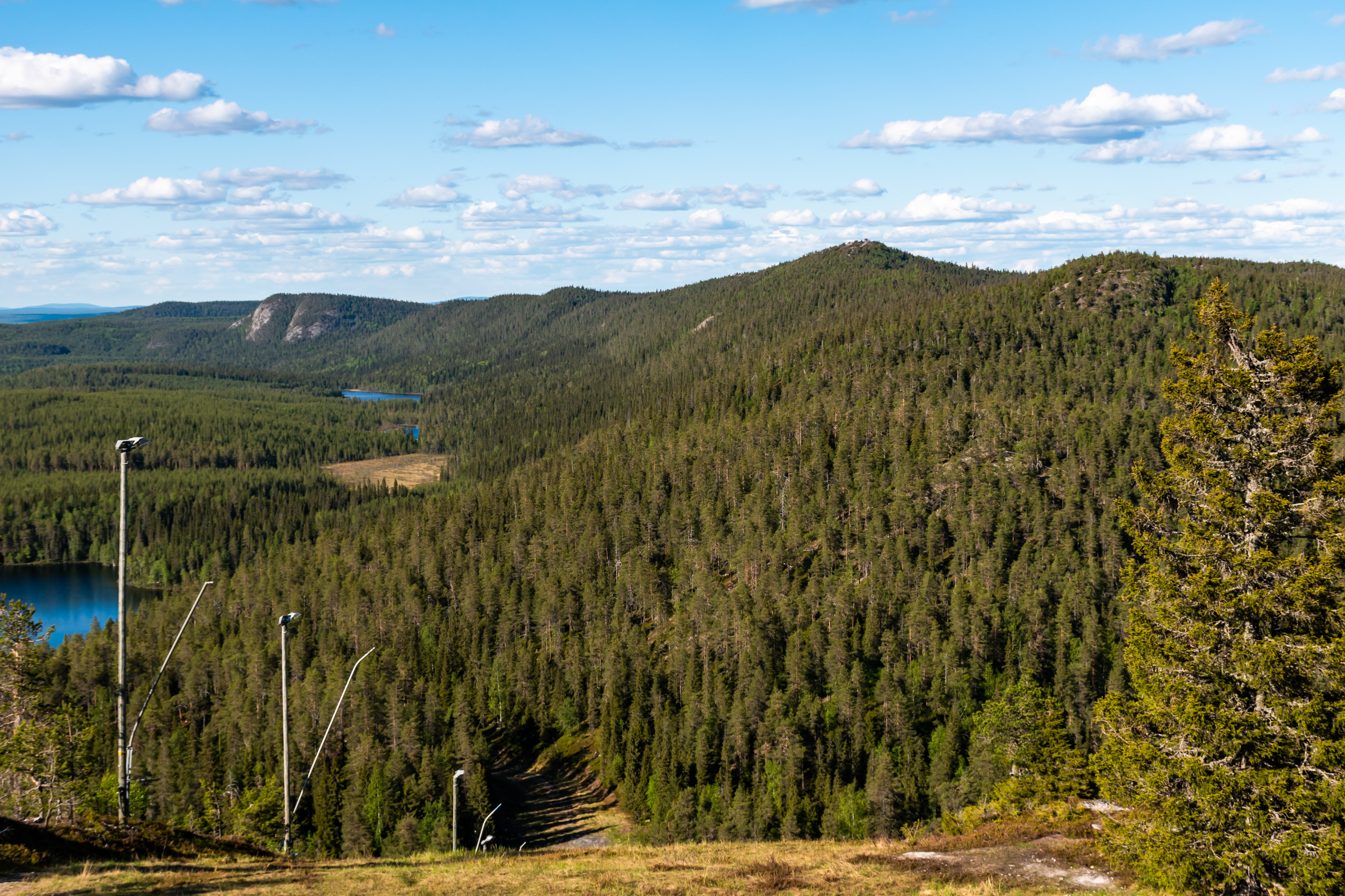 65. Вершина горы — на высоте 410 м над уровнем моря. На этой высоте лес уже начинает редеть, и виды отсюда неплохие; на юге видны следующие горы. Справа — Конттайнен, слева — Валтаваара, и на заднем плане выглядывает Рукатунтури с лыжными подъемниками.