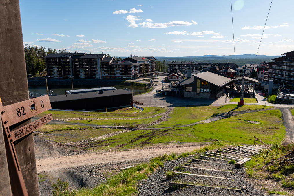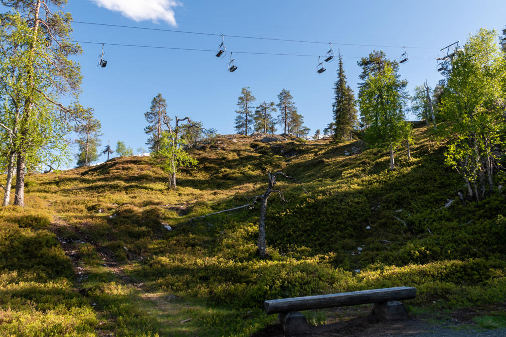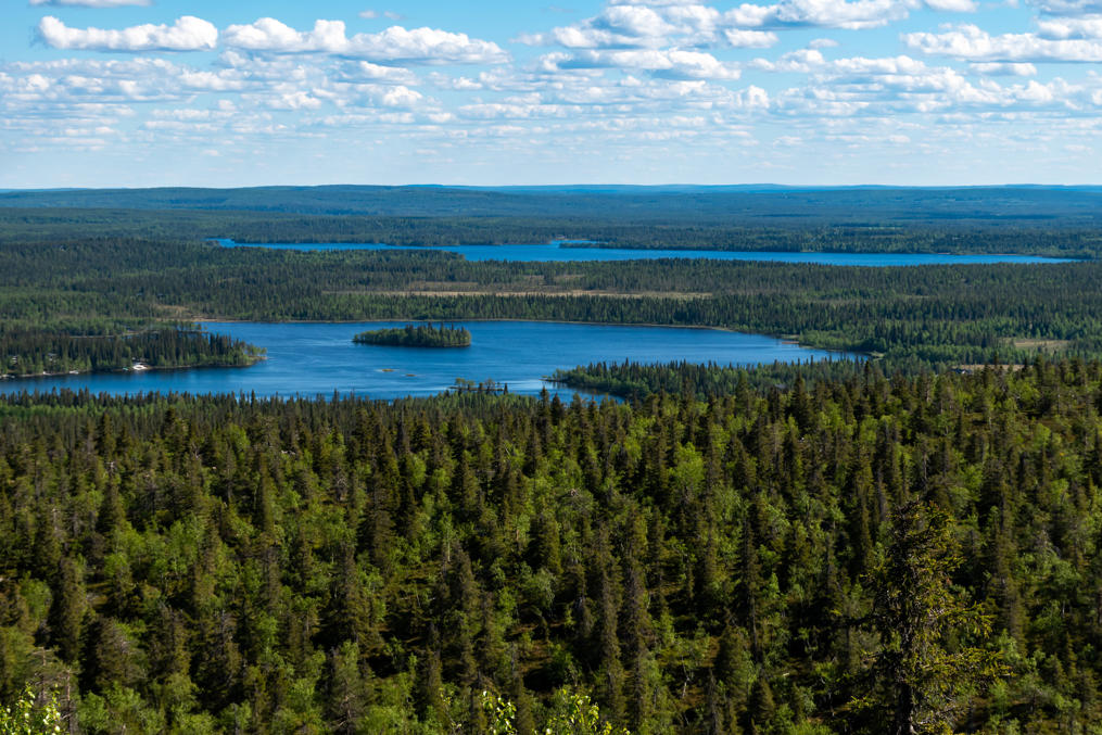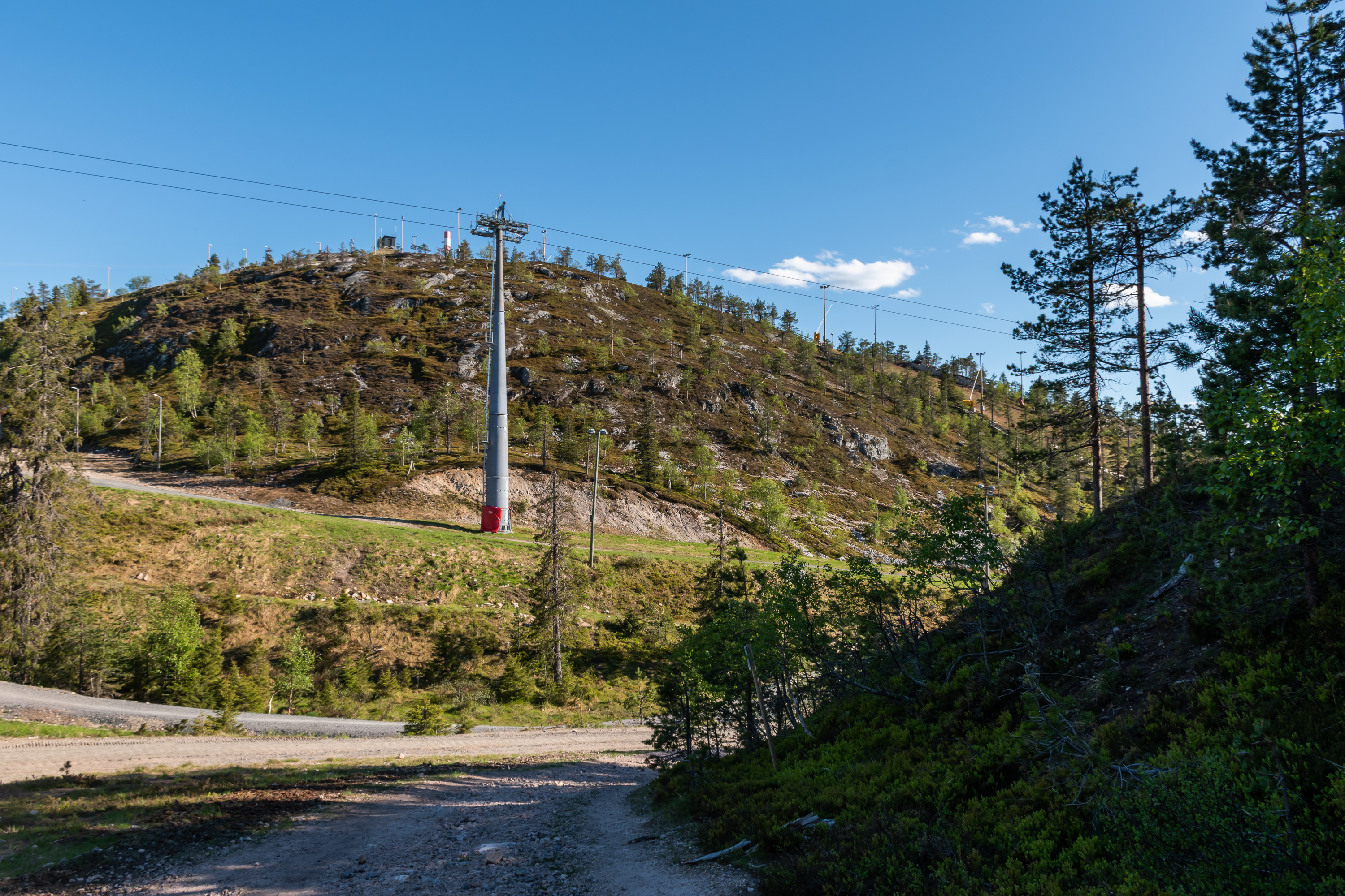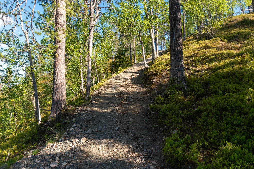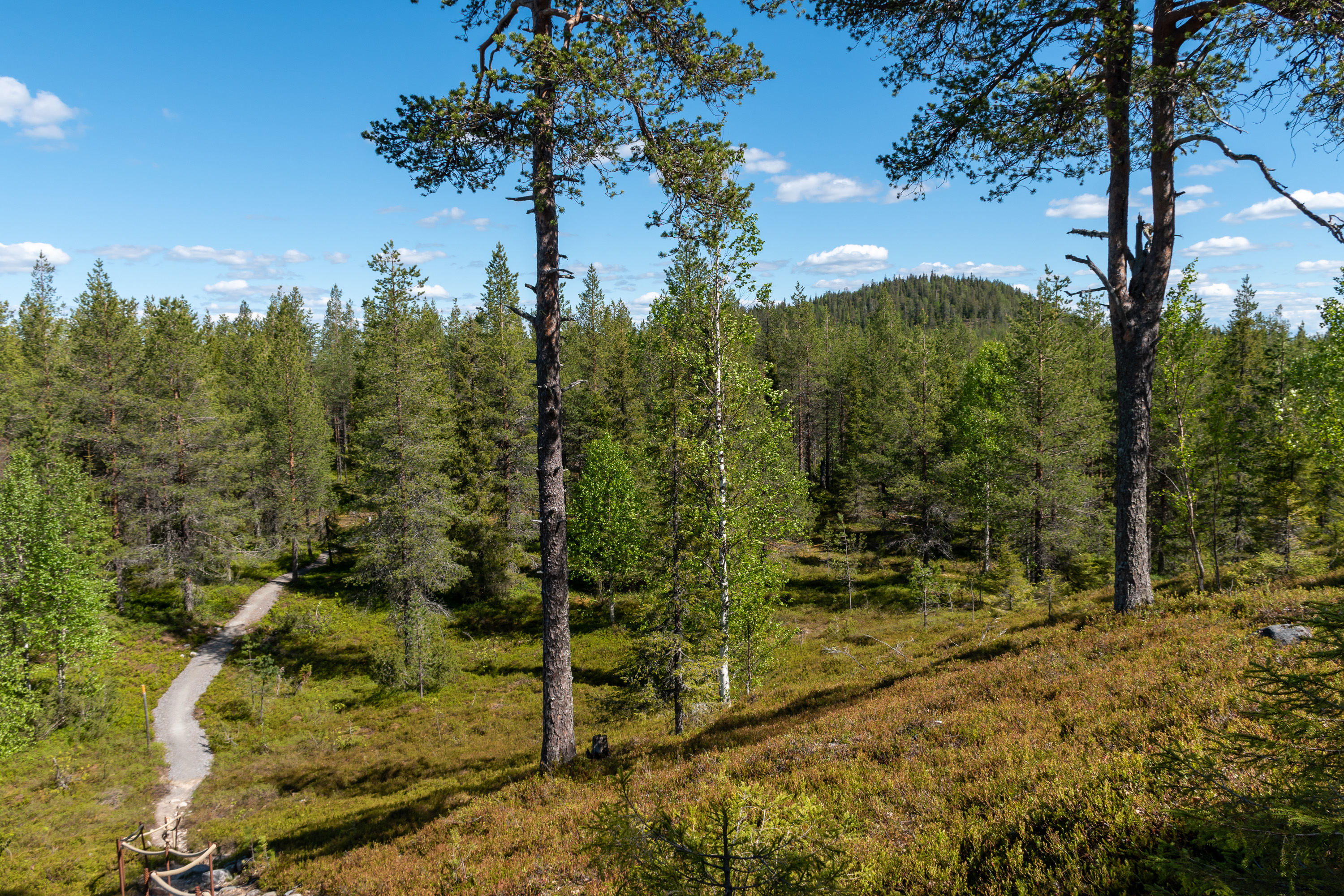 65. Вершина горы — на высоте 410 м над уровнем моря. На этой высоте лес уже начинает редеть, и виды отсюда неплохие; на юге видны следующие горы. Справа — Конттайнен, слева — Валтаваара, и на заднем плане выглядывает Рукатунтури с лыжными подъемниками.