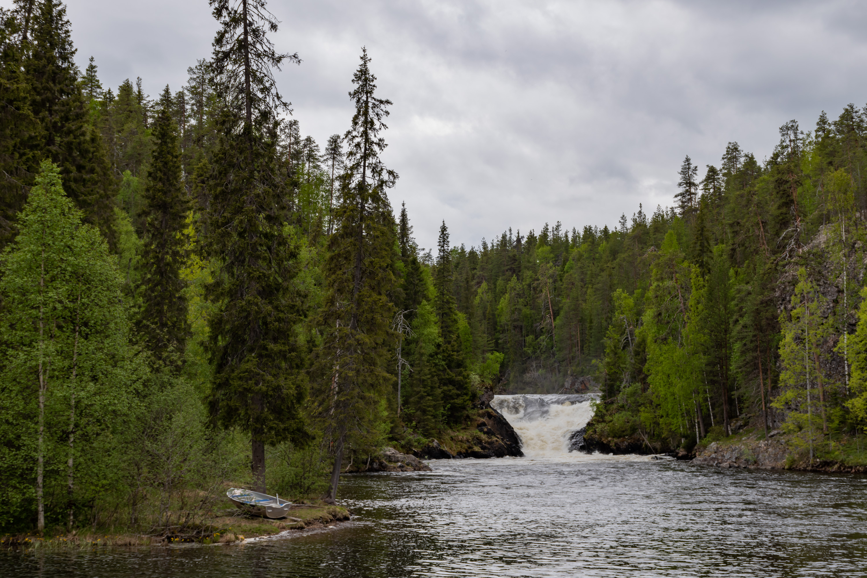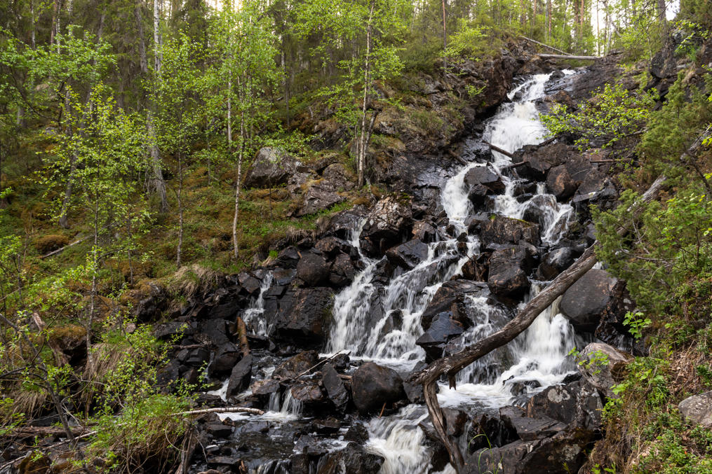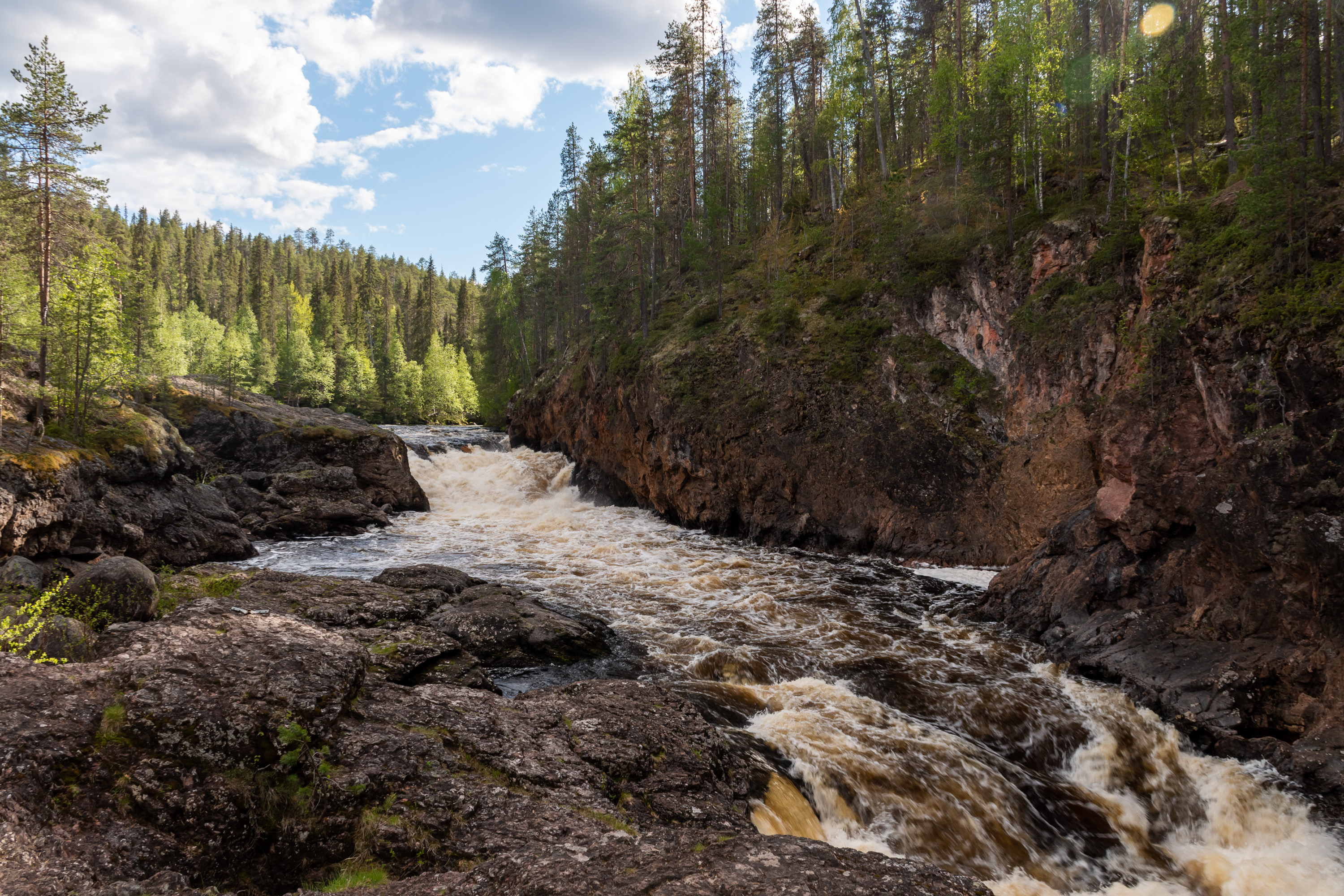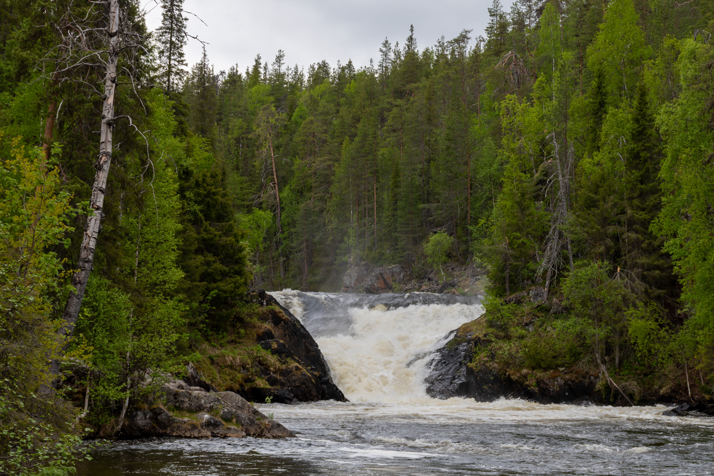 3. Киутакёнгяс (Kiutaköngäs) — даже не один водопад, а каскад из нескольких. С южного берега реки, где тропа, им можно полюбоваться от самой воды, а северный берег — высокая отвесная скала.