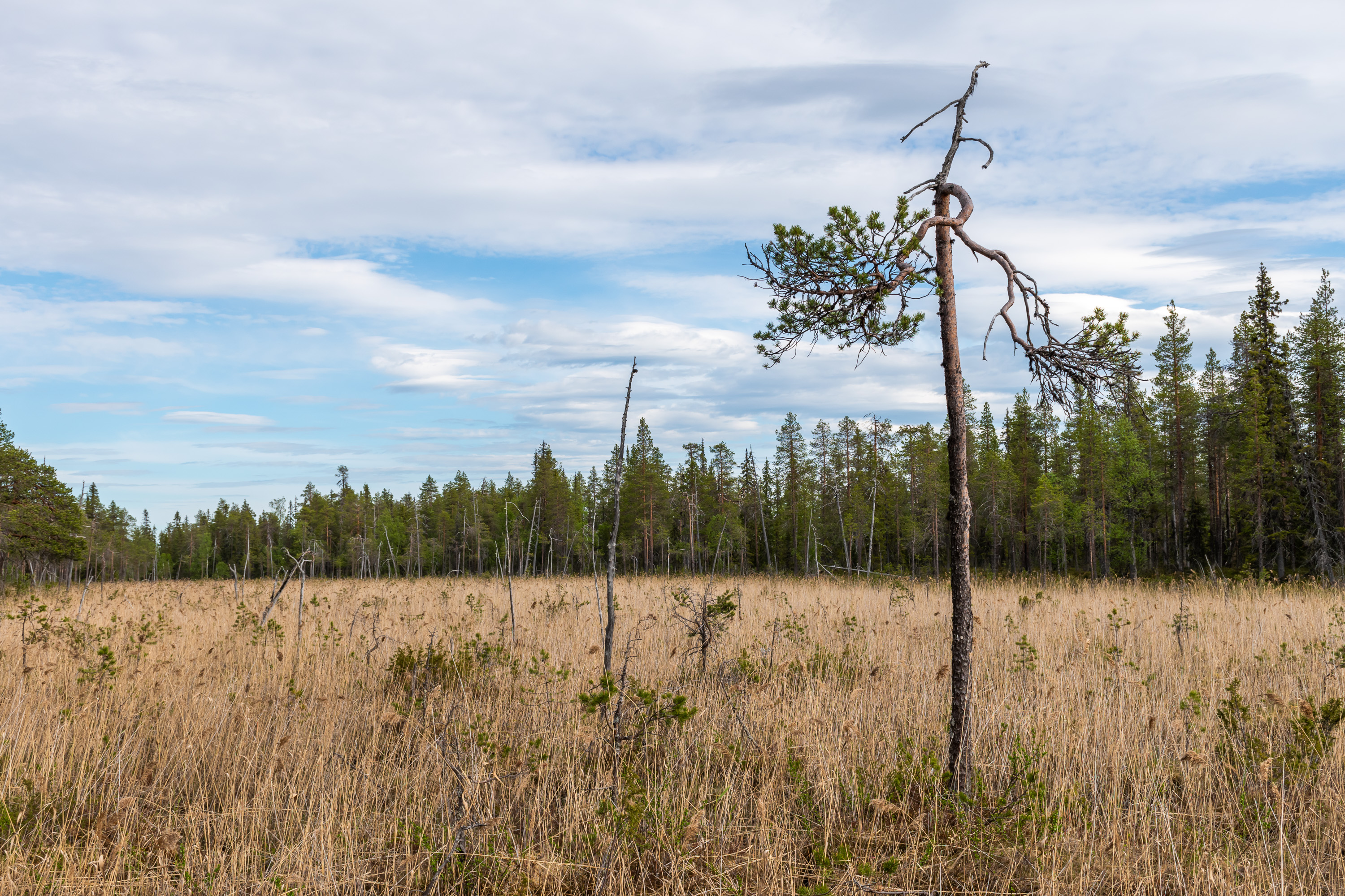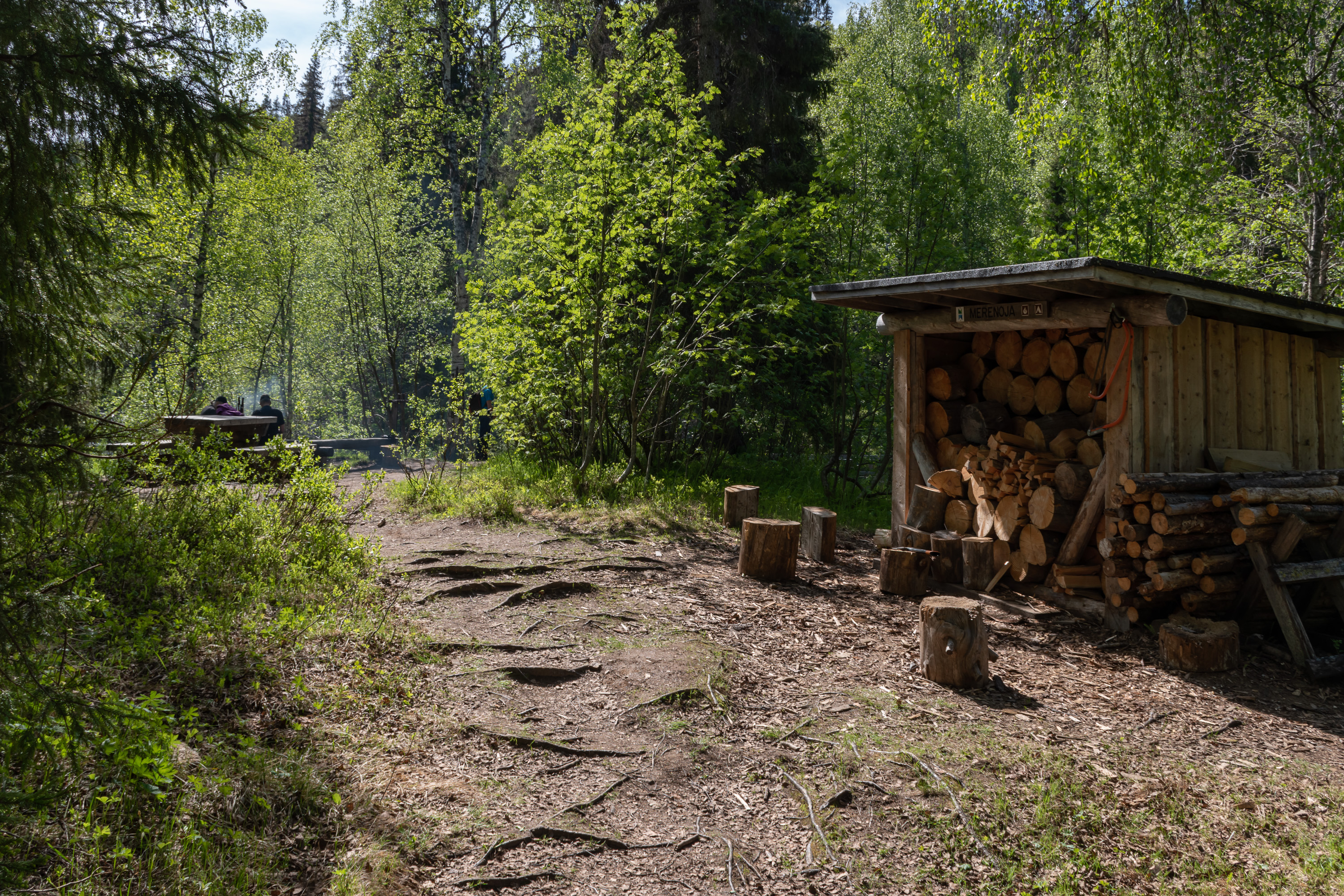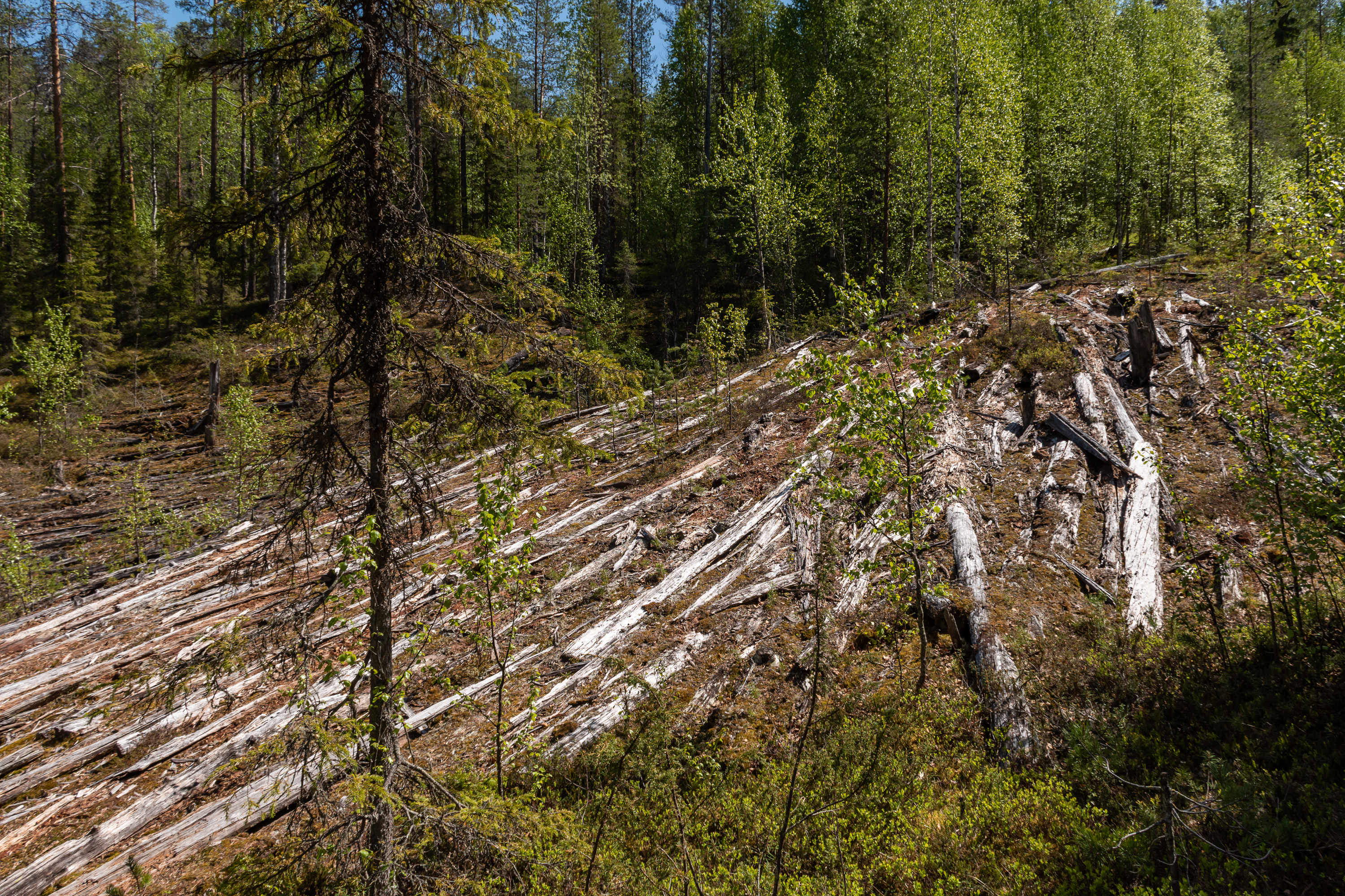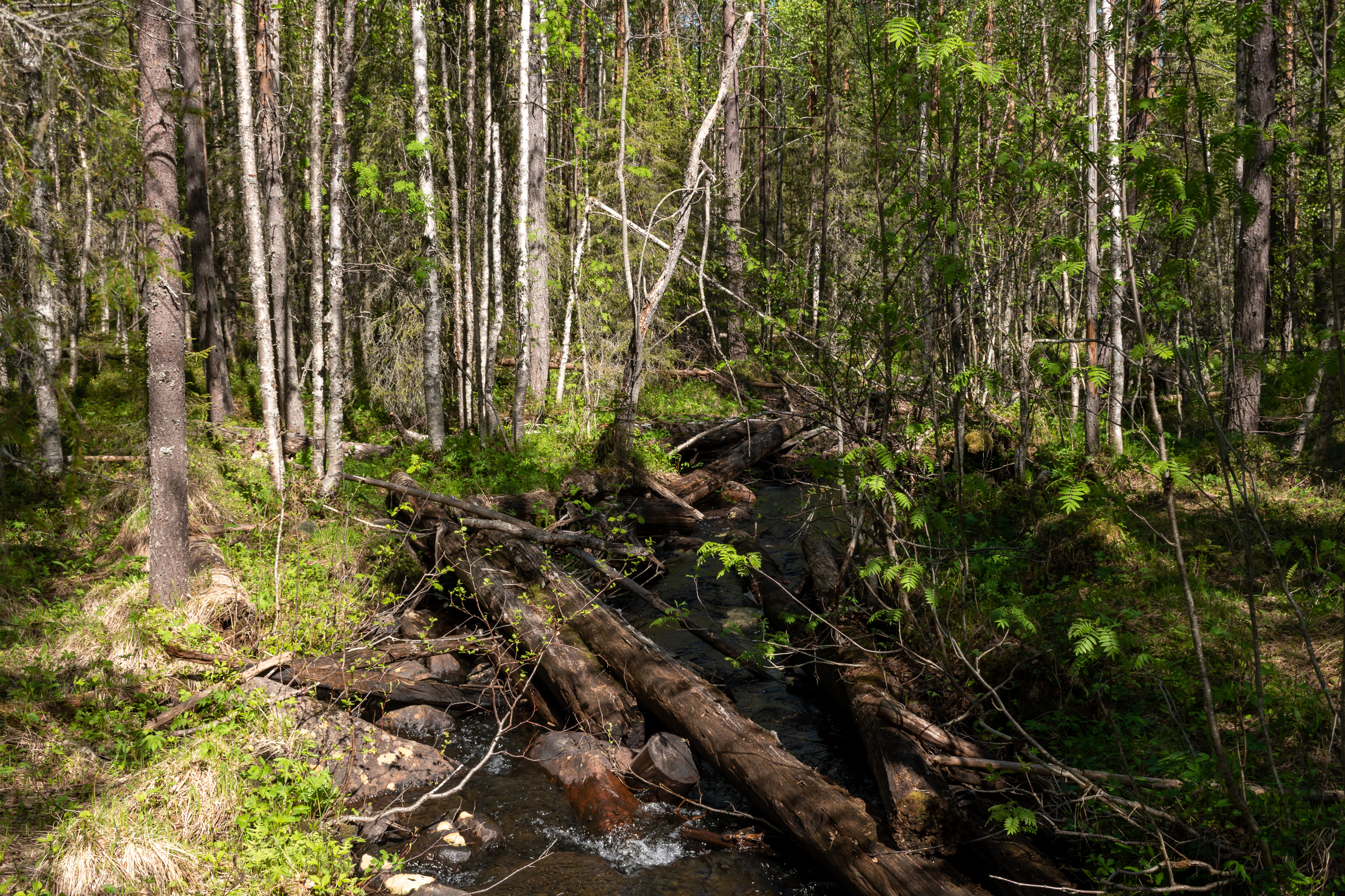 19. В месте для привала Кулмаккопуро (Kulmakkopuro) как раз после подъема хорошо передохнуть. Ручей Кулмаккопуро — весьма любопытное место: в его русле наблюдаются следы неудачного лесосплава. Лесосплав ранее практиковали и в таких мелких ручьях — это было возможно только с помощью временных плотин, и только во время весеннего половодья. Как уже упоминалось раньше, в начале 20 века в этих местах рубили лес и сплавляли на сторону России, но вот через этот ручей сплавлять не получилось, в нем все-таки оказалось недостаточно воды. Бревна застряли в русле — и так с тех пор по сей день и лежат, даже не особо-то и сгнили за век.