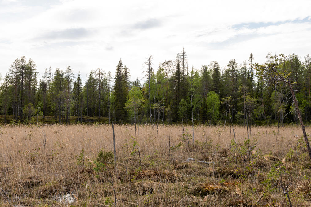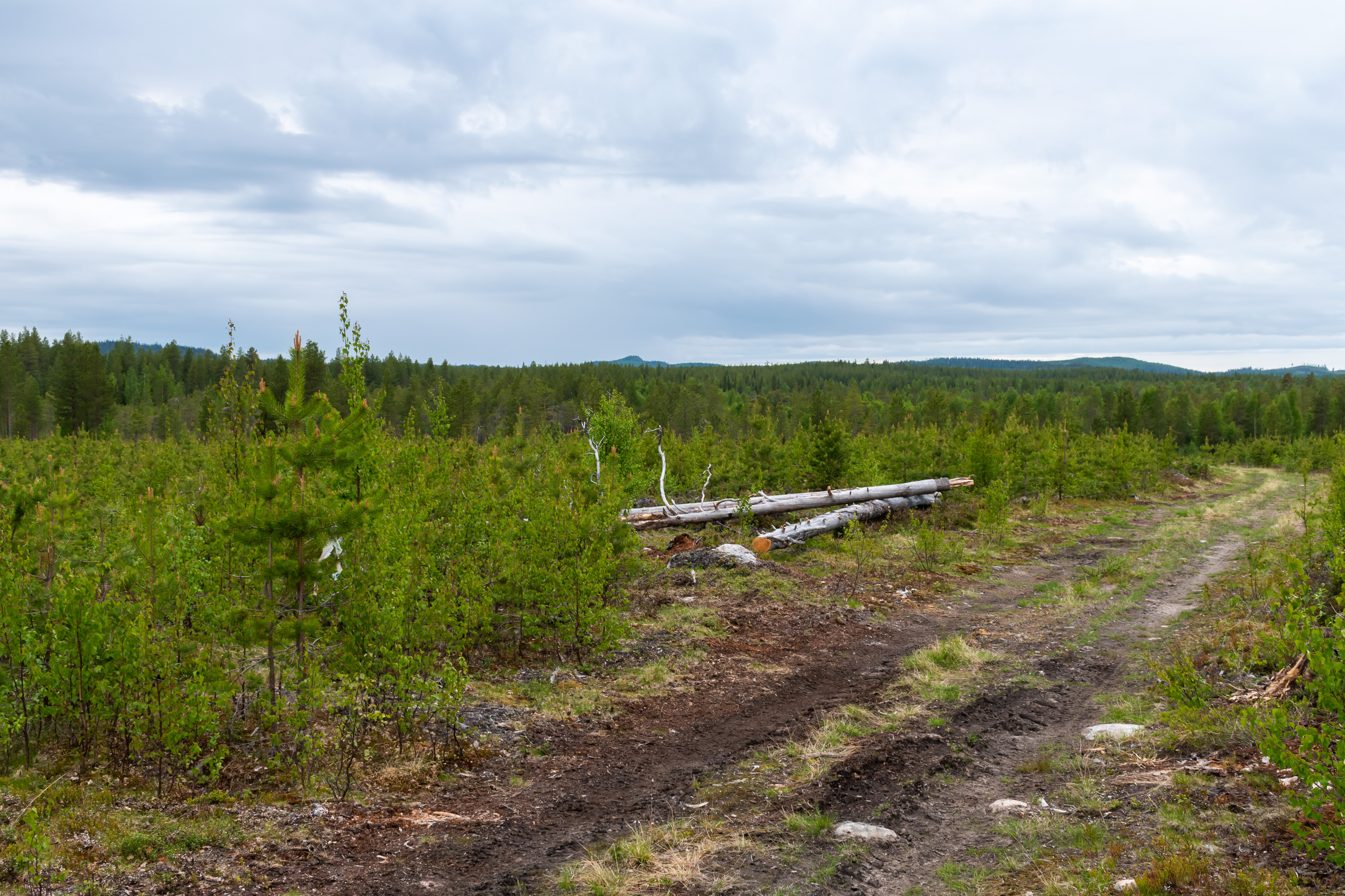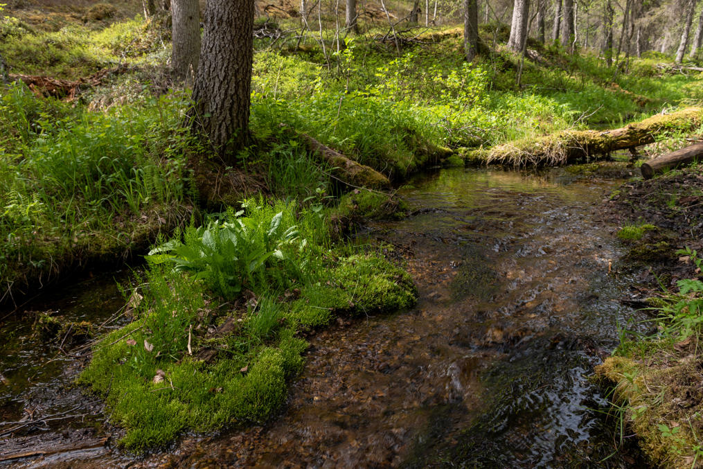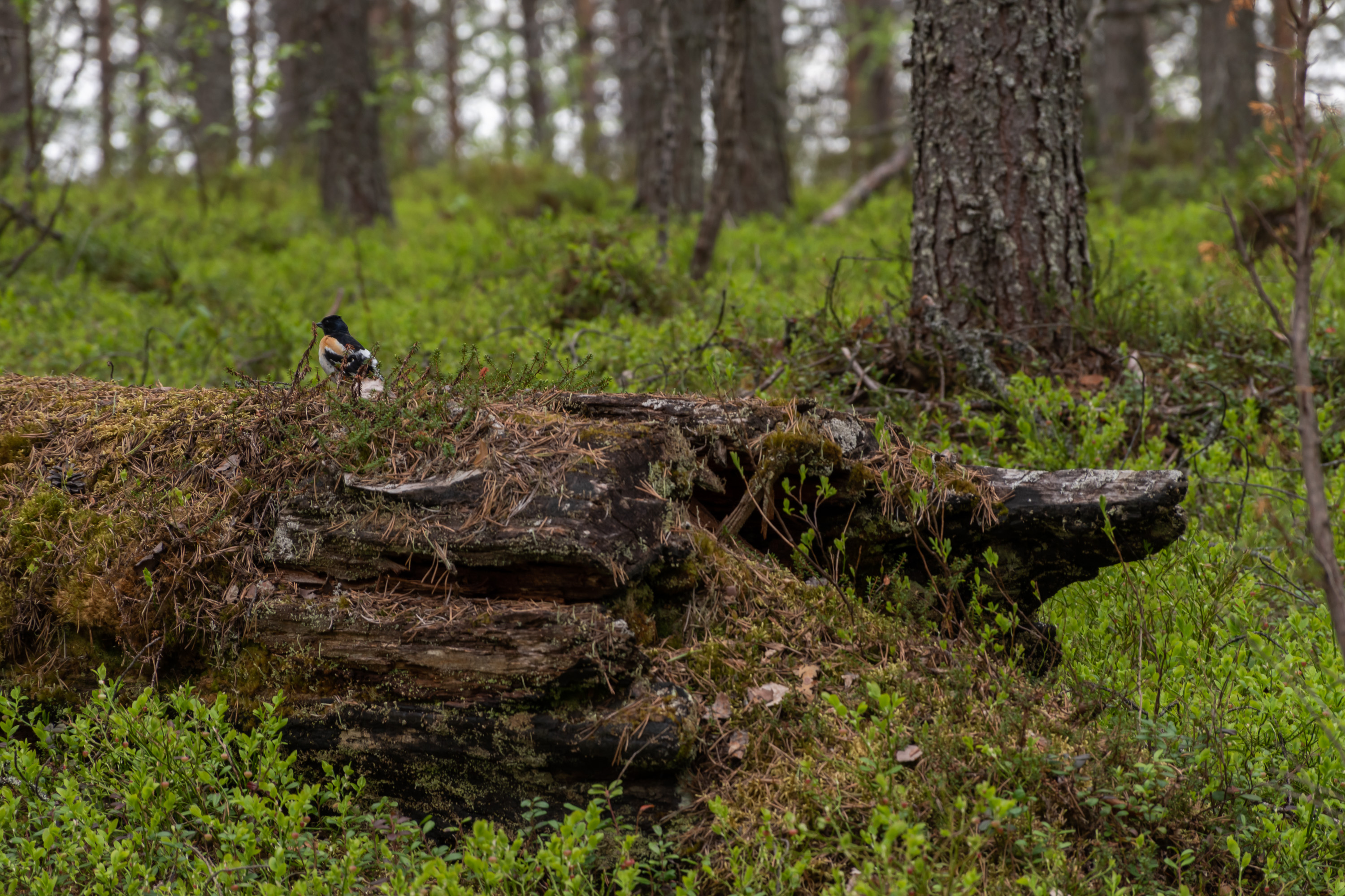 19. В месте для привала Кулмаккопуро (Kulmakkopuro) как раз после подъема хорошо передохнуть. Ручей Кулмаккопуро — весьма любопытное место: в его русле наблюдаются следы неудачного лесосплава. Лесосплав ранее практиковали и в таких мелких ручьях — это было возможно только с помощью временных плотин, и только во время весеннего половодья. Как уже упоминалось раньше, в начале 20 века в этих местах рубили лес и сплавляли на сторону России, но вот через этот ручей сплавлять не получилось, в нем все-таки оказалось недостаточно воды. Бревна застряли в русле — и так с тех пор по сей день и лежат, даже не особо-то и сгнили за век.