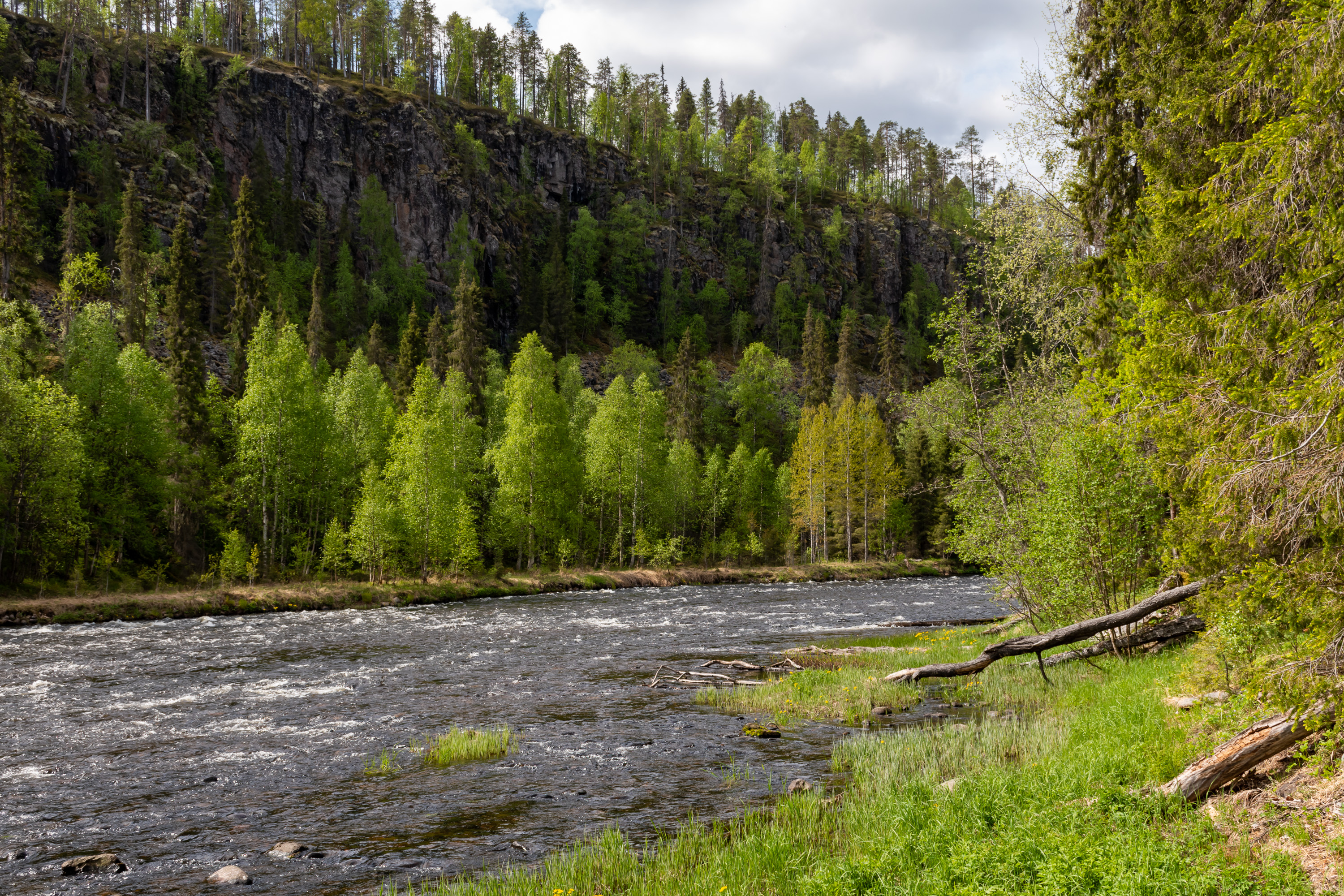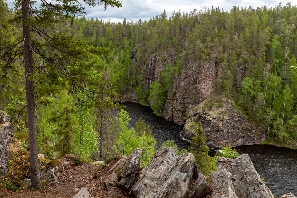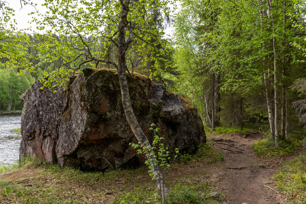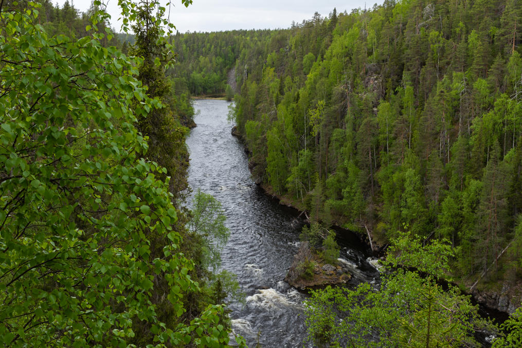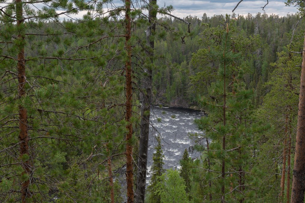 32. Киткайоки течет меж крутых скал. Лучший вид на реку, по идее, открывается со скалы Пяхкянянкаллио (Pähkänänkallio), но официальной тропы туда нет, а табличка запрещает передвижение в том месте вне троп с апреля по середину августа (там какие-то птицы гнездуются). Это новое ограничение, с этого года только появилось.