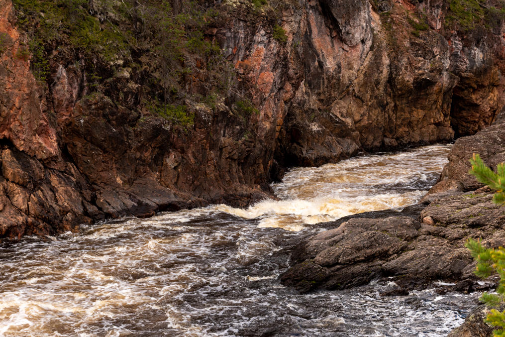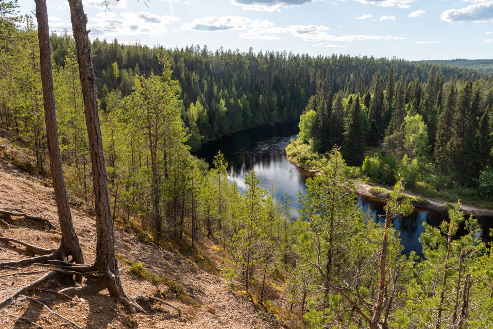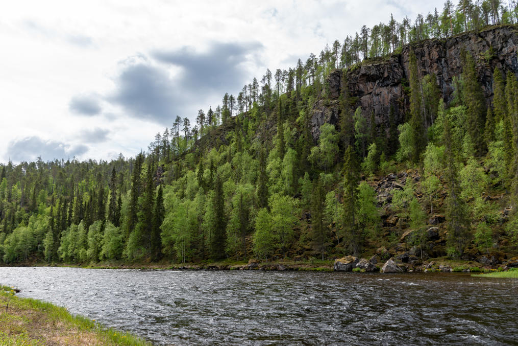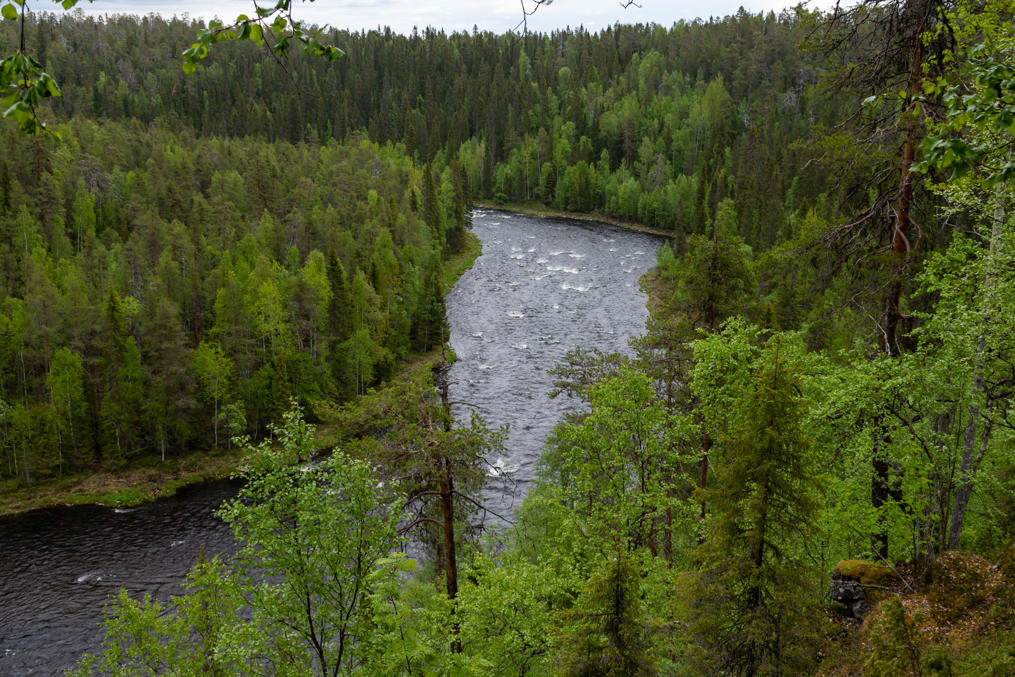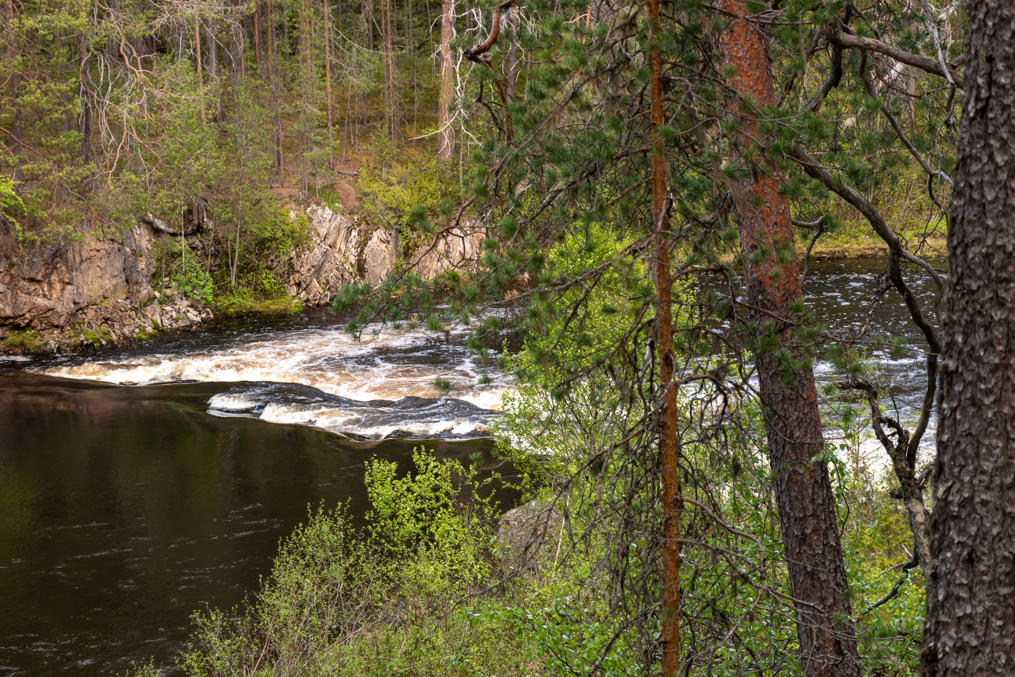 32. Киткайоки течет меж крутых скал. Лучший вид на реку, по идее, открывается со скалы Пяхкянянкаллио (Pähkänänkallio), но официальной тропы туда нет, а табличка запрещает передвижение в том месте вне троп с апреля по середину августа (там какие-то птицы гнездуются). Это новое ограничение, с этого года только появилось.