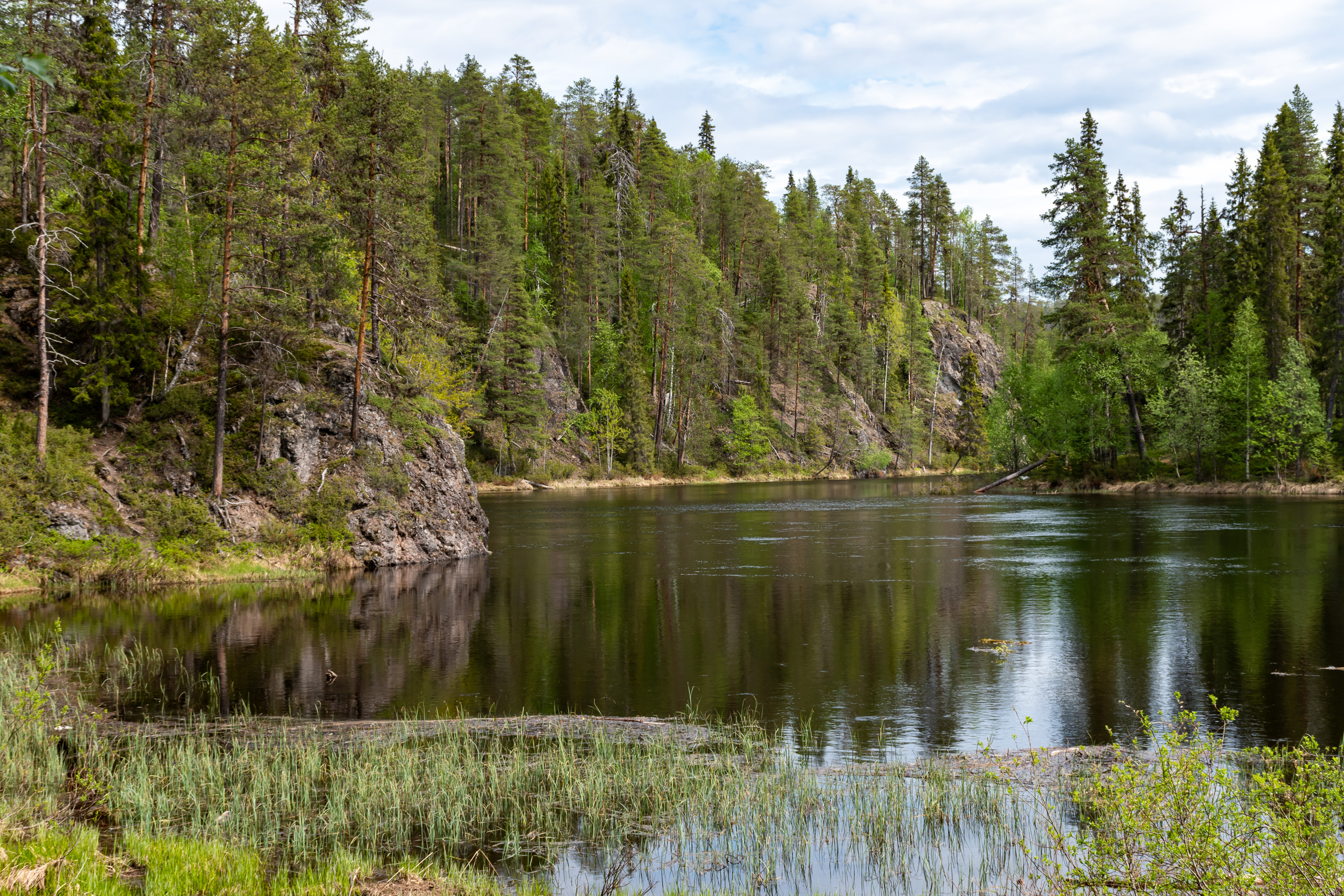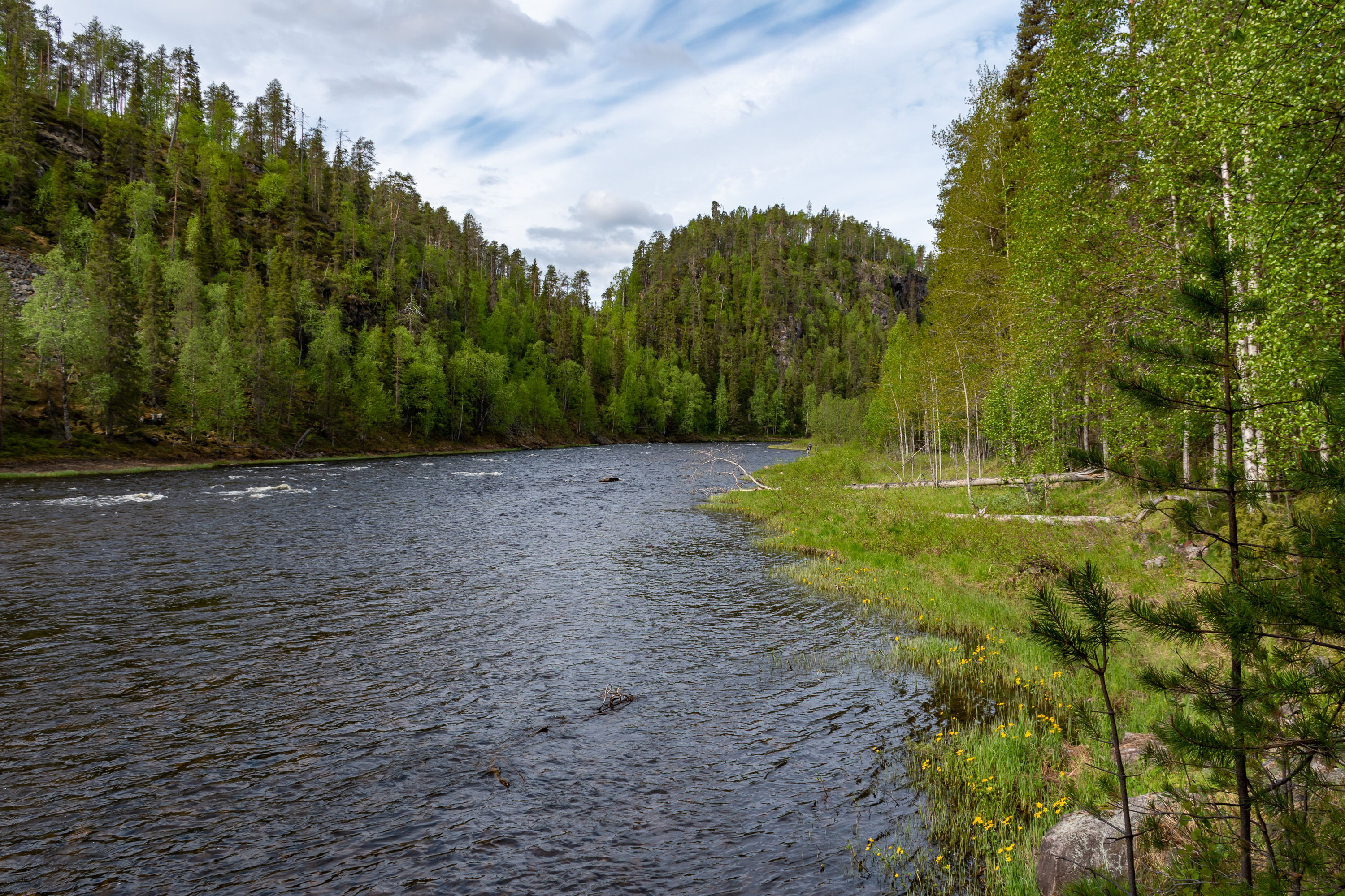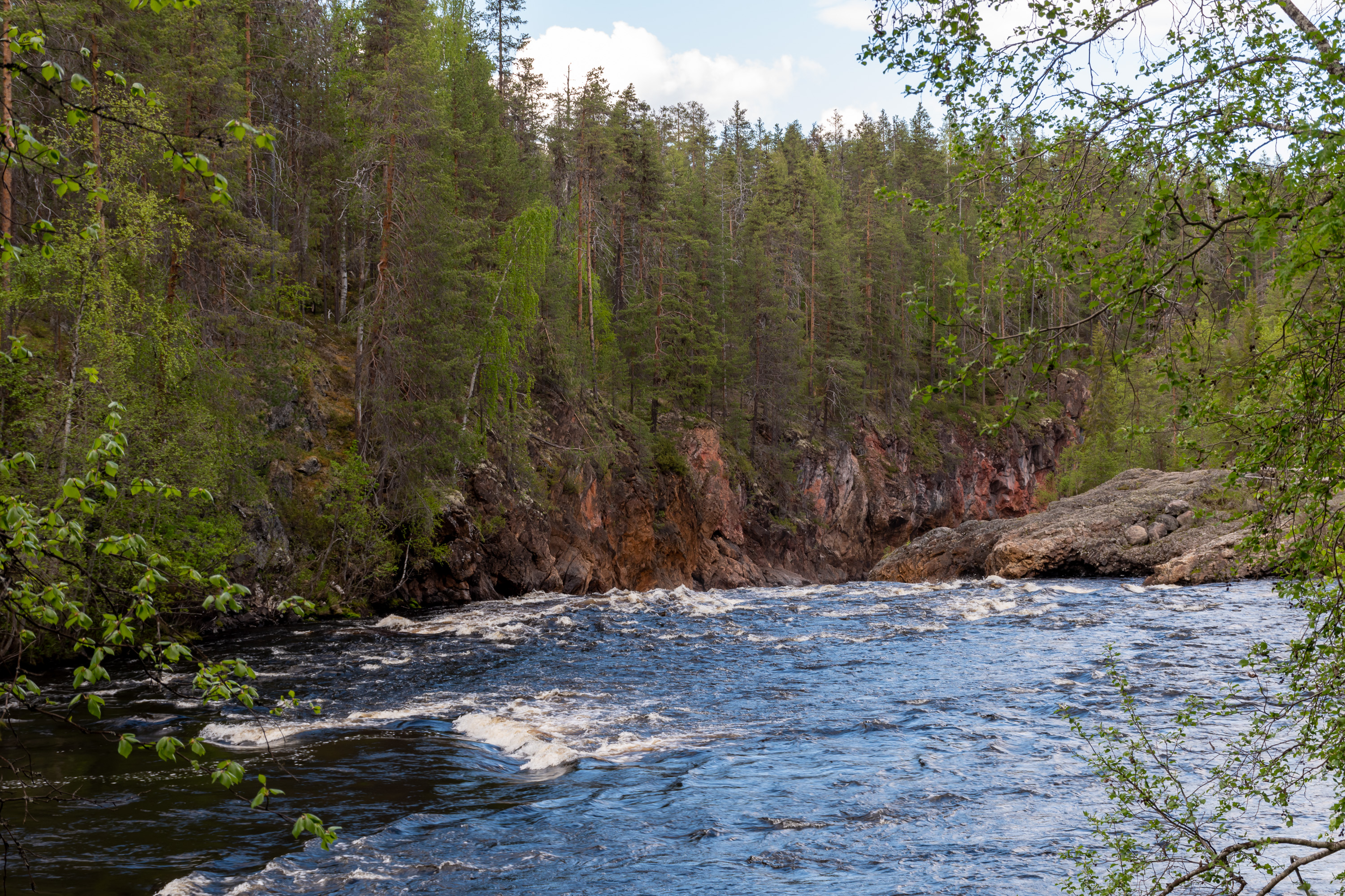 36. В отличие от многих других рек Северной Финляндии, Киткайоки и Оуланкайоки (и почти все их притоки) сумели избежать строительства ГЭС. Общественная кампания за спасение этих рек, так называемая война за пороги Куусамо (Kuusamon koskisota), под предводительством местного писателя и журналиста Рейно Ринне (Reino Rinne), шла в 1950-60-х и в конце концов увенчалась успехом. Если бы здесь построили ГЭС, все водопады тут были бы уничтожены — как они уже и так уничтожены почти везде в Финляндии, по крайней мере вблизи от цивилизации — и на этом национальный парк и Медвежье кольцо в принципе можно было бы и закрывать, какая Оуланка без водопадов?